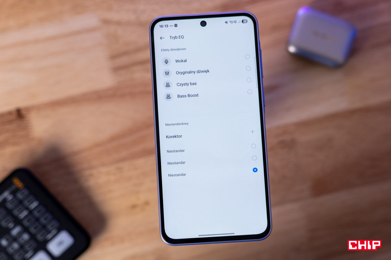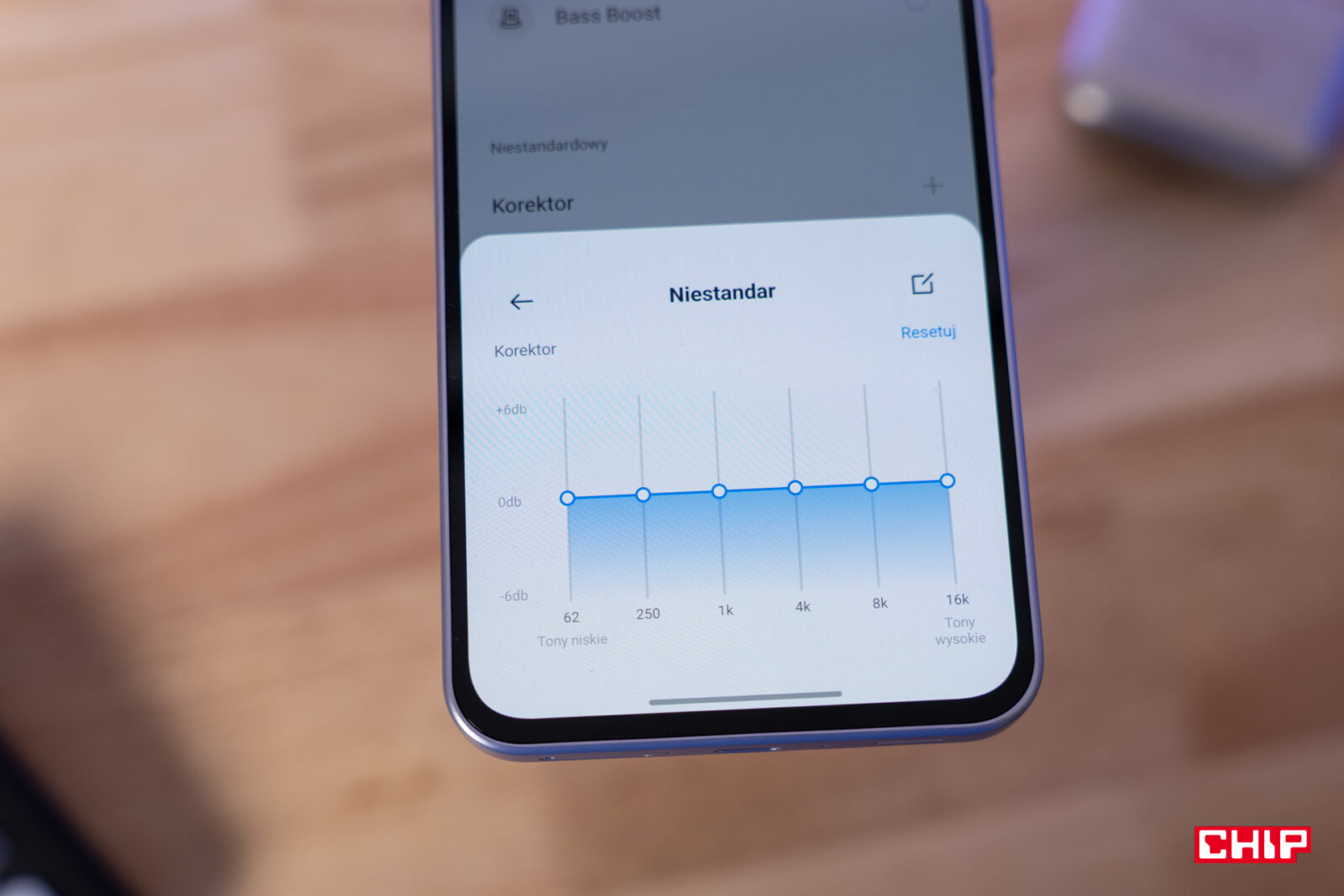 Następna zakładka to pomieszanie z poplątaniem. Z jednej strony otrzymujemy ustawienie o nazwie “dźwięk dynamiczny”, które pozwala zmieniać ilość tonów wysokich, średnich i niskich. Zakres zmian nie jest jednak jakoś nadmiernie odczuwalny. To jednak nie wszystko, bo z drugiej strony czeka na nas “tryb EQ” czyli korektor graficzny, który posiada kilka presetów (bas, wokal i oryginalny dźwięk), ale i możemy utworzyć własne ustawienia. Wtedy otrzymujemy sześć częstotliwości do regulowania głośności między +6dB a -6dB. Zastanawiam się, czy nie lepiej byłoby po prostu nauczyć odbiorców korzystania z korektora graficznego, zwłaszcza, że to on daje znacznie bardziej dopasowane zmiany.