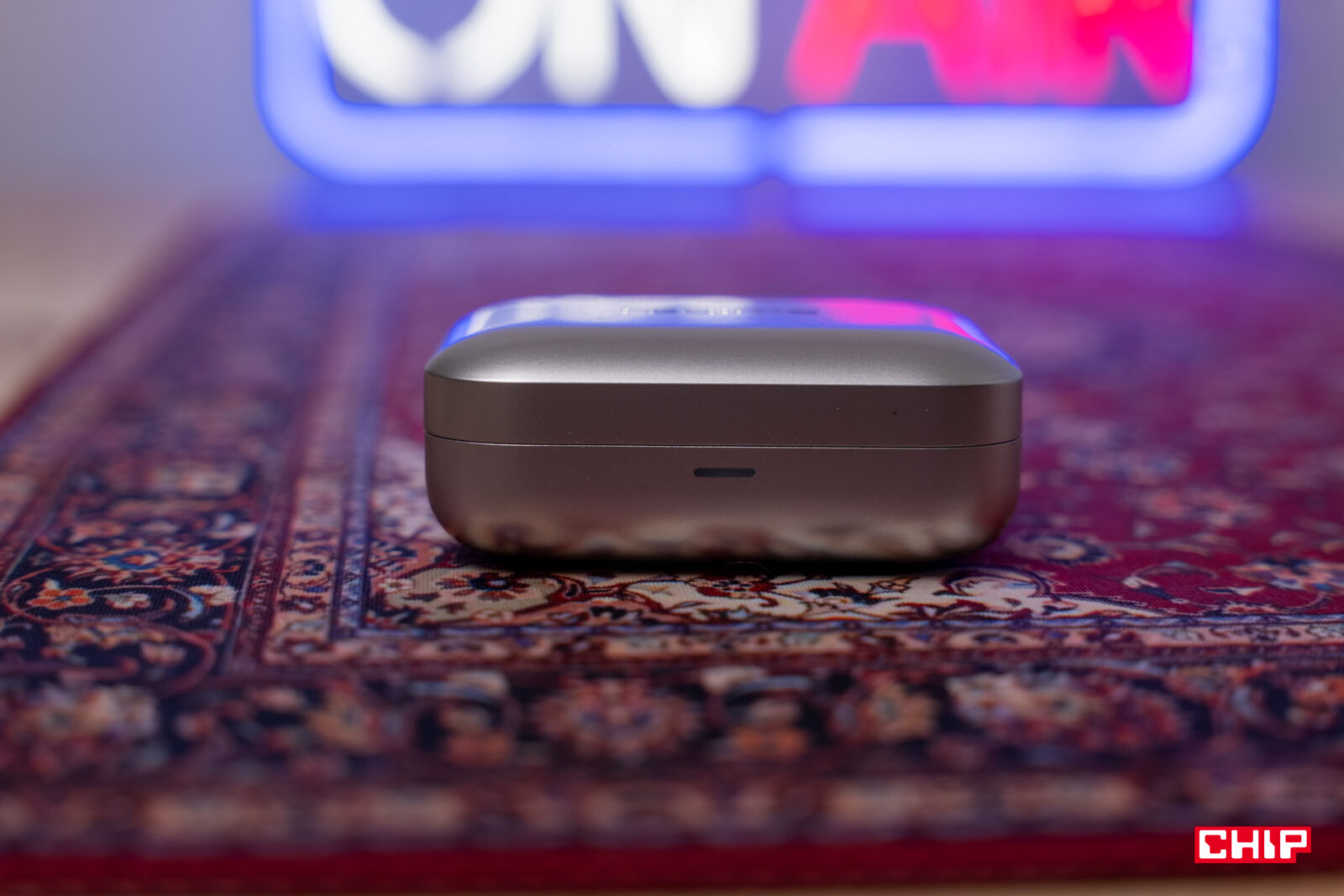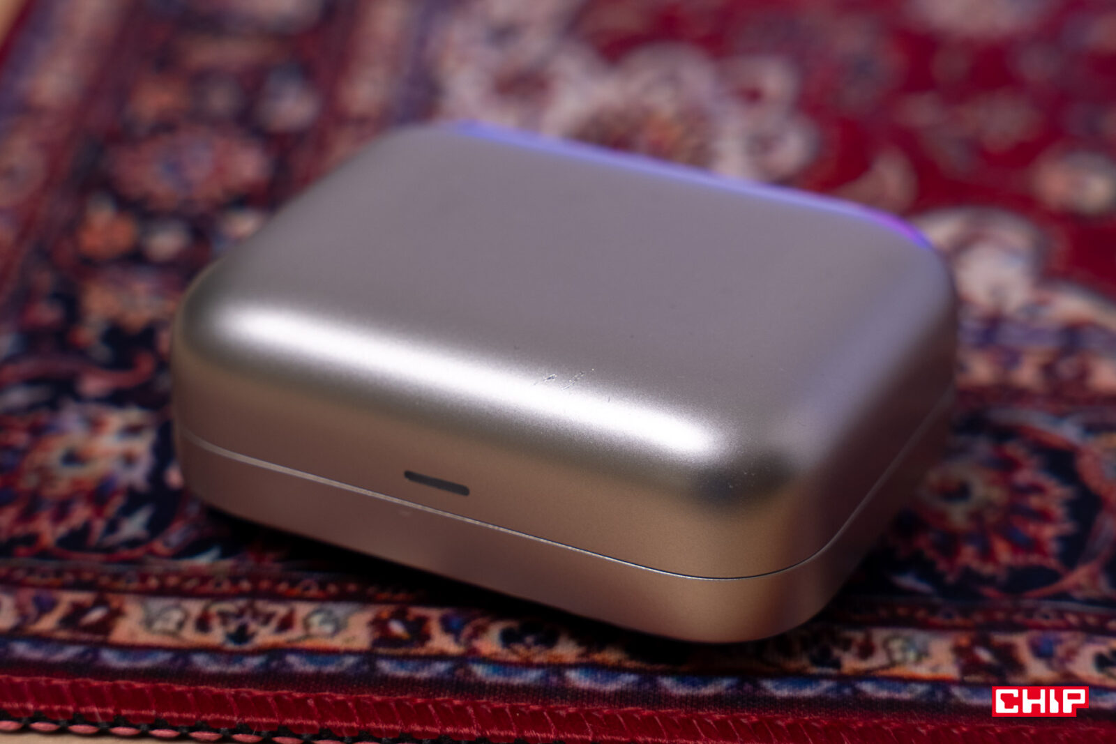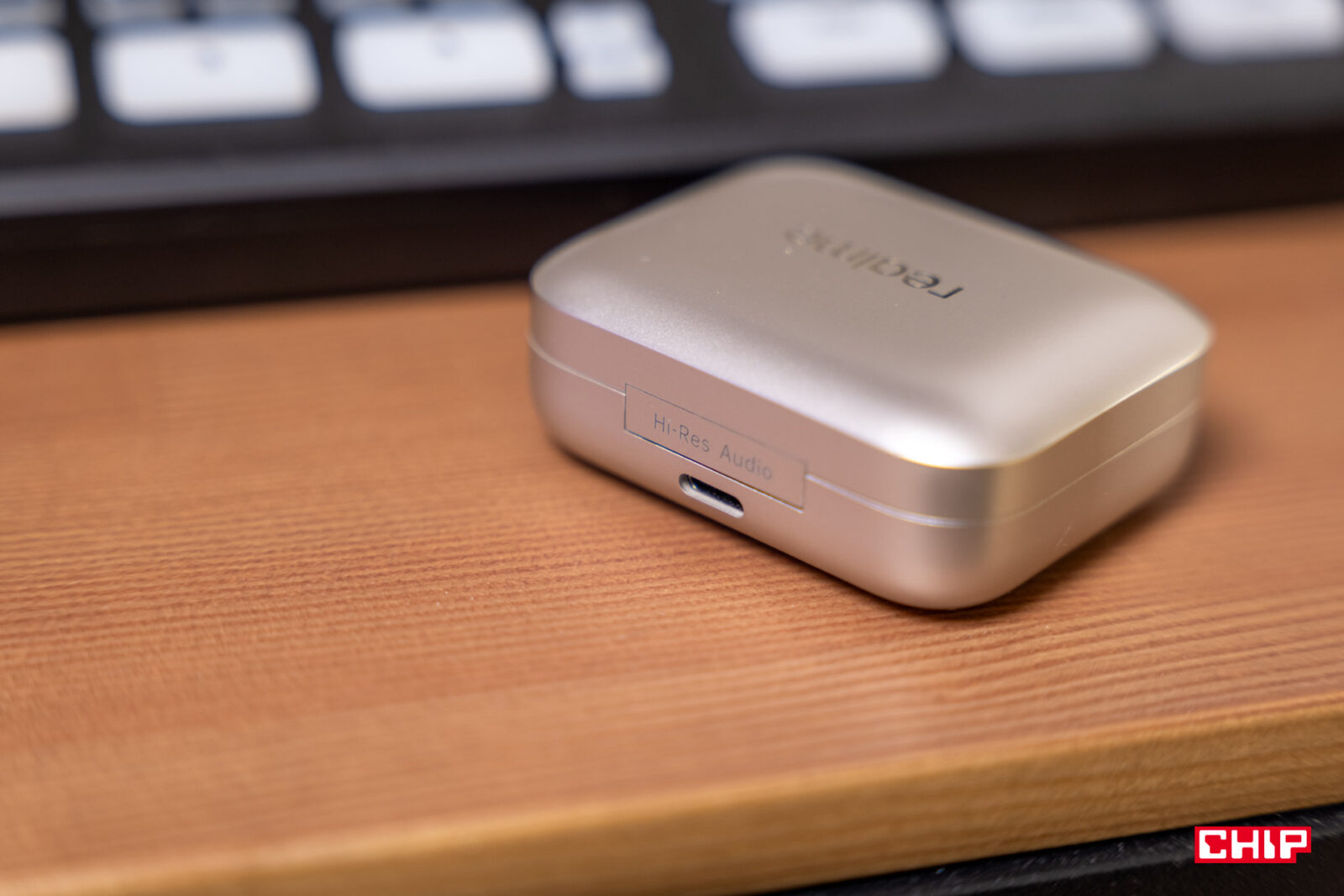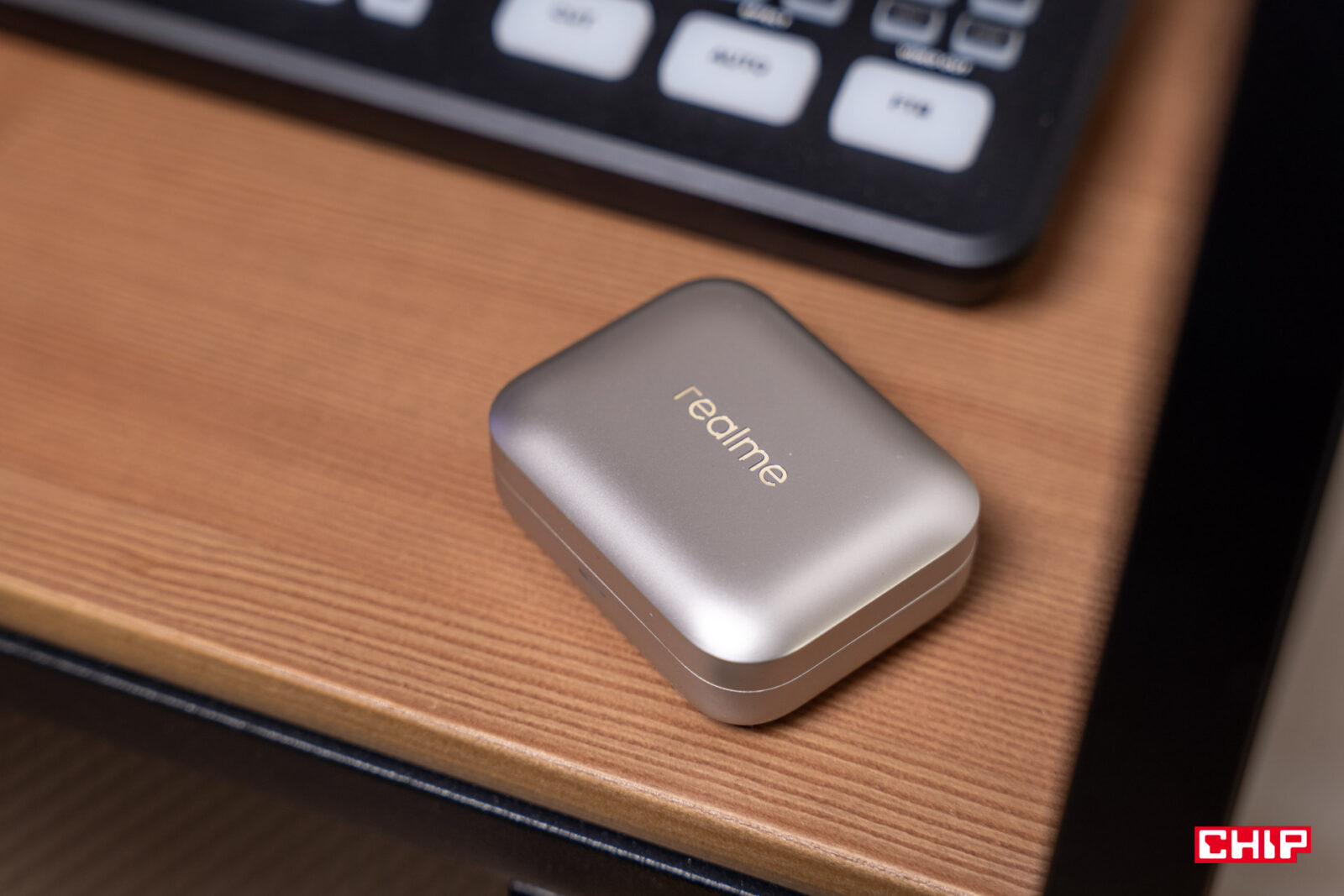 Od obudowy słuchawek bezprzewodowych oczekuję tego, bym nie musiał na nią po kilku tygodniach lub miesiącach zakładać etui. Niestety, taki ruch byłby wskazany w przypadku realme Buds Air7. Plastikowe pudełeczko zostało wykonane ze starannością, ale nie z materiałów, które mogłyby je uchronić przed rysami przy upadku z wysokości biurka. W dodatku jego mocno zaoblone krawędzie już po miesiącu zaczynają gromadzić ślady. Szczęśliwie na potrzeby testów otrzymałem wariant z nieprzezroczystą klapką, co z pewnością nie będzie uwidaczniało to mocno rys na froncie. W wariancie w kolorze białego złota wyciśnięto logo realme, które przy bliższym spojrzeniu widzimy rysy.