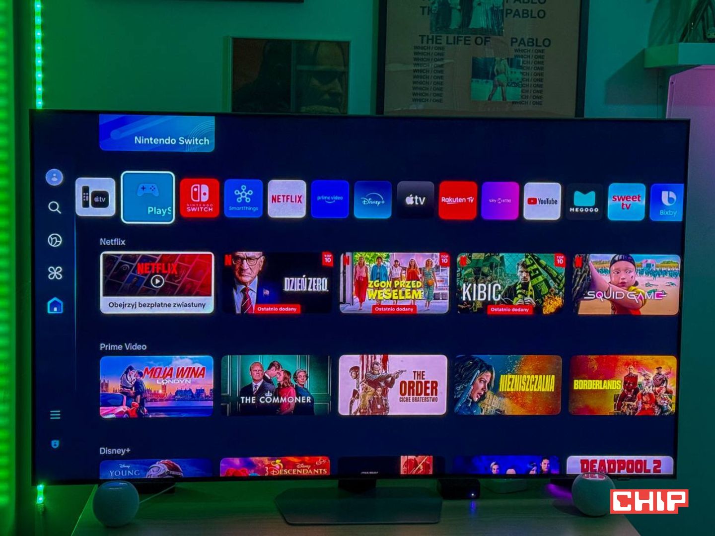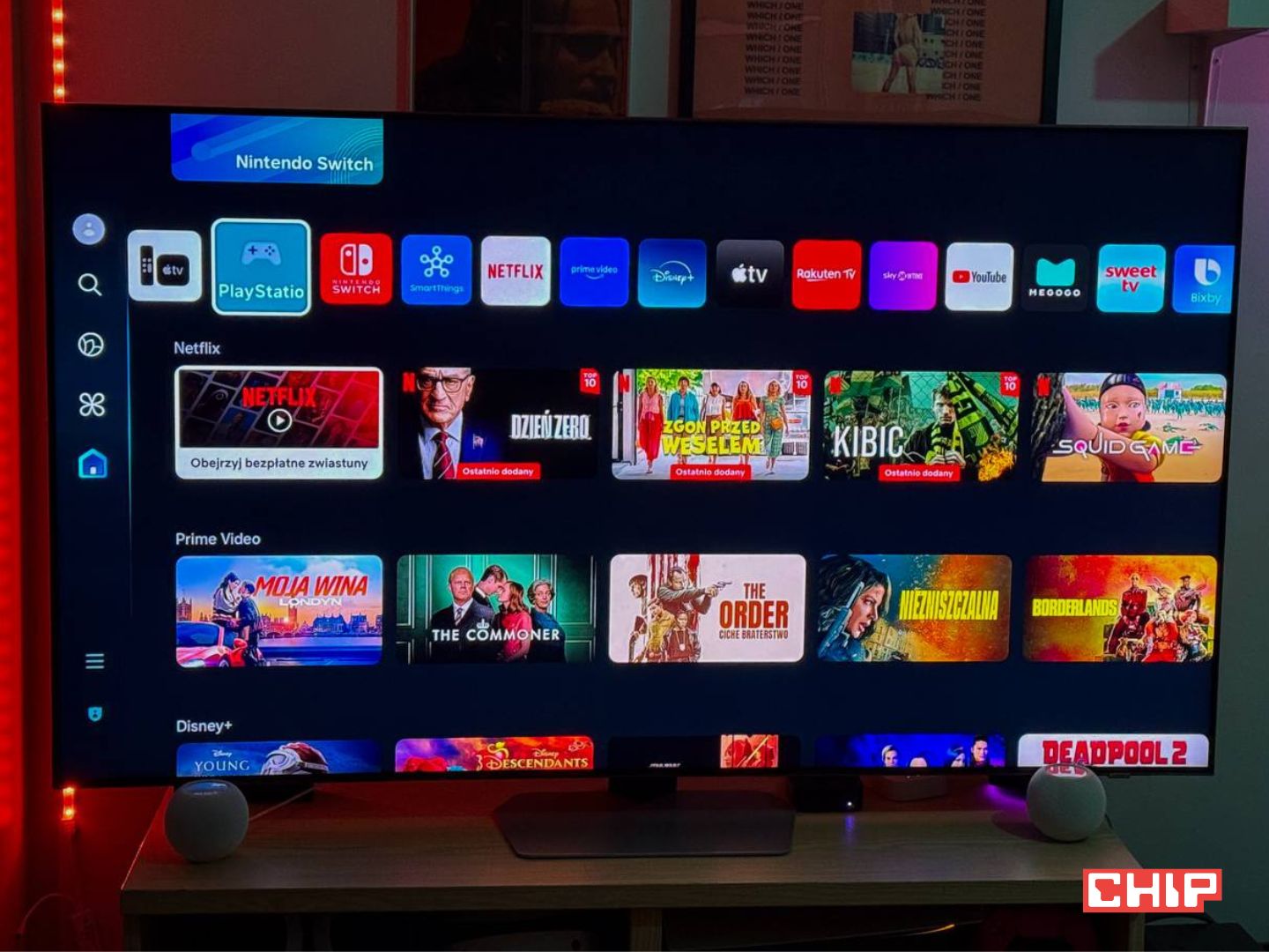 Jasność tego telewizora sięga nawet 2000 nitów, co w połączeniu z głębokim kontrastem robi wrażenie. Do tego QN90D obsługuje HDR10, HDR10+ i HLG, choć stały u koreańskiej firmy brak Dolby Vision może być rozczarowaniem. Audio? System 4.2.2 o mocy 70 W z Dolby Atmos i Object Tracking Sound+ sprawia, że dźwięk otacza nas z każdej strony. Chociaż ja sam korzystam raczej z nagłośnienia stworzonego z dwóch HomePodów połączonych z Apple TV, to audio z samego telewizora robi wrażenie i na małym metrażu daje bardzo zbliżony efekt. Naprawdę na jakość dźwięku z tego telewizora trudno narzekać.