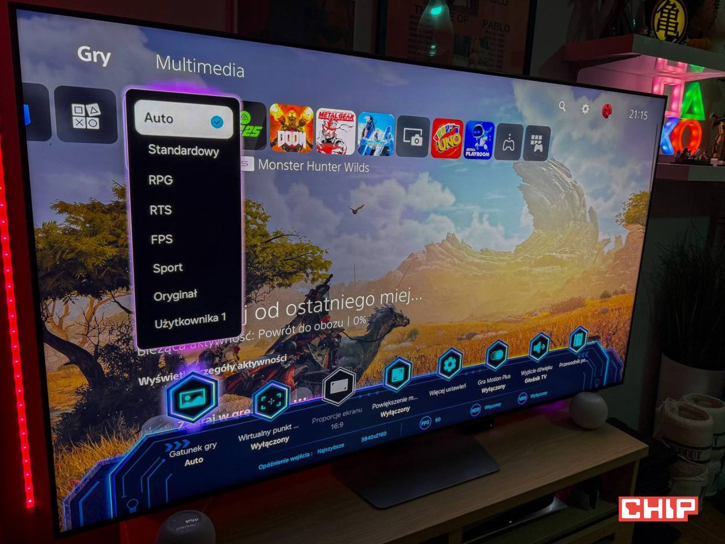 Testowanie możliwości Samsunga QN90D zbiegło się w czasie z premierą Monster Hunter Wilds — najnowszej odsłony serii, która słynie z otwartej przestrzeni i dynamicznych walk. Obraz w 4K był ostry, a kolory, szczególnie w gęstych dżunglach czy podczas imponujących walk na wielkich pustyniach, miały sporo życia — zielone liście i błyszczące łuski potworów wyglądały wyraziście, a płynność gry również nie była najgorsza; tutaj jedynym ograniczeniem było zwykłe PS5 zamiast wersji Pro, a nie telewizor.