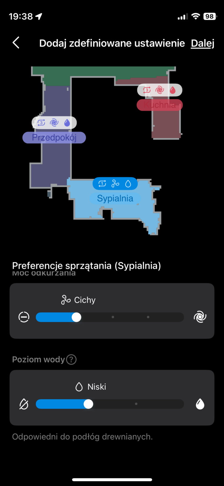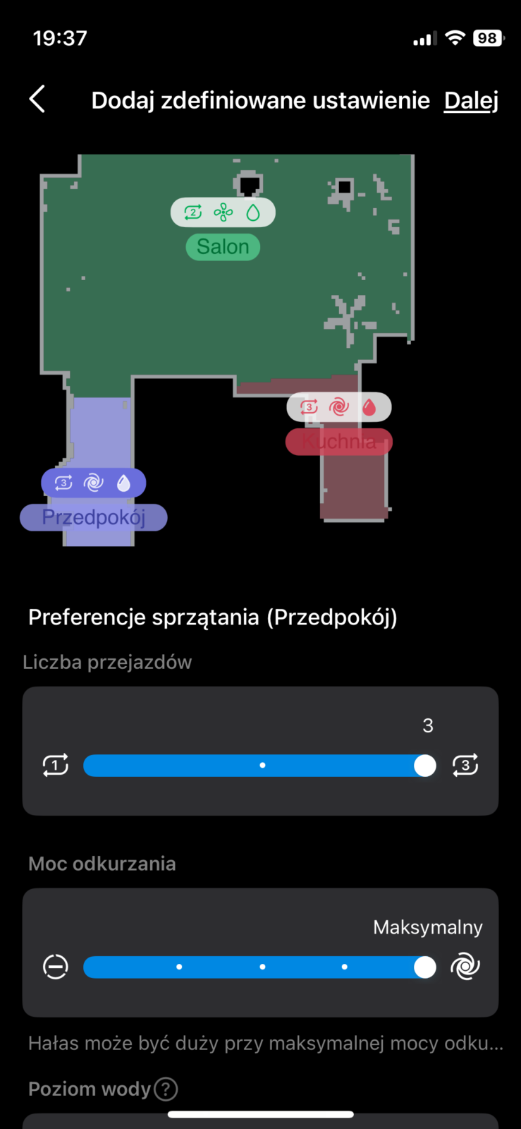 Dla robota można przygotować programy sprzątania, zawierające kolejność sprzątanych pomieszczeń, liczbę „przejazdów”, moc ssania oraz ilość używanej wody. Jeśli zaplanowane zostały 2 lub 3 sprzątania danego pomieszczenia, robot będzie jeździł „w kratkę”, co uważam za ogromną zaletę – być może najważniejszą na liście plusów robota sprzątającego Tapo RV30 Max Plus.