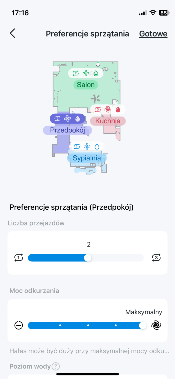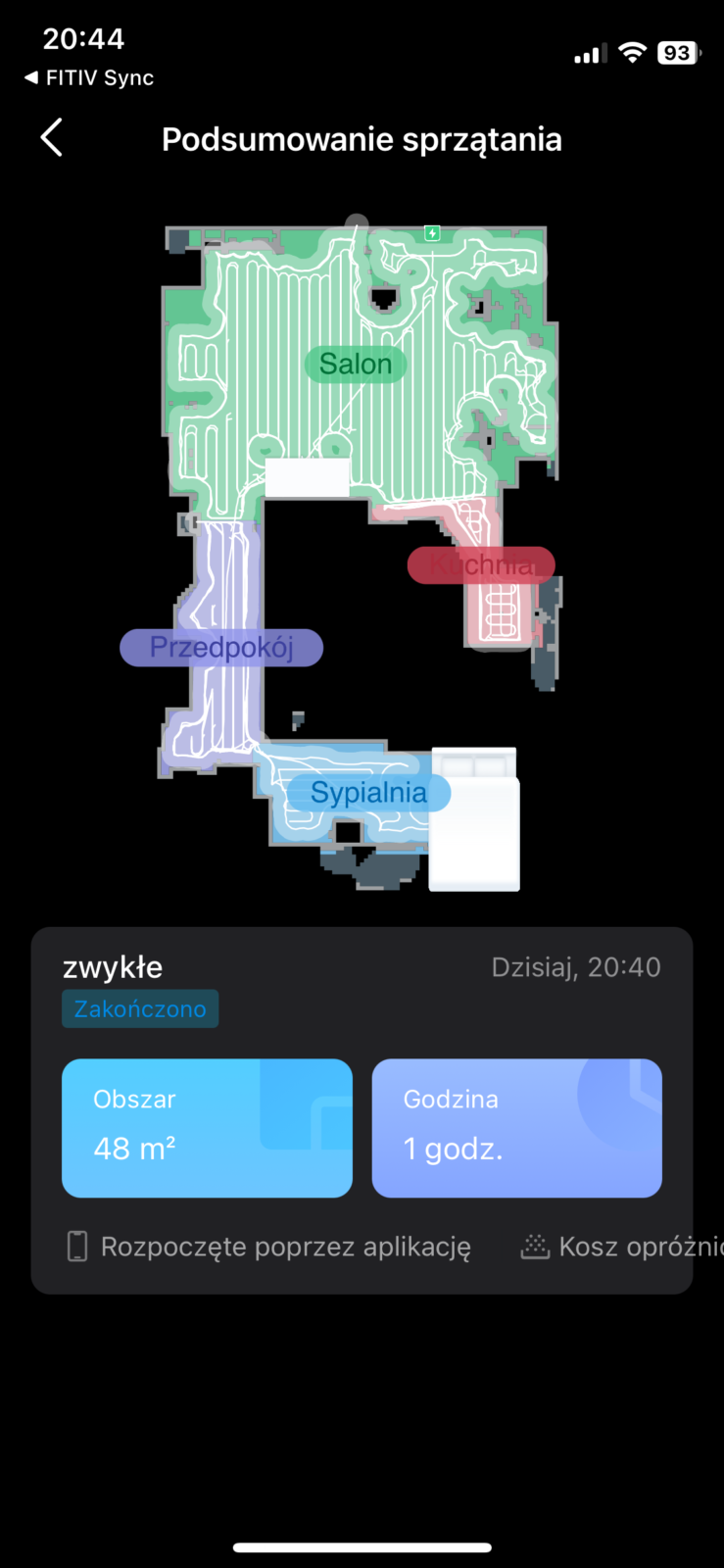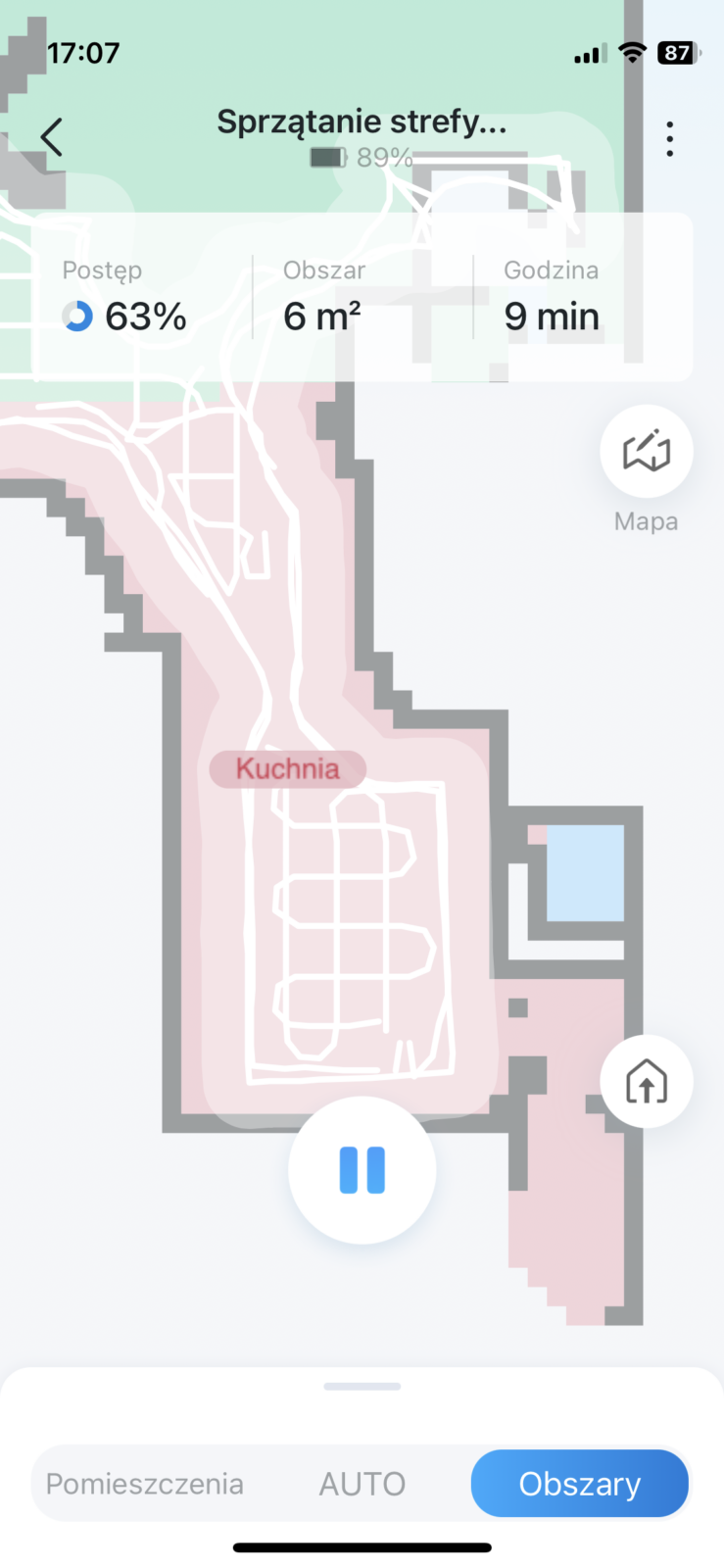 W aplikacji mobilnej przygotowałam kilka schematów sprzątania na różne okazje: codzienny przejazd po całym mieszkaniu, który uruchamiany jest z harmonogramu, kilkukrotne mycie przedpokoju i kuchni, dokładne sprzątanie całości itp., jest też możliwość sprzątania pojedynczego pokoju i wyznaczonej strefy.