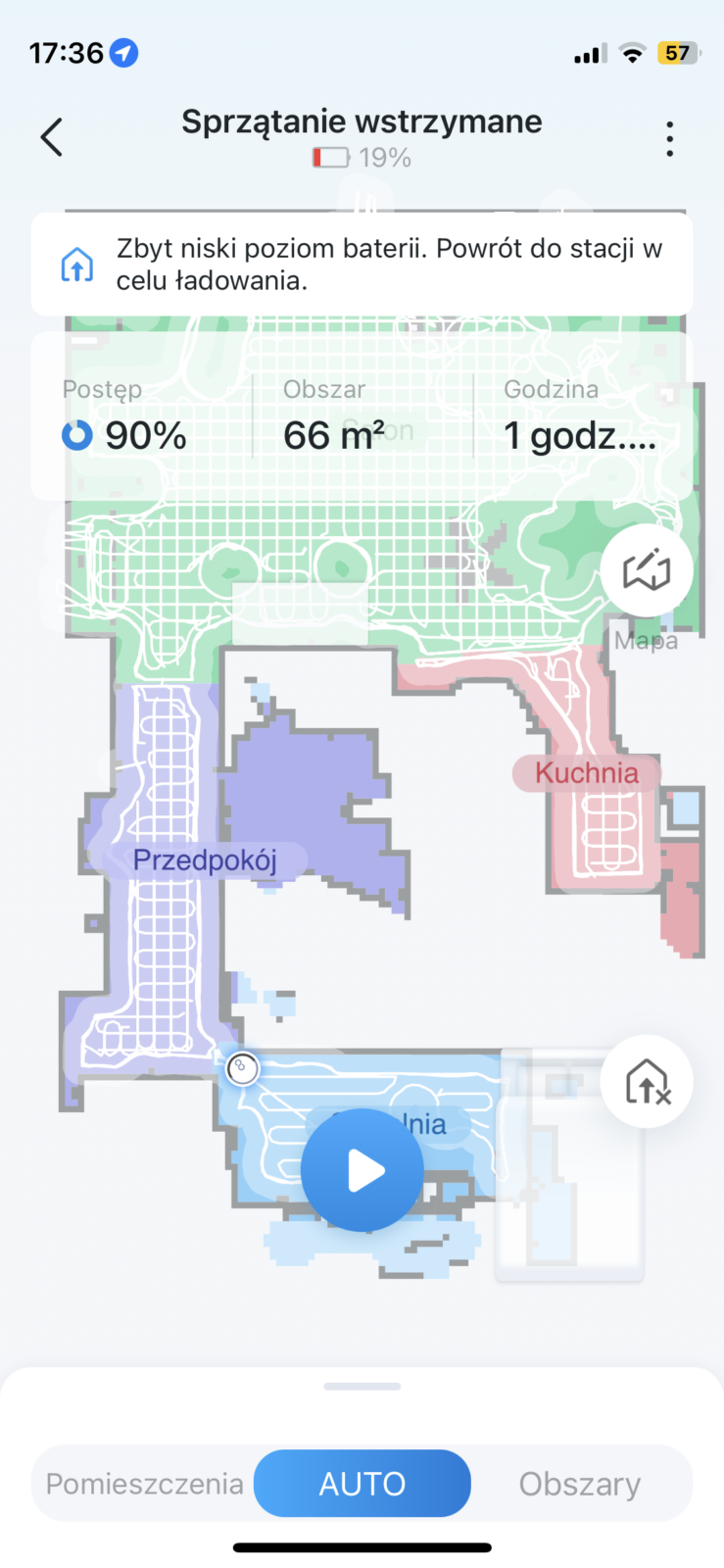 Akumulator odkurzacza pozwala na sprzątnięcie prawie 70 metrów kwadratowych, co zajmie około 100 minut (można liczyć 41-44 metry kwadratowe na godzinę, zależnie od trybu i kształtu pomieszczenia). Sprawdzałam to z maksymalną siłą ssania oraz z mopem. Robot wraca do stacji dokującej, gdy poziom naładowania akumulatora spadnie do 20 proc. Dokończy sprzątanie, gdy się naładuje. Nie trzeba więc obawiać się, że nie sprzątnie całego mieszkania – po prostu zrobi sobie przerwę. Podoba mi się również, że mimo sporej mocy ssania nie jest głośny. Oczywiście nie da się go przegapić, ale jego szum mi nie przeszkadza.