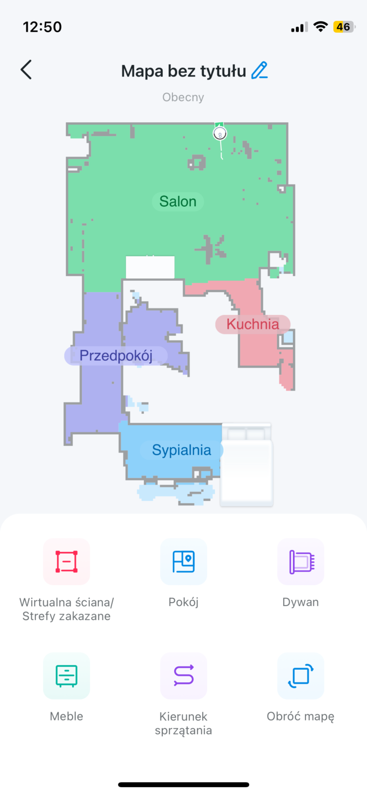Po ustawieniu robota i podłączeniu do sieci należy wysłać go na zwiad – w ten sposób utworzy mapę mieszkania. Następnie oczywiście można umieścić na niej granice pomieszczeń, orientacyjne położenie mebli, oznaczyć dywany i strefy zakazane. Tu także można wytyczyć kierunek sprzątania, co bardzo mi odpowiada. Podłoga w moim mieszkaniu nie jest już nowa i równa. Robotom sprzątającym znacznie lepiej idzie mycie jej w kierunku wschód-zachód niż północ-południe.