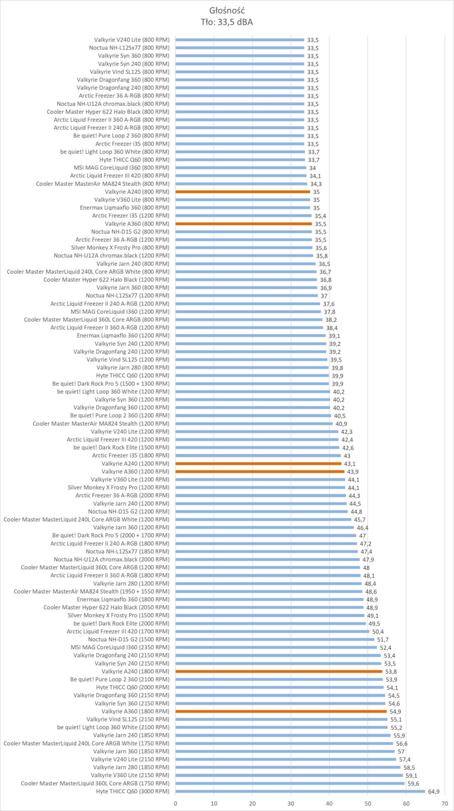 Na maksymalnych obrotach jest dosyć głośno, choć konkurencyjne konstrukcje, albo nawet inne Valkyrie potrafią wypadać słabiej. Na 1200 RPM nadal mogłoby być trochę ciszej, a wyniki bliższe 40 dBA. Choć nadal nie jest źle i na wykresach znajdziecie głośniejsze chłodzenia. Przy 800 RPM jest już cicho i nie usłyszycie obu AiO podczas działania.