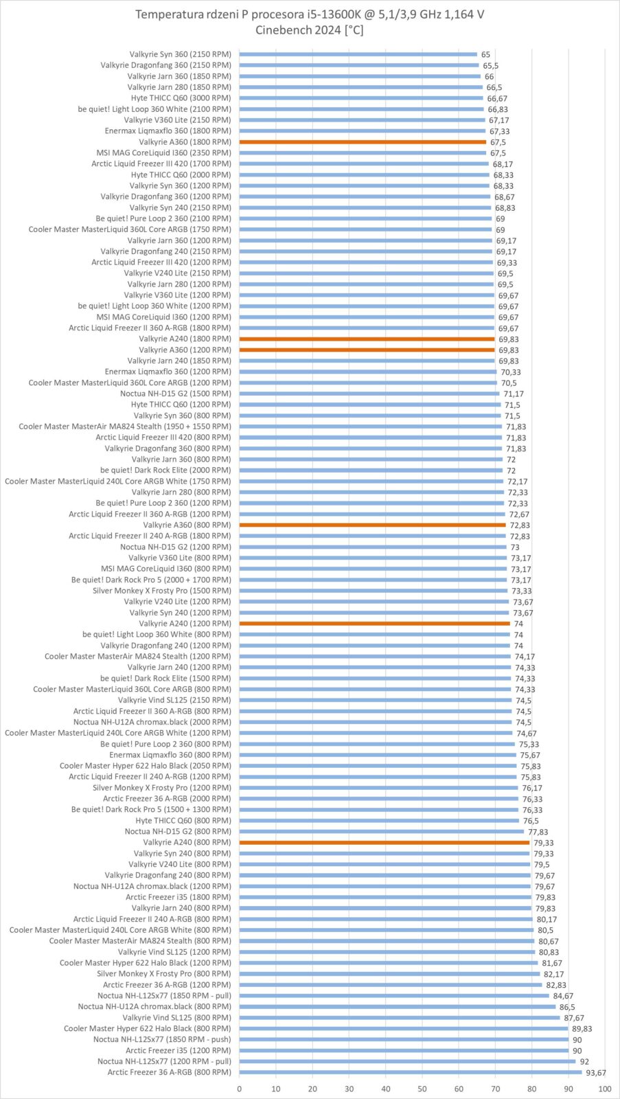 Chłodzenia mogłyby być cichsze przy maksymalnych obrotach i 1200 RPM, ale też nie jest źle i znajdziecie na wykresach głośniejsze konstrukcje. Natomiast wydajność jest naprawdę dobra, a jak spojrzymy na cenę to nawet znakomita. Chłodzenia potrafią pokonywać droższą konkurencję, a sam stosunek ceny do wydajności jest po prostu świetny. W podobnych cenach znajdziecie np. serię MasterLiquid Core, której testy modeli 240 i 360 są na wykresach. Modele Valkyrie z serii A we wszystkich testach wygrywają ze swoimi odpowiednikami, co też pokazuje, jak udane są to chłodzenia. Jeśli więc szukacie naprawdę wydajnych AiO w atrakcyjnych cenach to modele z serii A od Valkyrie będą strzałem w dziesiątkę.