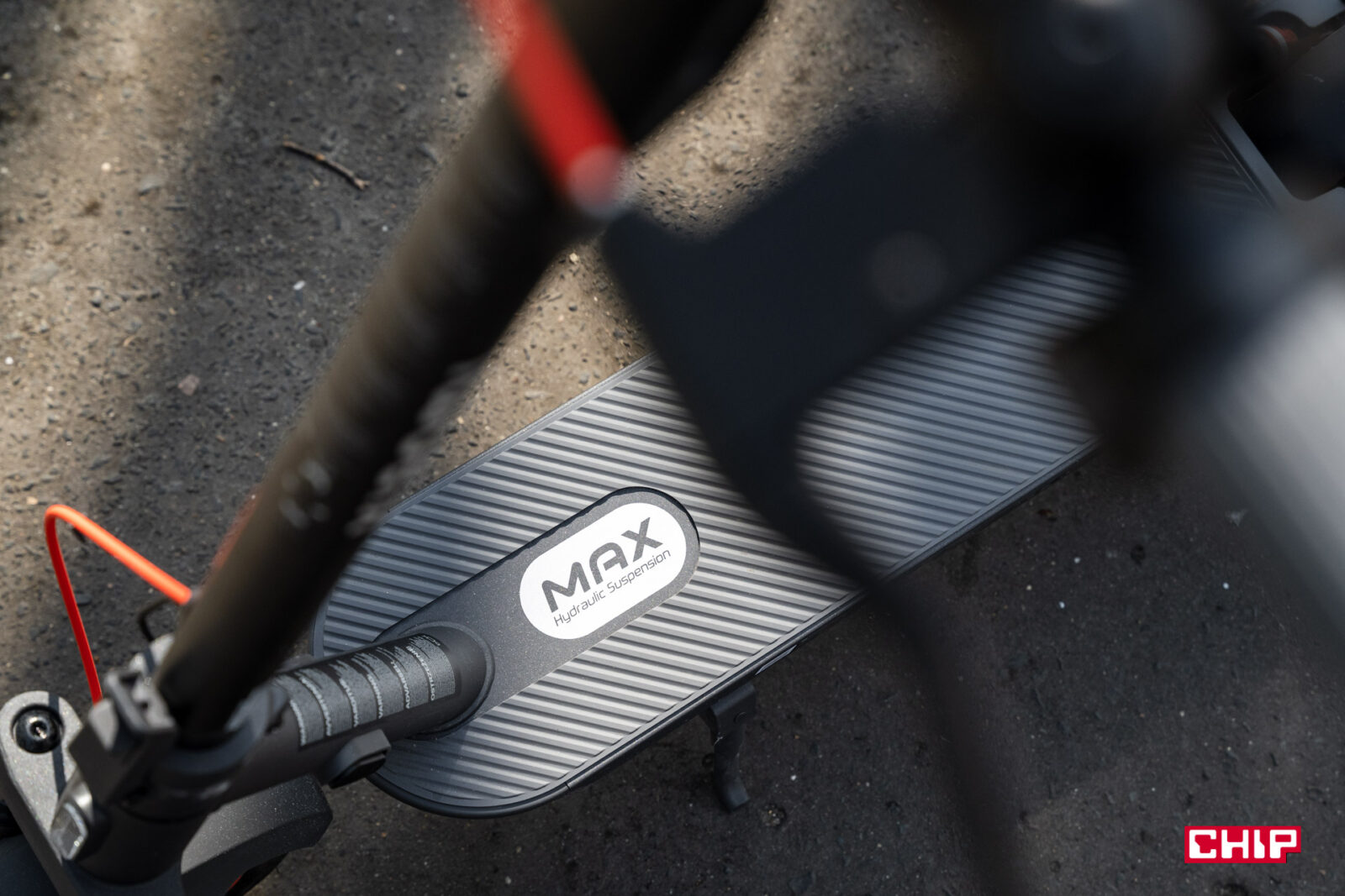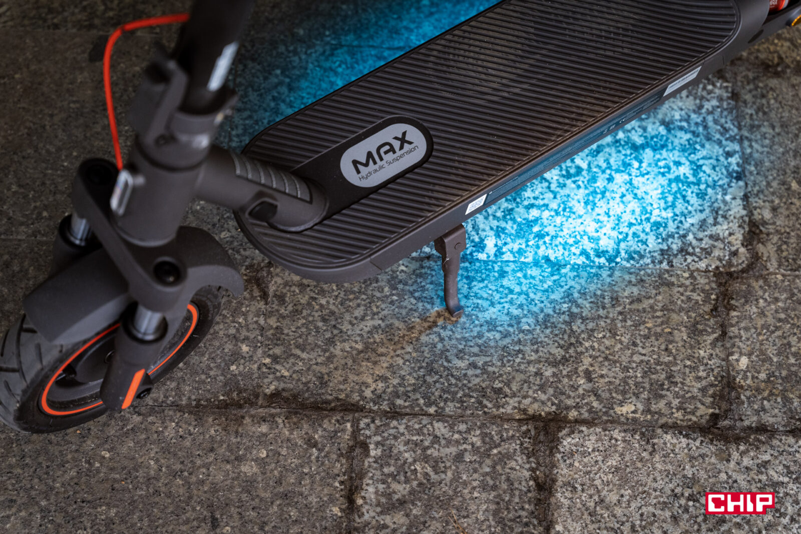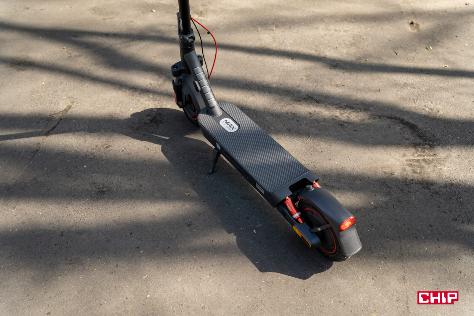 Nie występuje też i za to plus, automatyczne hamowanie przy zjeździe z górki. Bywają hulajnogi, które na siłę starają się wtedy utrzymać 20 km/h, bo przecież więcej nie można. Tutaj z górki możemy swobodnie zjechać bez automatycznego hamowania. Skoro przy tym jesteśmy, to hamulec mamy podwójny – tarczowy z przodu i elektroniczny z tyłu z E-ABS, który dodatkowo rekuperuje energię. W awaryjnych sytuacjach, kiedy mocno wciśniemy hamulec, można bardzo asertywnie zatrzymać się na krótkim dystansie, za co duży plus.