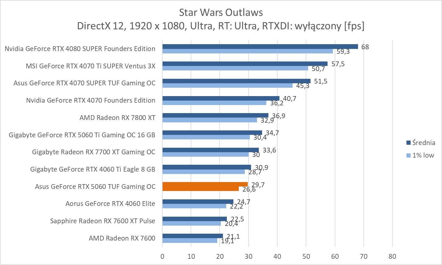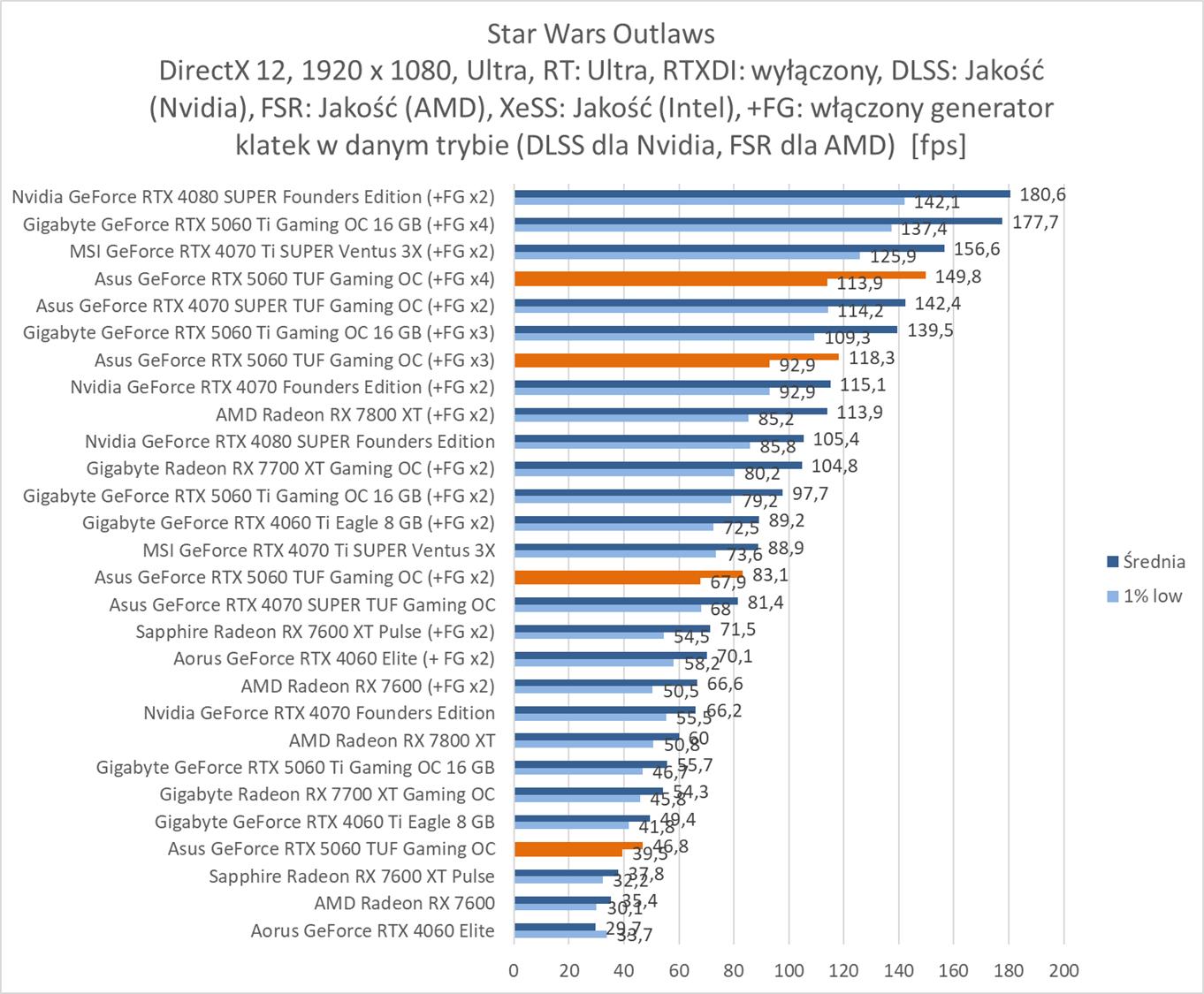 Cyberpunk z path tracingiem był kompletnie niegrywalny nawet z FG x4, stąd brak jego wyników. W Star Warsach nawet z FG x4 nie mamy średnio 60 fps, choć sam wynik może robić wrażenie przy tak słabym modelu.
