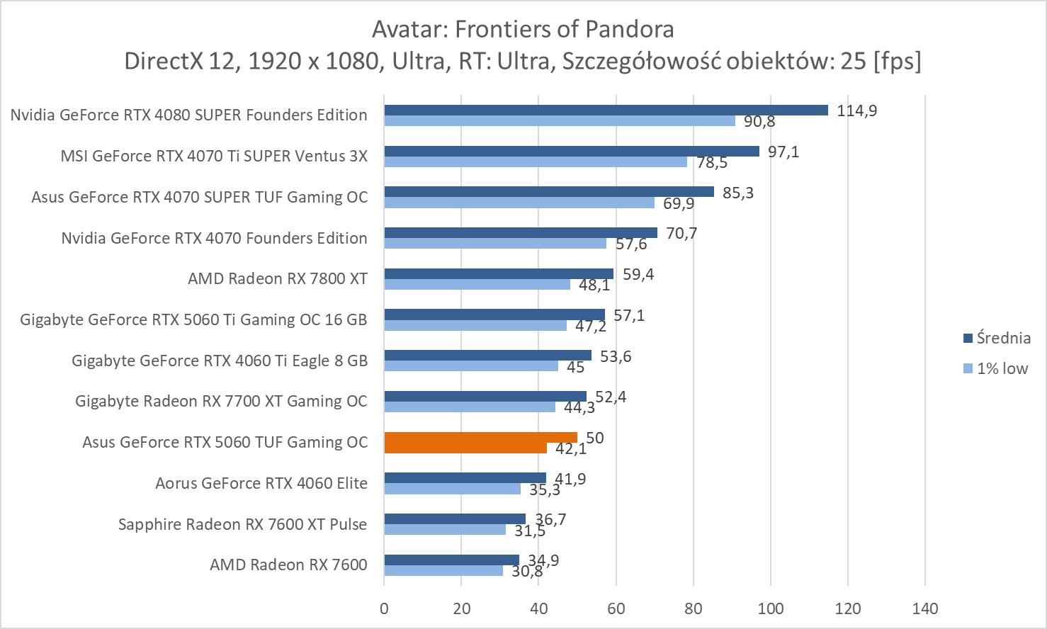 Asus GeForce RTX 5060 TUF Gaming OC w rasteryzacji wypada blisko RTX 4060 Ti 8 GB. Wyniki są minimalnie wyższe w każdej z rozdzielczości, ale tak naprawdę większych różnic średnio nie ma. Grafika wygrywa z RTX 4060 o kolejno ok. 24,5%, 26,3% oraz 24%. Jest też przewaga nad 7600 XT wynosząca kolejno ok. 24,5%, 21,8% oraz 13%. Z drugiej strony widać, że Radeon 7700 XT to wydajniejsza karta, która ma przewagę kolejno ok. 13,1%, 19% oraz 28,7%. Biorąc pod uwagę wcześniejsze wyniki kart z serii RTX 5000 nie ma zaskoczenia.
