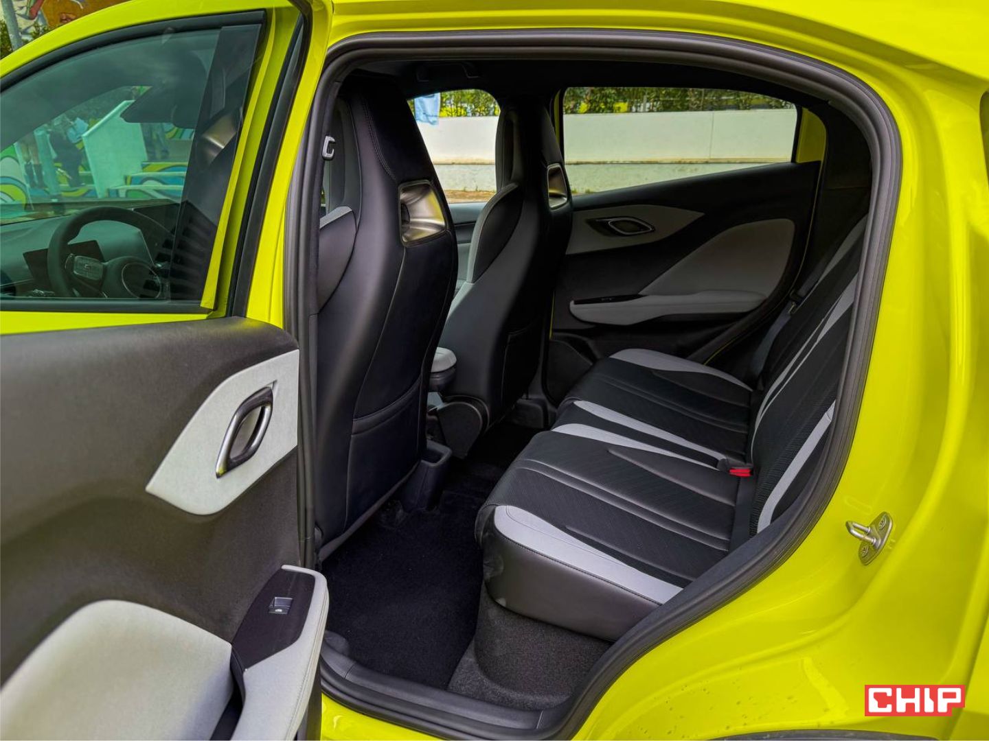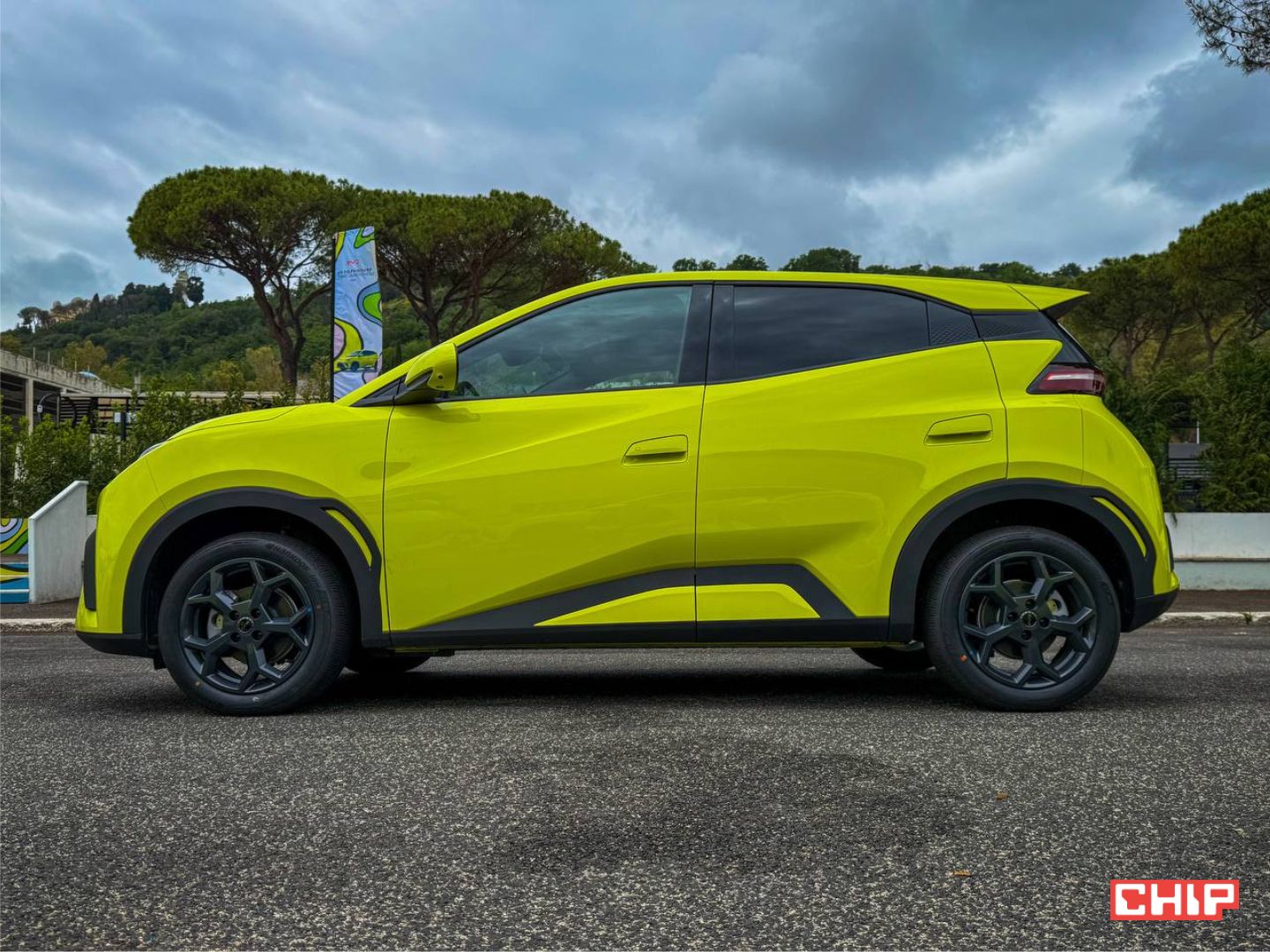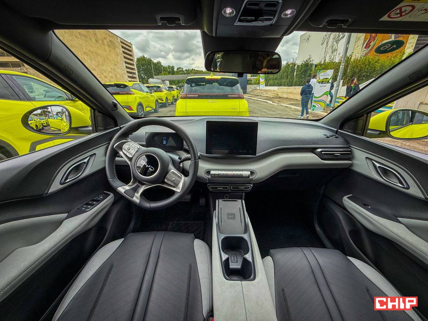 Jeśli chodzi o tył, to znajdziemy tam spojler dachowy, który poprawia aerodynamikę i optycznie przedłuża linię dachu, a do tego mamy pełnowymiarowy pas świateł LED, biegnący przez całą szerokość nadwozia. Podczas premiery w Rzymie samochód był dostępny w zielonym (Lime Green), czarnym i kremowym kolorze. Mi najbardziej w oko wpadł kremowy — stylowy, rzucający się w oko, jednocześnie ładnie wyszczególniający czarne wstawki. Czarny był najmniej ekscentryczny, chociaż (wiadomo) elegancki, za to zielony ani trochę nie wpadł mi w oko. Trochę jednak jest tak, że te miejskie elektryki lubią się rzucać w oczy — a patrząc na kolorystyki wspomnianych wcześniej aut, jak MINI Cooper SE czy Renault 5, to musi się to ludziom podobać. I jeśli do Was to trafia, to ucieszy Was fakt, że za kolor Lime Green nie trzeba dopłacać.