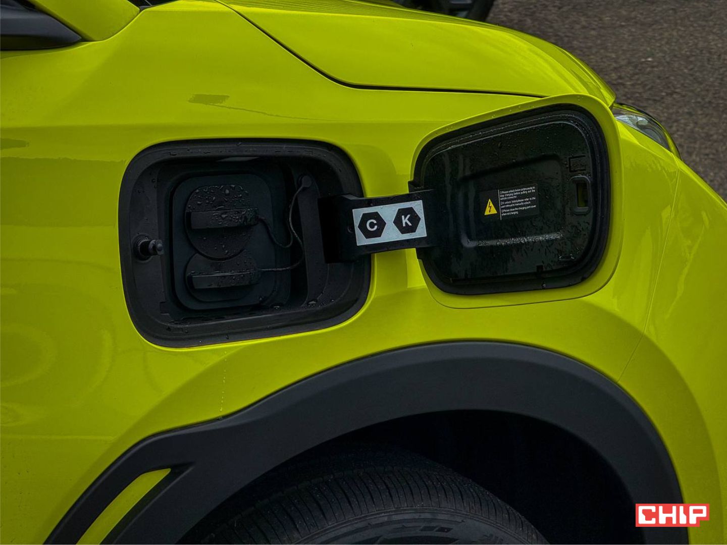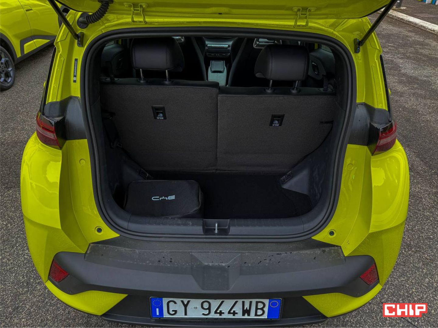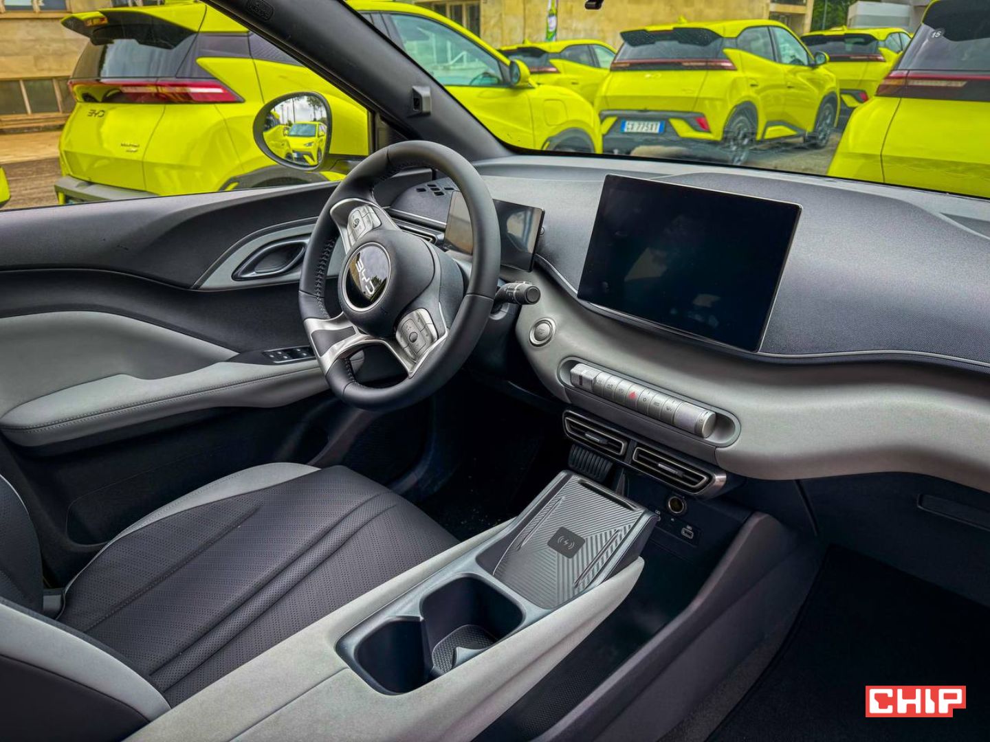 Jeśli chodzi o tył, to znajdziemy tam spojler dachowy, który poprawia aerodynamikę i optycznie przedłuża linię dachu, a do tego mamy pełnowymiarowy pas świateł LED, biegnący przez całą szerokość nadwozia. Podczas premiery w Rzymie samochód był dostępny w zielonym (Lime Green), czarnym i kremowym kolorze. Mi najbardziej w oko wpadł kremowy — stylowy, rzucający się w oko, jednocześnie ładnie wyszczególniający czarne wstawki. Czarny był najmniej ekscentryczny, chociaż (wiadomo) elegancki, za to zielony ani trochę nie wpadł mi w oko. Trochę jednak jest tak, że te miejskie elektryki lubią się rzucać w oczy — a patrząc na kolorystyki wspomnianych wcześniej aut, jak MINI Cooper SE czy Renault 5, to musi się to ludziom podobać. I jeśli do Was to trafia, to ucieszy Was fakt, że za kolor Lime Green nie trzeba dopłacać.