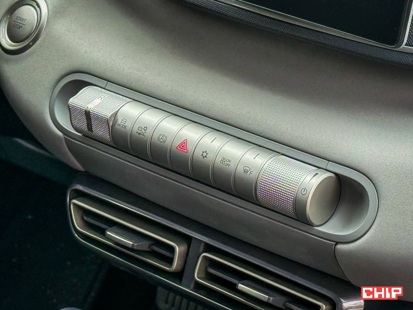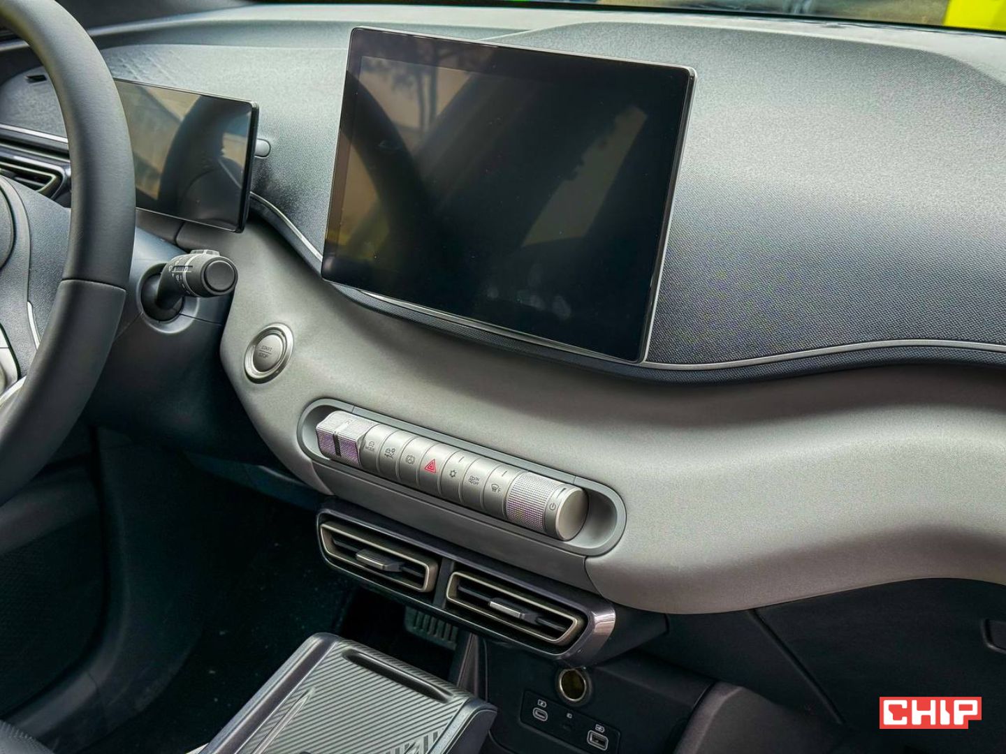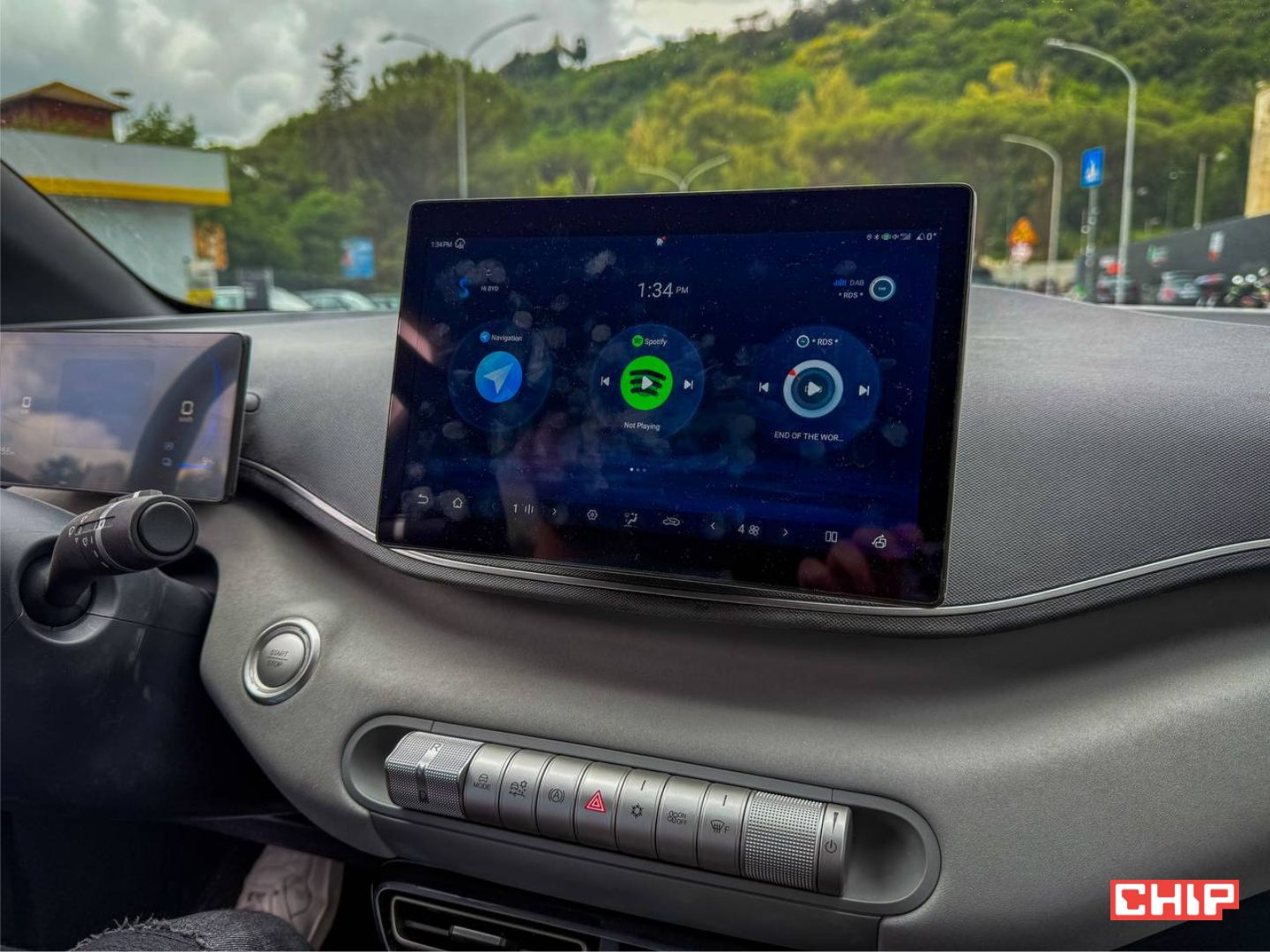 Wnętrze wykończone jest wegańską tapicerką z ekologicznej skóry i akcentami przypominającymi szczotkowany metal. Całość jest dobrze spasowana, nic nie skrzypi, i chociaż jest mocno twarde, to nawet przyjemne w dotyku — choć nie aspiruje do luksusu. Mieszane uczucia wzbudziły u mnie przycisko-pokrętła (trudno jednoznacznie stwierdzić, co to jest), które nie zachowują się jak fizyczne przyciski, a do tego są zaskakująco wiotkie i nie nazwałbym ich najbardziej stabilnymi. Ale w tej cenie takie kompromisy są niezauważalne.
