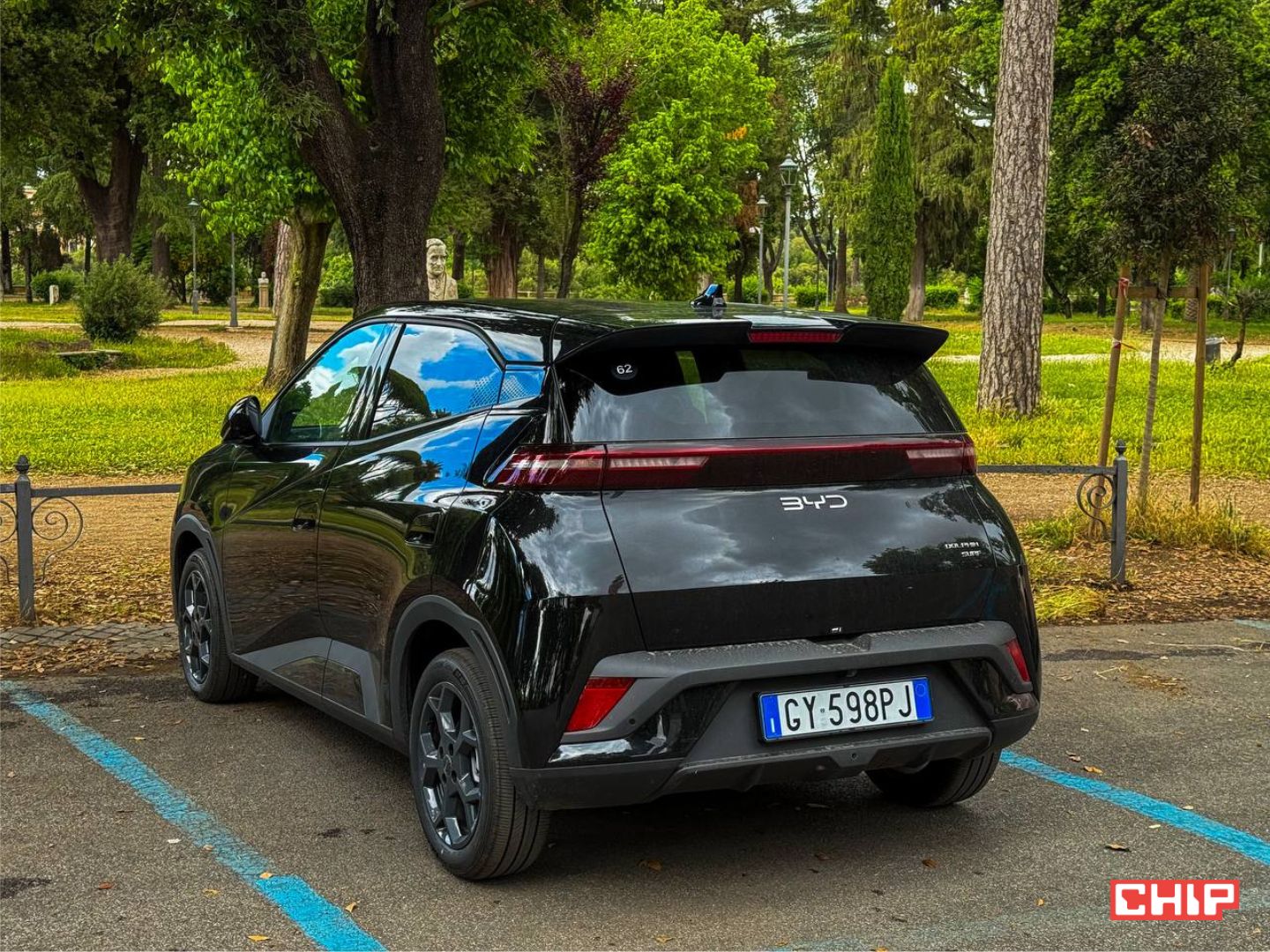 BYD Dolphin Surf to samochód, który wpisuje się w linię projektową BYD, a co za tym idzie, od razu zwraca uwagę na ulicy. Jego wymiary — 3990 mm długości, 1720 mm szerokości i 1590 mm wysokości — są skrojone pod miejskie potrzeby: samochód jest zwinny, łatwy do manewrowania na wąskich uliczkach i idealny do ciasnych miejsc parkingowych. Pierwszą jazdę miałem okazję odbyć w stolicy Italii, więc sprawdziłem to w jeden z najbardziej ekstremalnych sposobów — i po przejażdżce po Rzymie w godzinach szczytu ręczę, że naprawdę Dolphin Surf odnajduje się w zatłoczonych miastach. Jednocześnie, dzięki sprytnemu wykorzystaniu platformy e-Platform 3.0, oferuje przestrzeń wewnętrzną i bagażnik większy, niż można się spodziewać, co jest dodatkowym plusem.