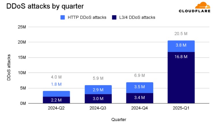 W pierwszym kwartale 2025 roku Cloudflare zablokowało 20,5 mln ataków DDoS