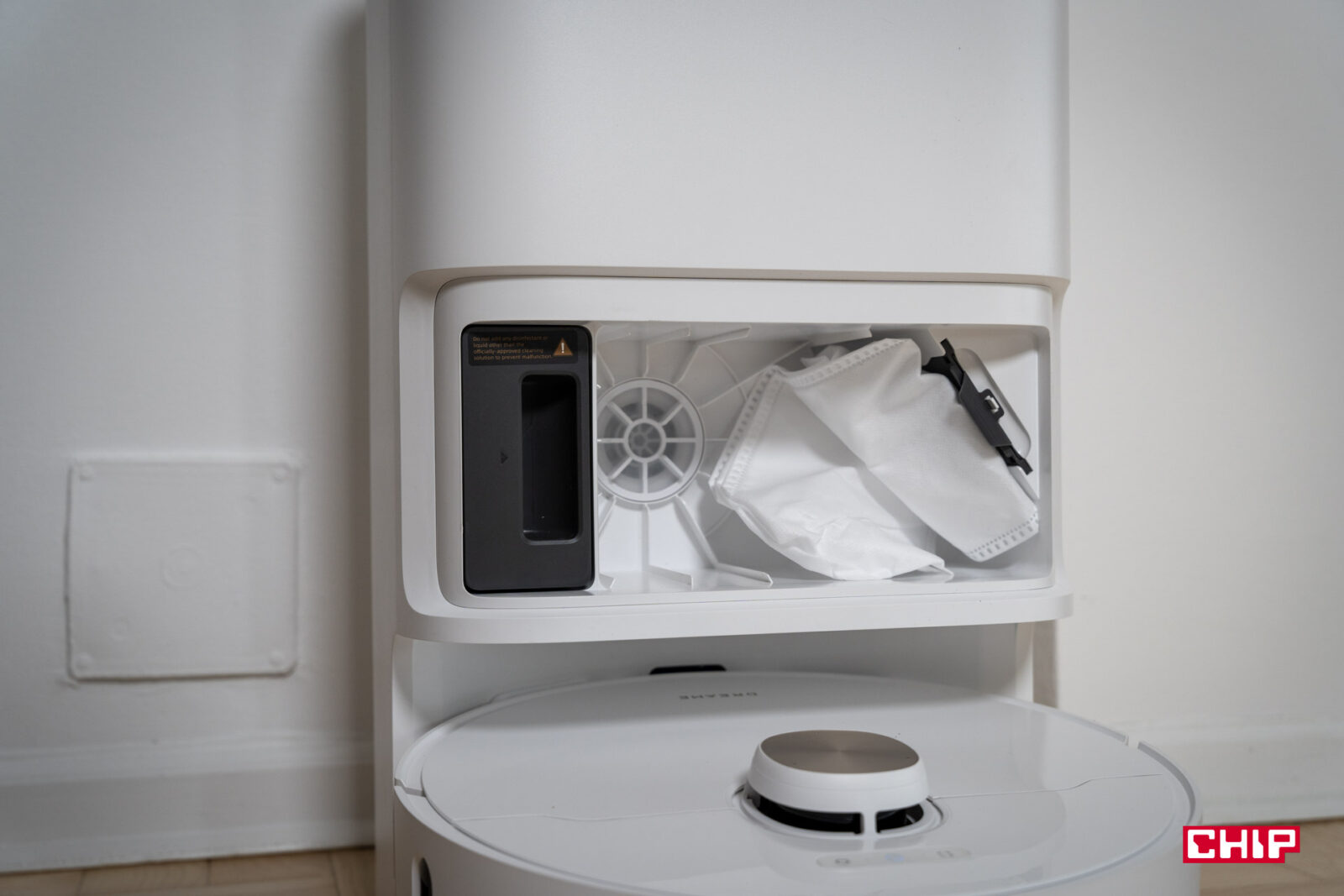 Po zakończonym sprzątaniu robot wraca do stacji PowerDock. Worek na kurz ma pojemność 3,2 litra, więc przy typowym, codziennym odkurzaniu mieszkania 60 m² wystarcza to nawet na 3 miesiące pracy odkurzacza bez konieczności wymiany. Podkładki mopujące są myte w gorącej, 75-stopniowej wodzie i suszone strumieniem ciepłego powietrza.
