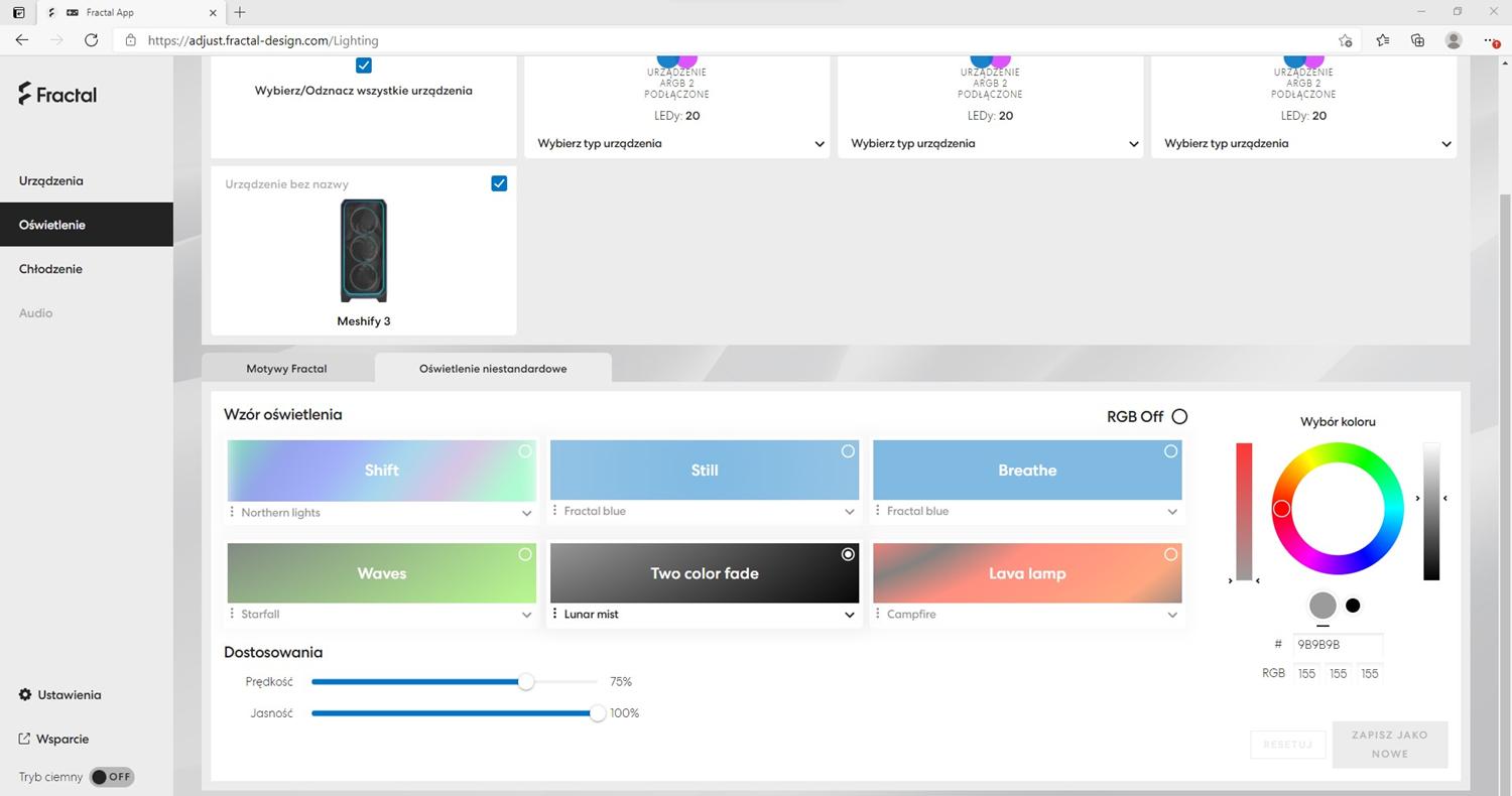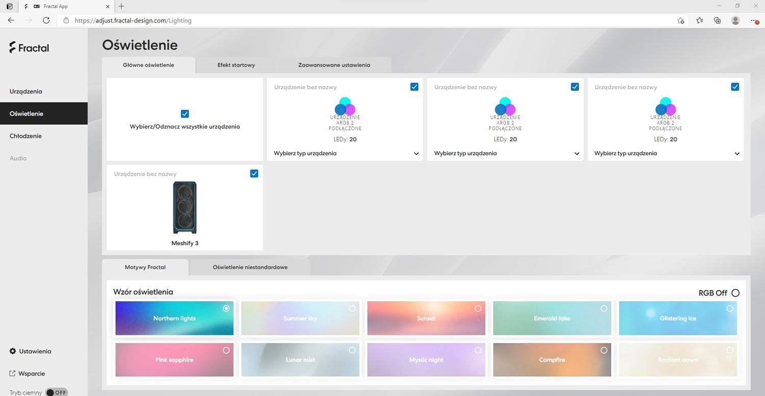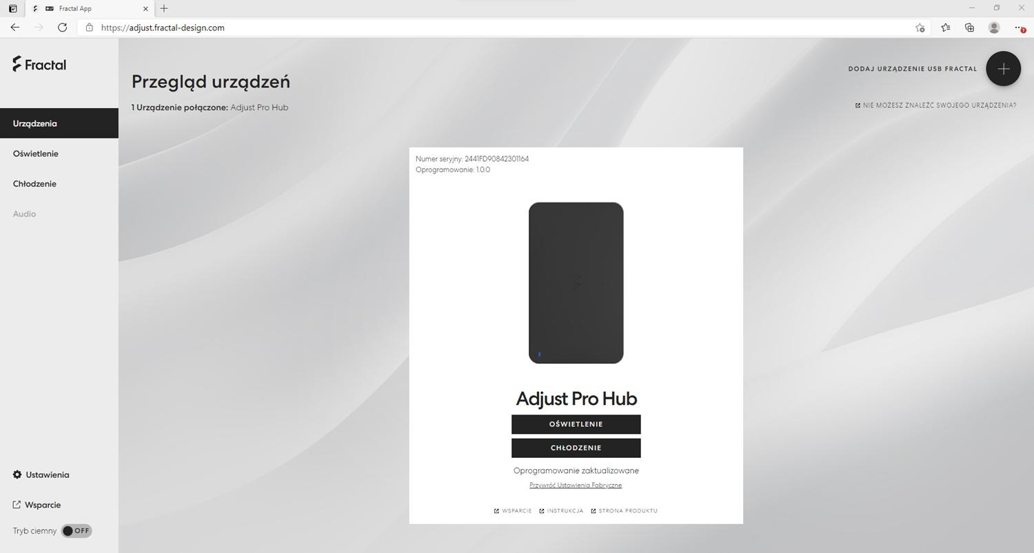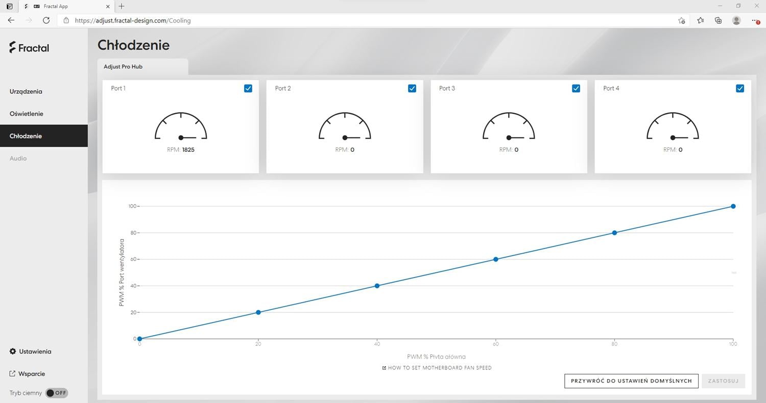 Do testowanej obudowy mamy dołączony kontroler Adjust Pro, do którego podpinamy spięte razem przednie wentylatory. Zasilany jest on ze złącza SATA i podłączamy go pod płytę 4-pin PWM oraz USB 2.0. Do kontrolera możemy podłączyć cztery złącza USB-C od wentylatorów. Co ciekawe nie ma tutaj oprogramowania, a sterujemy wszystkim przez stronę http://adjust.fractal-design.com/. Można tam zarządzać podświetleniem oraz pracą wentylatorów, choć ta zależy od sygnału PWM z płyty głównej. Nie ma tutaj możliwości synchronizacji podświetlenia z płytą główną, które jednak mogłoby się przydać, nawet jako opcja. Natomiast samo rozwiązanie bez konieczności instalacji oprogramowania oceniam pozytywnie. Działa to bez problemów, a zawsze to jeden program mniej.