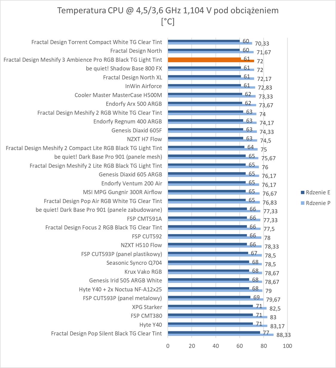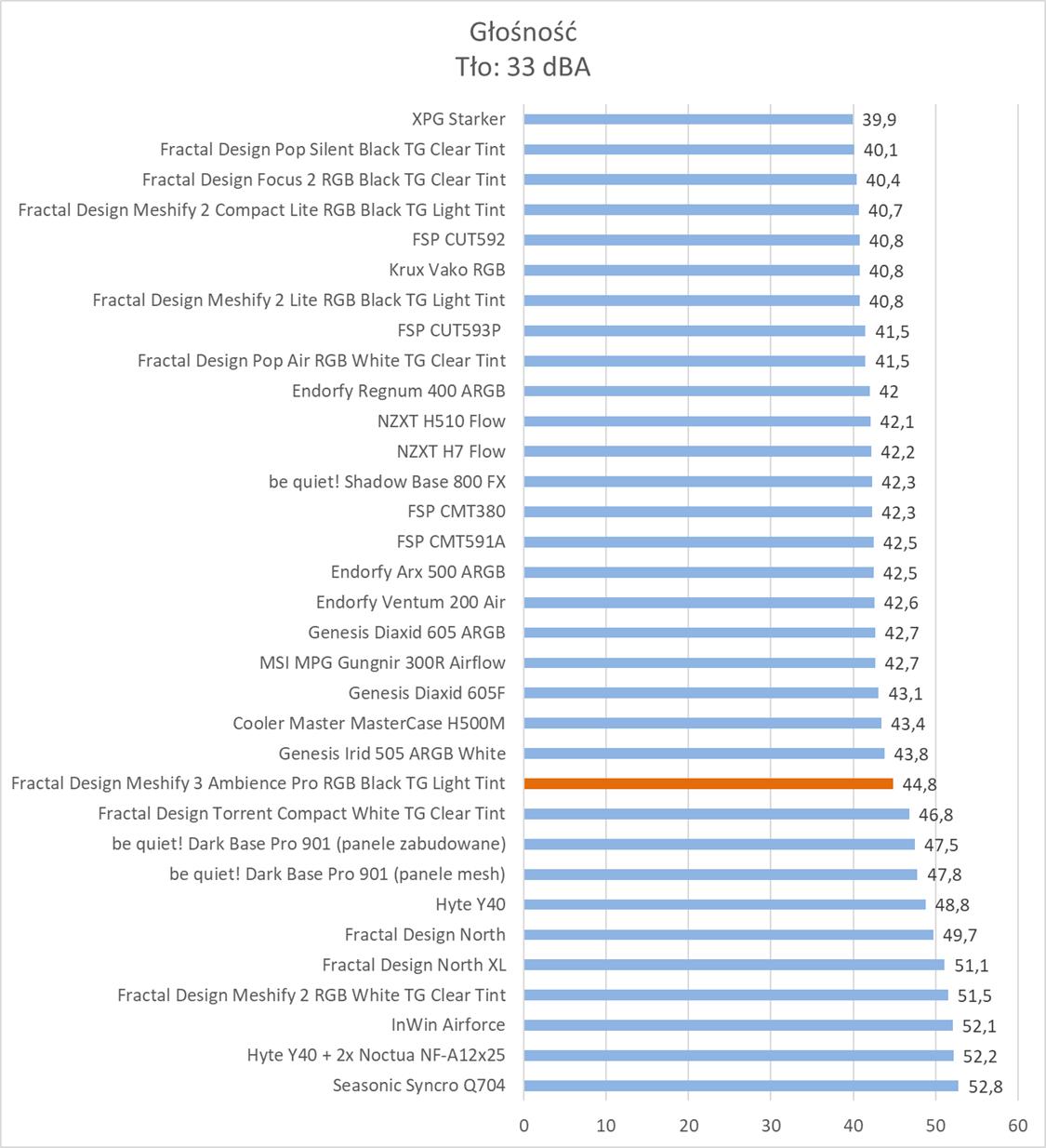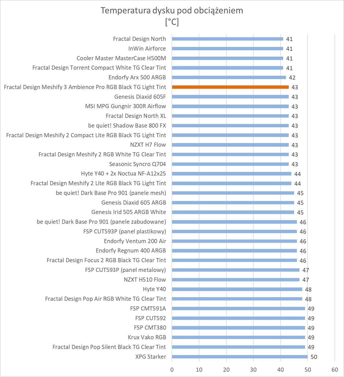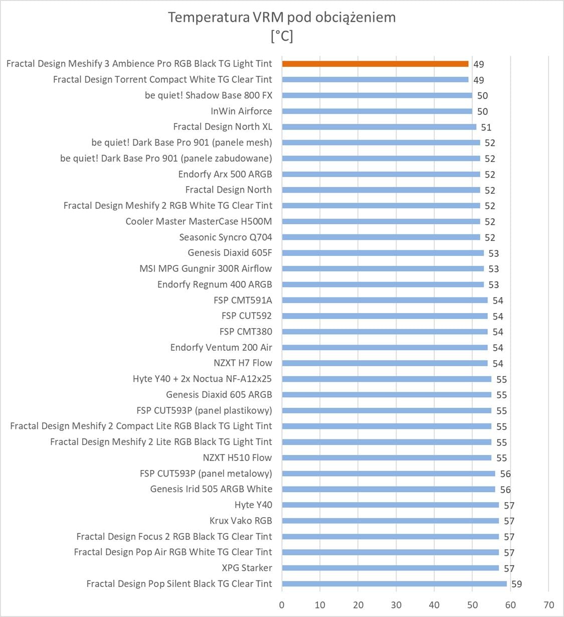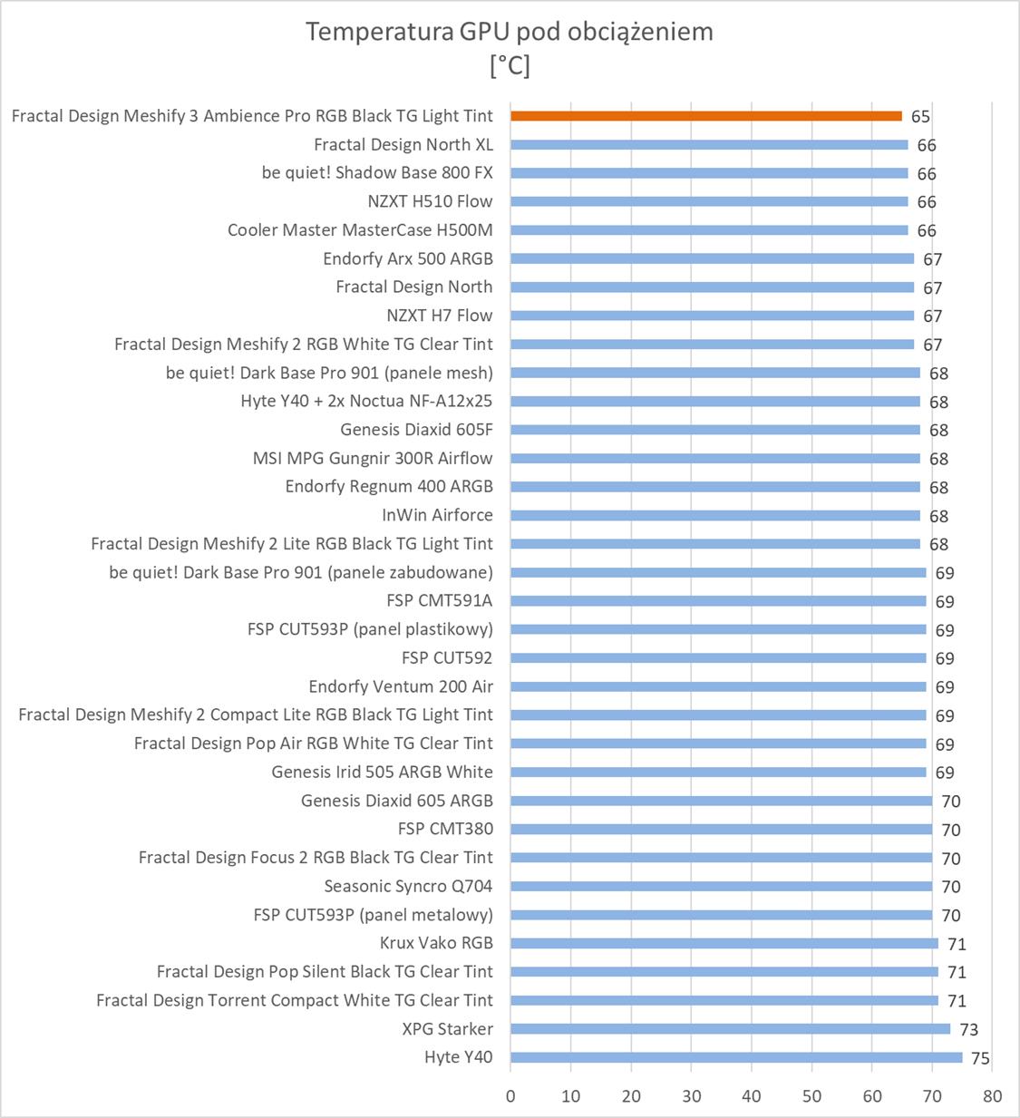 Bez wątpienia mamy do czynienia z jedną z najlepszych obudów. Temperatury wszystkich testowanych podzespołów są naprawdę niskie. W szczególności warto zwrócić uwagę na kartę graficzną, która wypada stopień niżej niż przy pozostałych modelach. Widać więc, że tunel z przodu spełnia swoją funkcję. Temperatury procesora to TOP 3, a VRM również najlepsze. Co ważne Fractal Design Meshify 3 przy maksymalnych obrotach nie jest bardzo głośny. Widać, że nowe wentylatory również pod tym względem sprawdzają się. Zwróćcie np. uwagę na różnice względem North XL, który też ma trzy 140 mm wentylatory, ale są one znacznie głośniejsze.
