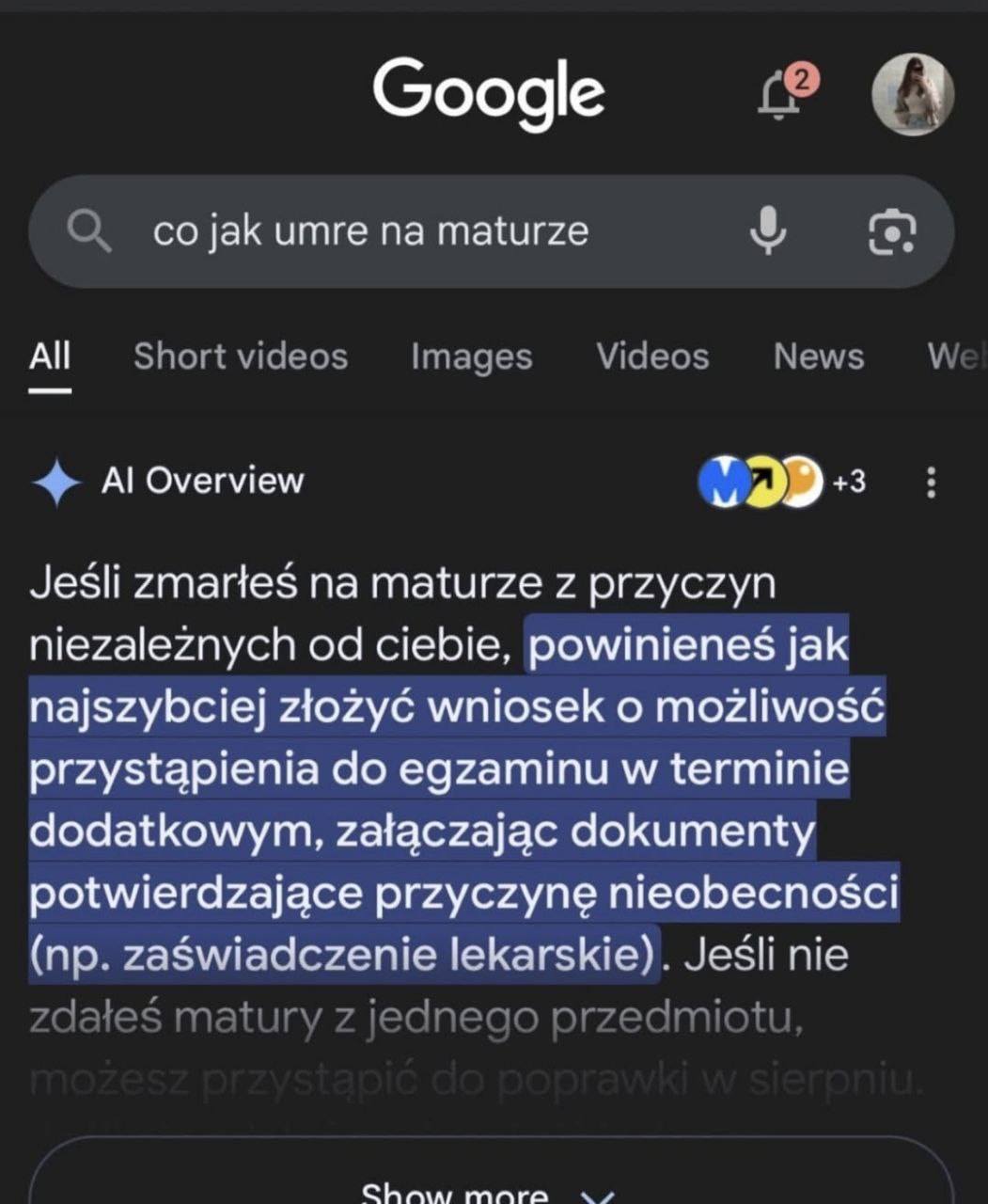 Napis “Generatywna AI ma charakter eksperymentalny” jest niczym plasterek przyklejony na pękniętą ścianę. Funkcja eksperymentalna, którą umieszcza się w górnej części wyszukiwania i przysłania nią inne wyniki, to test, ale naszego zaufania. Mimowolnie “wytrenujemy” taką sztuczną inteligencję, która będzie się rzadziej myliła w tego typu kwestiach. Czy jednak uzyska zrozumienie naszej śmiertelności? Czy zrozumie, na czym polega nasze zaufanie do wyników wyszukiwania?