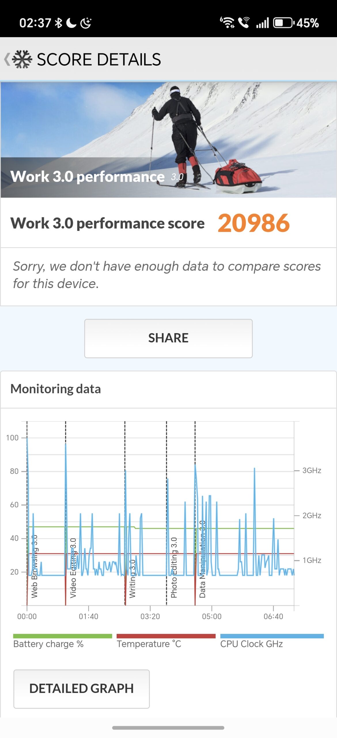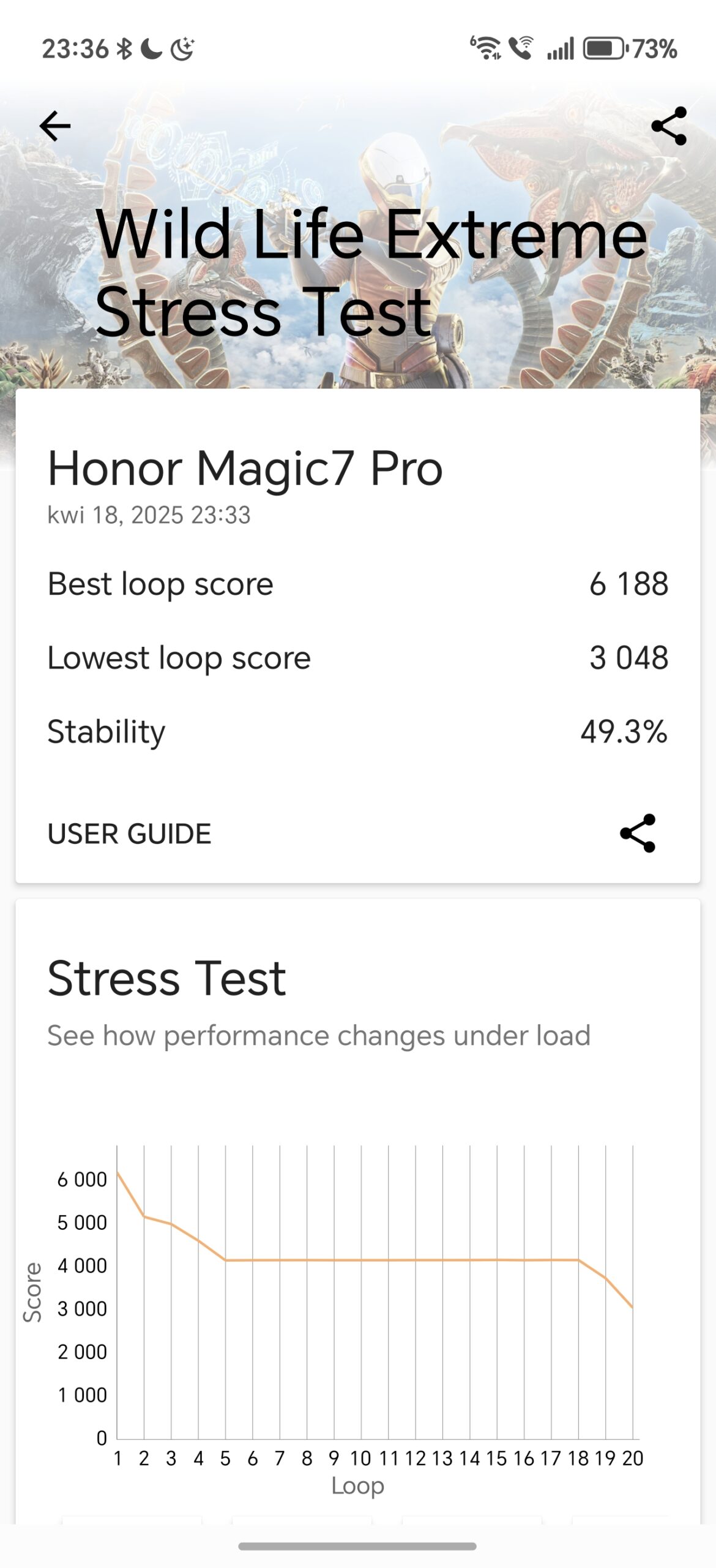 Wykresy są bezlitosne, throttling dawał o sobie znać już po pierwszym przebiegu, a od 5 następowała stabilizacja mniej więcej stabilizacja. W przypadku mniej wymagających benchmarków taki poziom był utrzymywany już do ostatniego przebiegu, jednak w przypadku najbardziej wymagających następował dalszy spadek pod koniec pomiarów – Wild Life Extreme Stress Test osiągnął stabilność poniżej 50% i trudno to uznać za wynik dobry. W rzeczywistych warunkach podobna sytuacja dotyczyć może gier i być może długotrwałego nagrywania materiałów video w najwyższych parametrach, ale nie zwykłego użytkowania smartfonu.