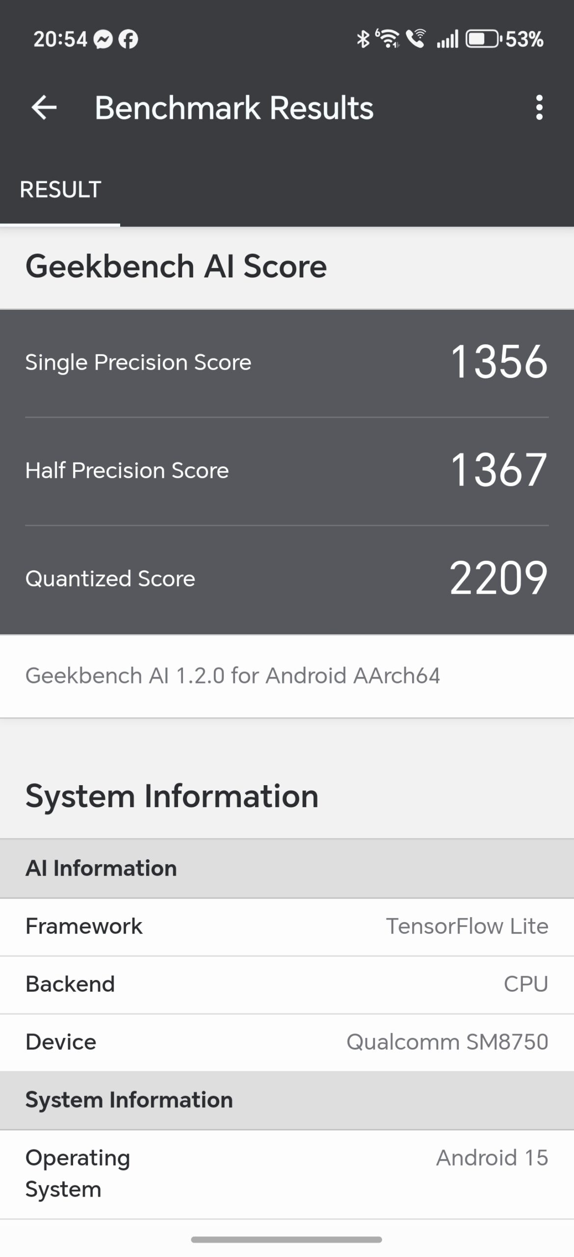 - Geekbench AI CPU: 1356 / 1367 / 2209 pkt