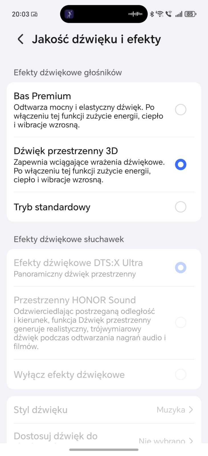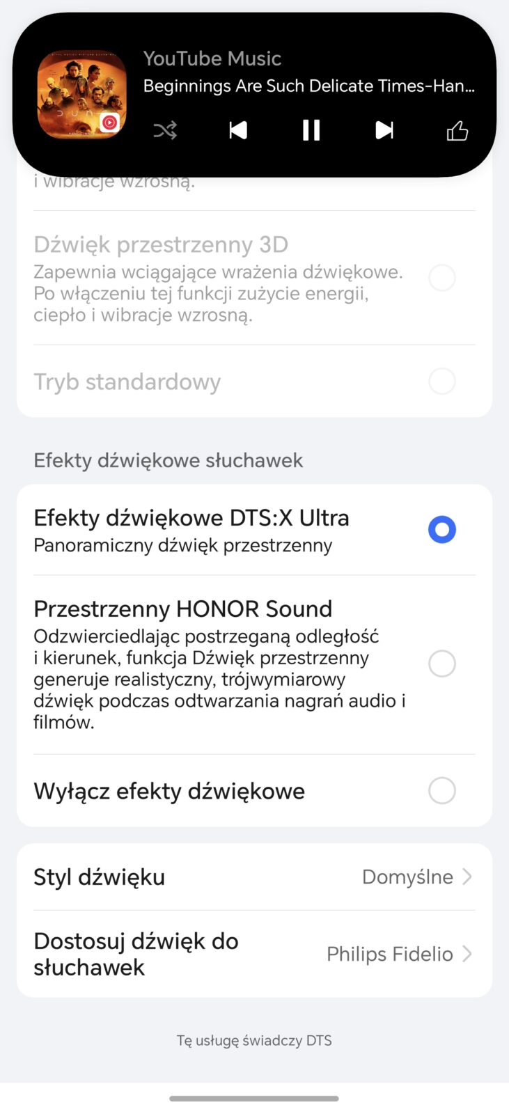Jeśli chodzi o słuchawki, to smartfon radzi sobie znakomicie. Także i tu dostępne są dwa systemy poprawiania jakości, ale żaden nie jest niezbędny – gra doskonale i bez niczego. Dźwięk przestrzenny Honor niezbyt mi przypadł do gustu, natomiast DTS:X Ultra wypada znakomicie i to właśnie z niego na ogół korzystałem. Szkoda tylko, że zabrakło wsparcia dla Dolby ATMOS – dźwięk przestrzenny w serwisach VOD na tym ucierpiał, podobnie jak zdolność do odtwarzania Spatial Audio w Apple Music. Dość przeciętnie wypada wsparcie kodeków audio bluetooth – jest SBC, AAC i LDAC, niestety zabrakło zyskującego popularność LHDC 5.0.