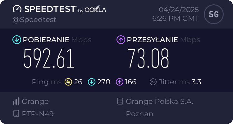 W zasięgu pasma C (3,6 GHz) transfery danych do użytkownika bez problemu sięgały 550-600 Mbps – są smartfony, które osiągają u mnie więcej, ale różnice nie są duże, bo na to nie pozwala istniejąca w tej chwili infrastruktura. Nie mam też zastrzeżeń do pracy Wi-Fi, choć szkoda, że mój AP nie pozwala na użycie Wi-Fi 7. Podczas połączenia WiFi 6E smartfon łączył się z routerem w paśmie 6 GHz, z prędkością 2402 Mbps, co pozwoliło na osiągnięcie rzeczywistych transferów rzędu 1,4-1,5 Gbps.