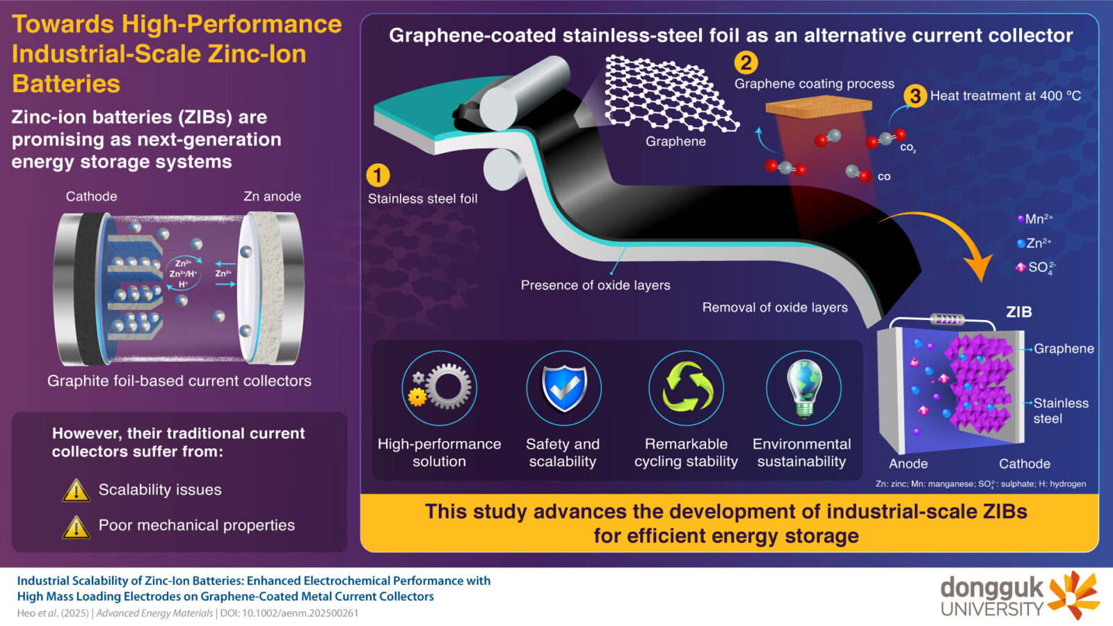 Jednak mimo wielu zalet, akumulatory cynkowo-jonowe dręczą problemy, a to szczególnie w kontekście kolektorów prądowych, czyli elementów przewodzących prąd w akumulatorach. Tradycyjne materiały, takie jak folia grafitowa, mają słabe właściwości mechaniczne i ograniczoną skalowalność, co utrudnia szersze wdrożenie tej technologii. Oto jednak zespół badawczy pod kierownictwem prof. Geon-Hyounga Ana z Dongguk University opracował nowatorskie rozwiązanie tego problemu – grafenową folię stalową (G@SSF-400), która pełni funkcję kolektora prądowego.