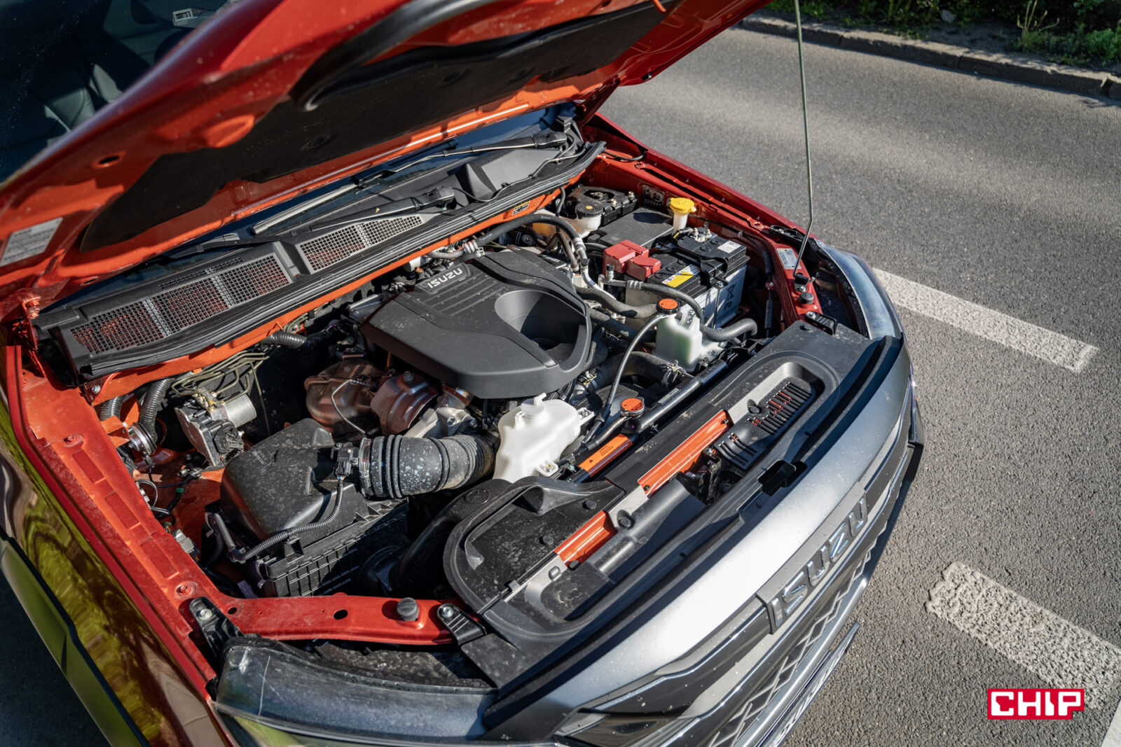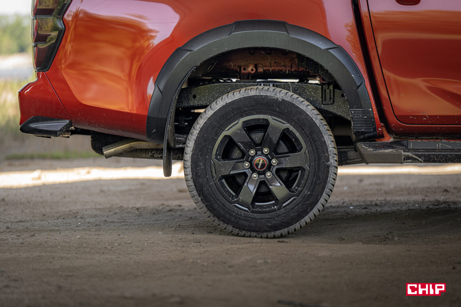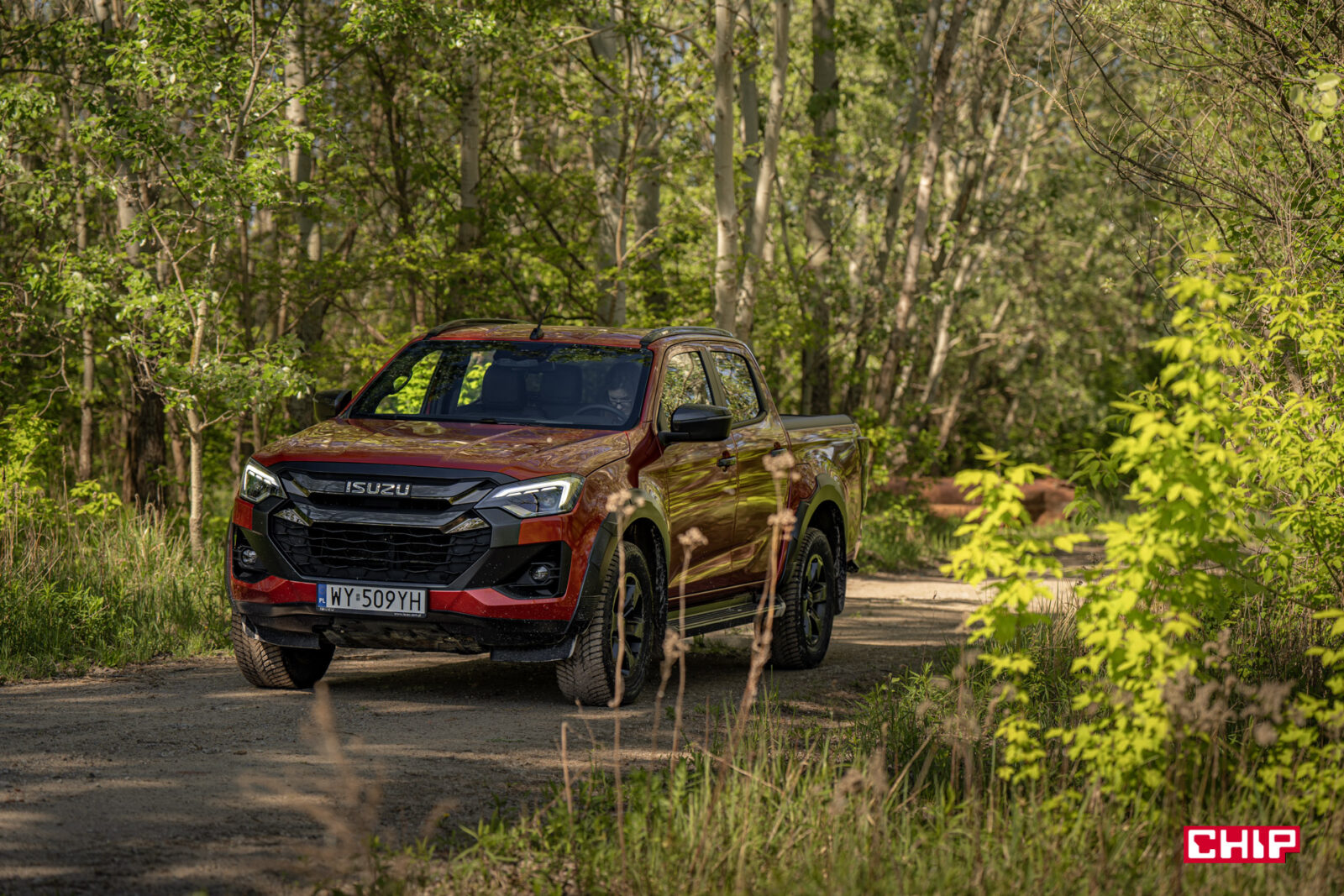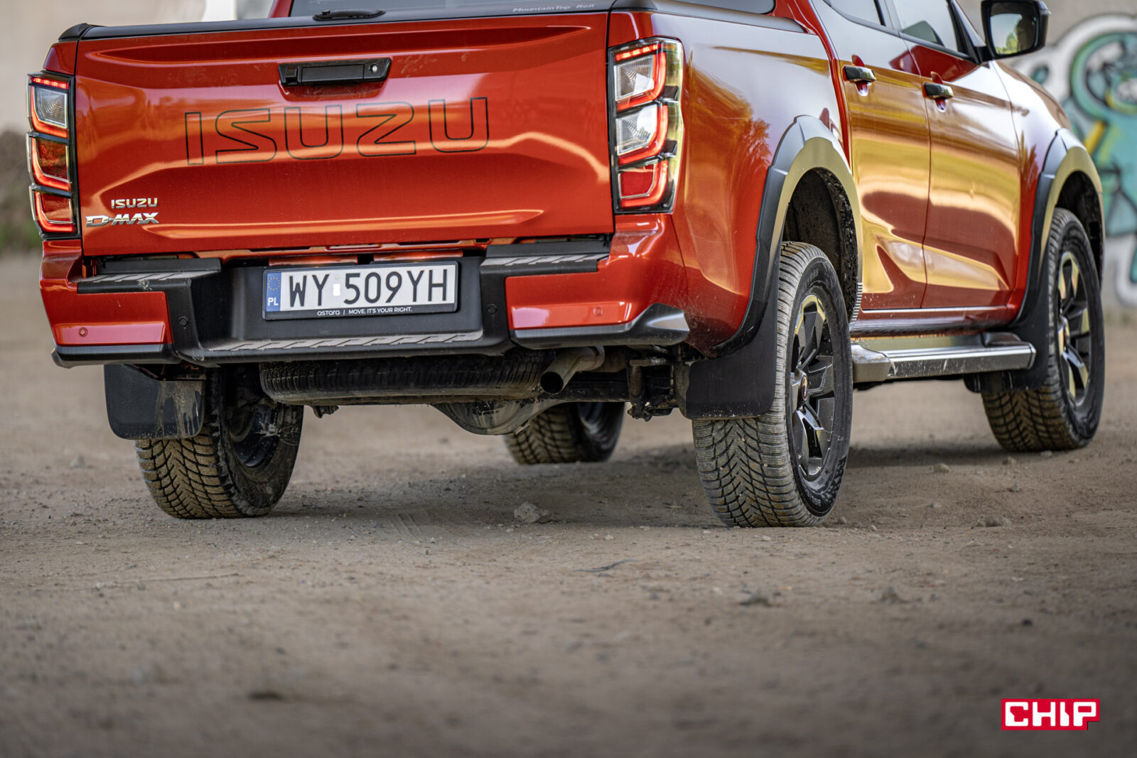 Zabrudzenia idealnie komponują się z masywną i efektowną sylwetką D-Maxa. To auto robi ogromne wrażenie tym, jak się prezentuje. Wysoko uniesiona maska, masywny grill, efektowne przetłoczenia, nieduże, ale dobrze wyglądające felgi z oponą o wysokim profilu – to wszystko, szczególnie w połączeniu z bardzo efektownym czerwonym lakierem tworzy świetną całość. Jeśli ktoś, mówiąc wprost, spodziewał się wizualnie bieda-wersji Forda Rangera Raptora to może się solidnie zdziwić.
