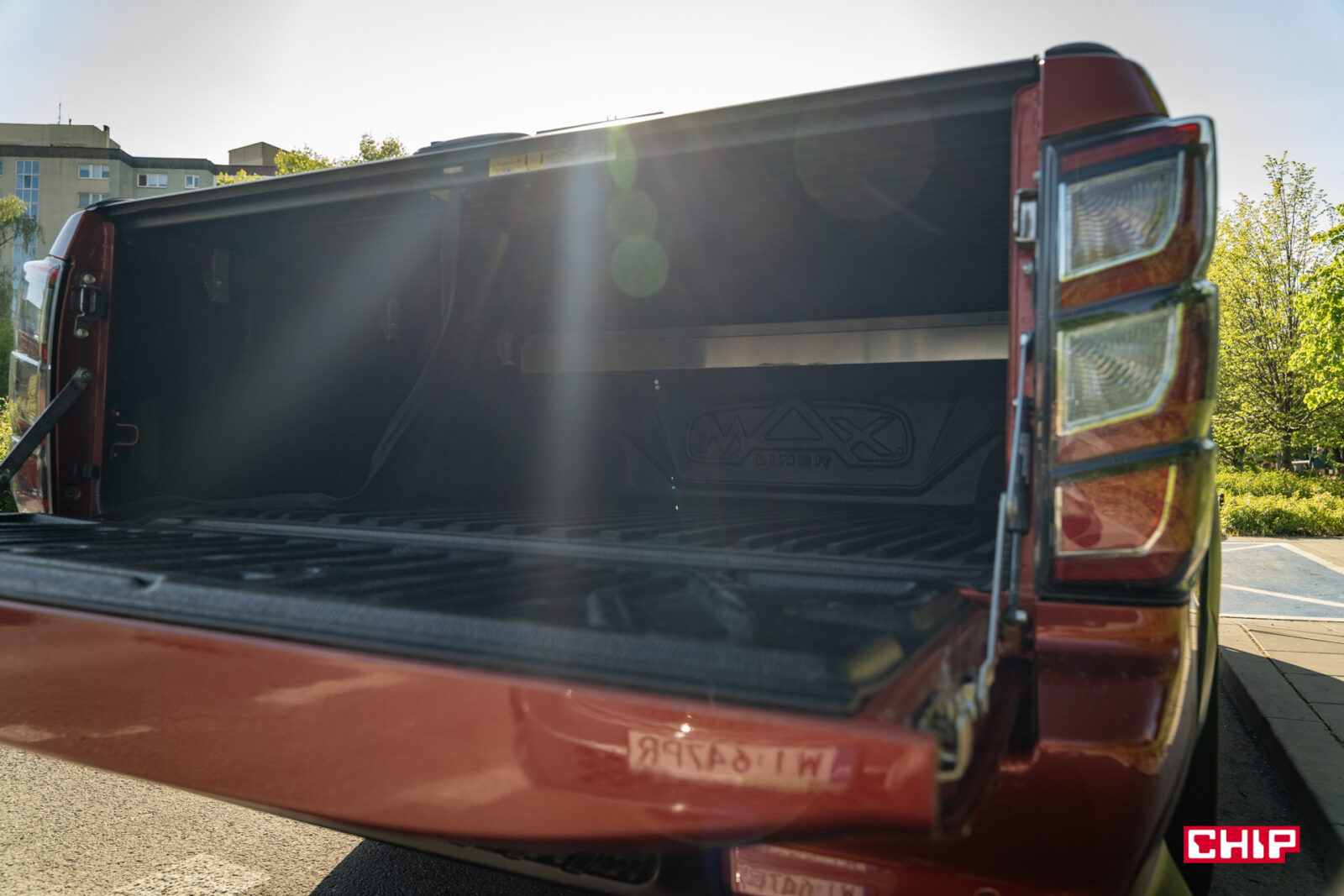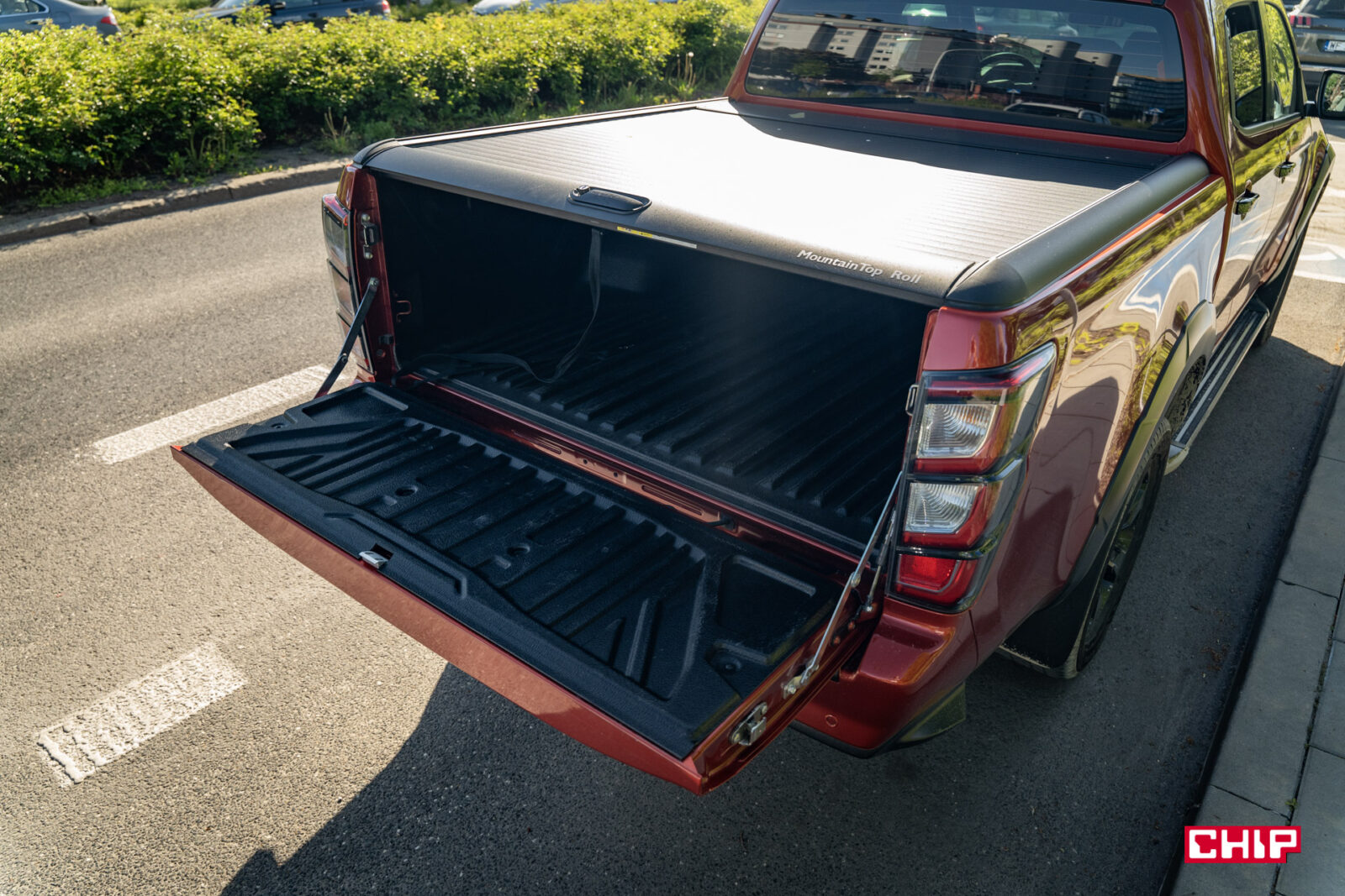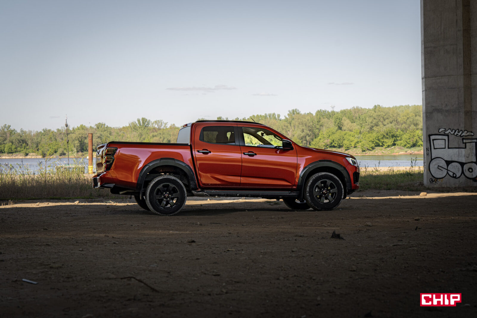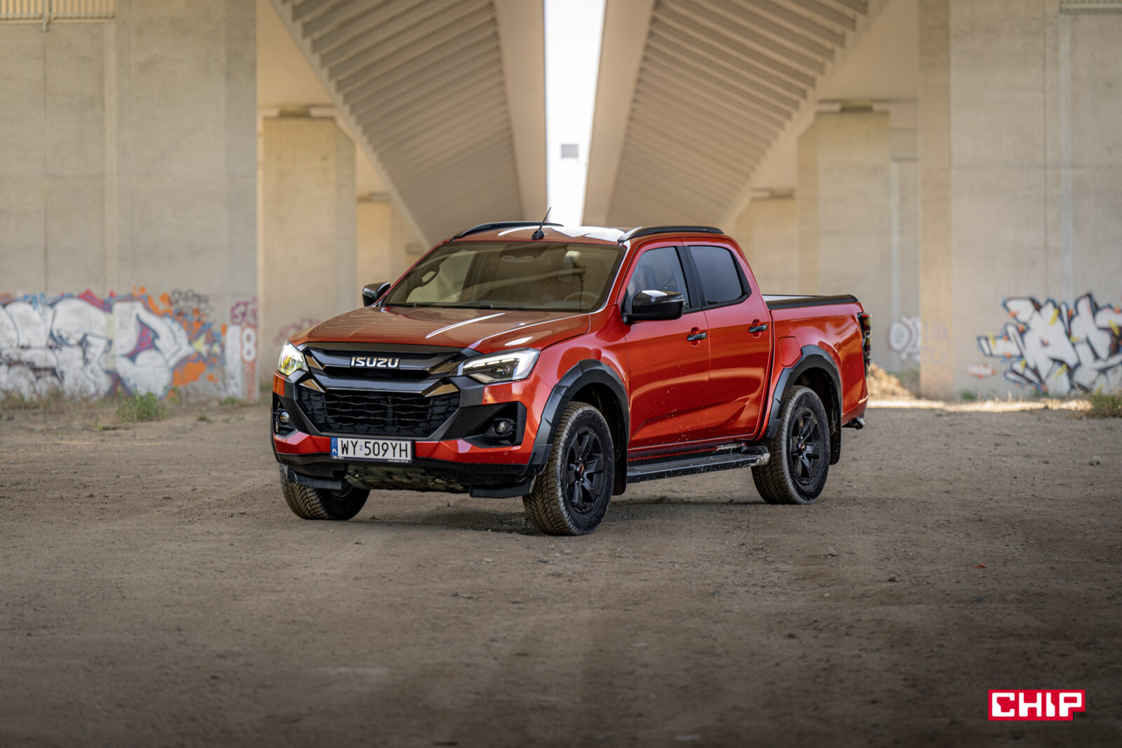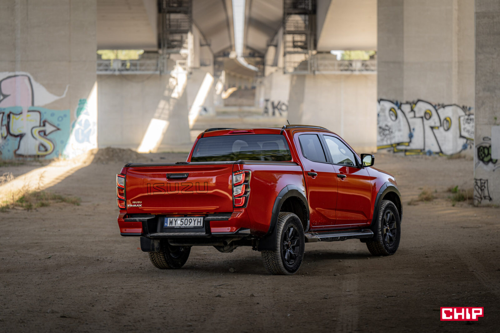Zabrudzenia idealnie komponują się z masywną i efektowną sylwetką D-Maxa. To auto robi ogromne wrażenie tym, jak się prezentuje. Wysoko uniesiona maska, masywny grill, efektowne przetłoczenia, nieduże, ale dobrze wyglądające felgi z oponą o wysokim profilu – to wszystko, szczególnie w połączeniu z bardzo efektownym czerwonym lakierem tworzy świetną całość. Jeśli ktoś, mówiąc wprost, spodziewał się wizualnie bieda-wersji Forda Rangera Raptora to może się solidnie zdziwić.