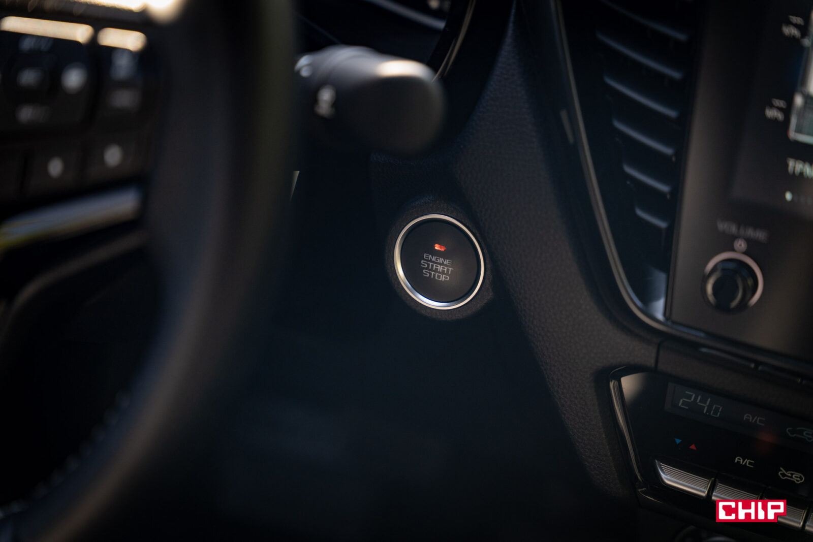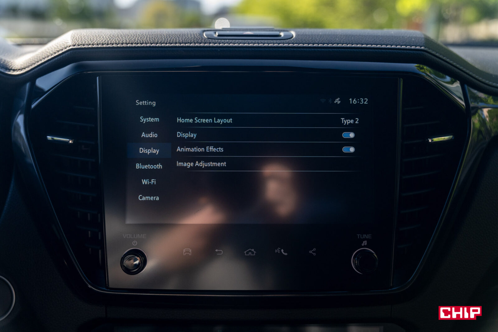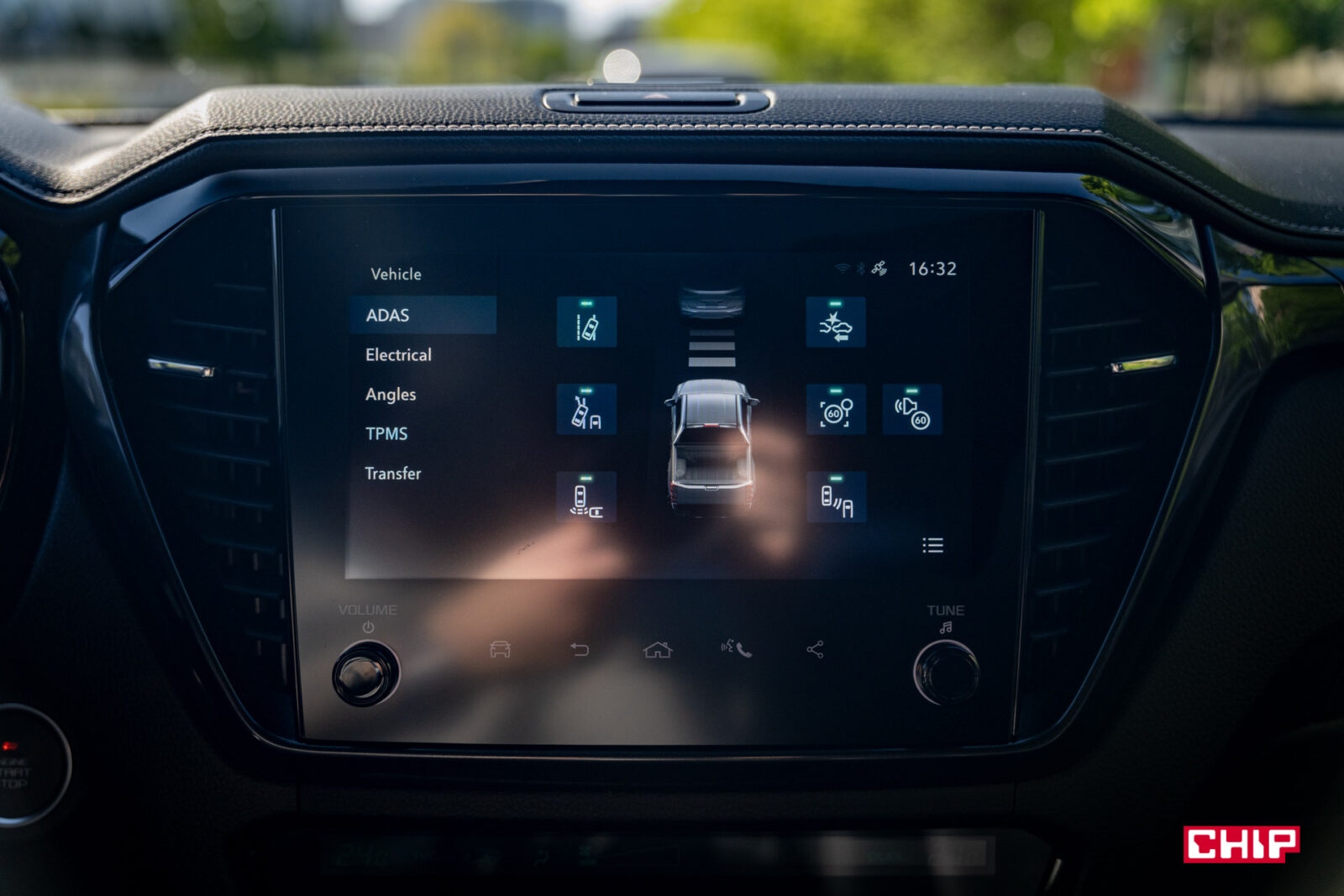 Ekran główny ma przekątną 9 cali i nie grzeszy jakością obrazu, ani jasnością. Nie ma za to problemów z reakcją na dotyk i szybkością działania. W zasadzie jedyną poważniejszą wadą jest tu brak języka polskiego. Interfejs wygląda mocno niewspółcześnie, ale jest prosty i intuicyjny. Duży plus należy się za szybki dostęp do Menu działania asystentów, gdzie w prosty sposób jednym kliknięciem można wyłączyć asystenta prędkości. Inaczej, choćby w terenie gdzie może uznać, że jest ograniczenie do 20 km/h, będzie Wam wyć. W równie prosty sposób, tylko to już przyciskiem przy skrzyni biegów, wyłączamy czujniki parkowania. Oczywiście na miejscu jest obsługa Apple CarPlay i Android Auto, jak najbardziej po kablu.