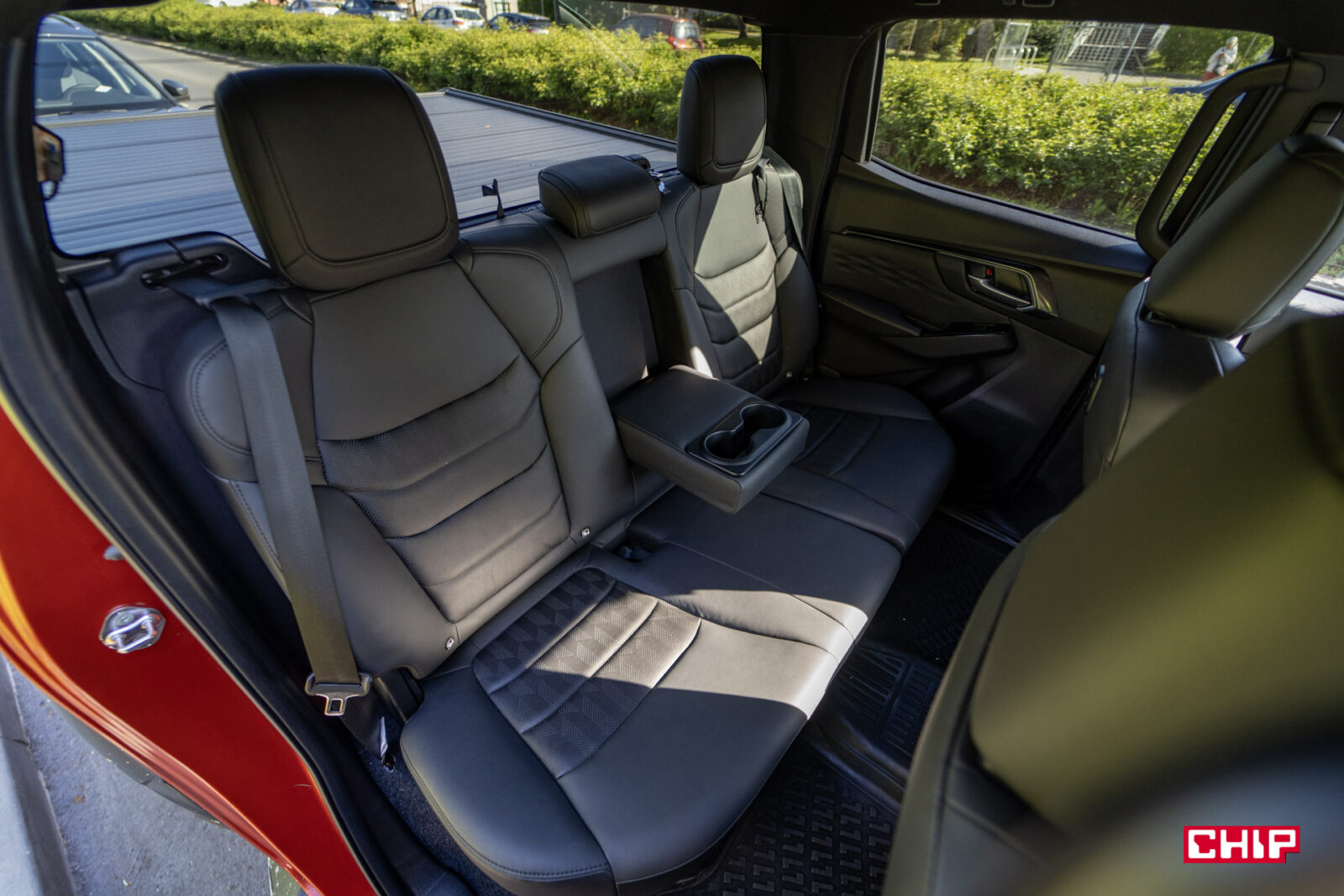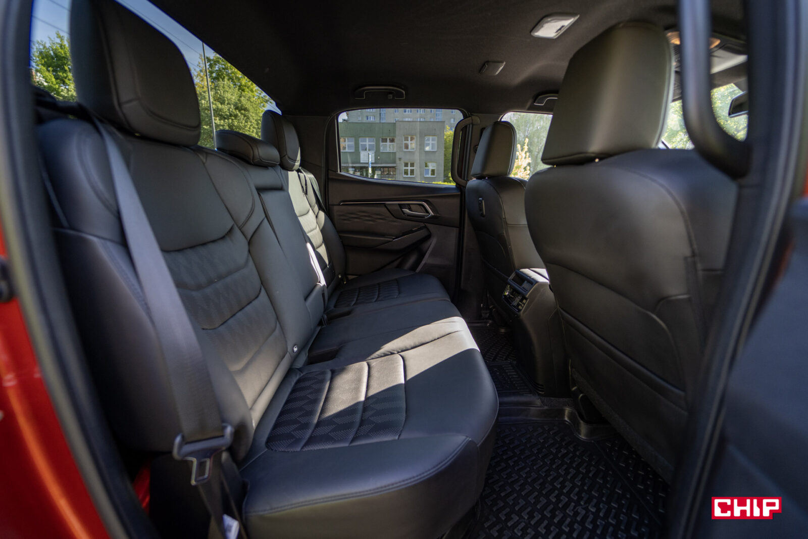 Miejsca z tyłu jest bardzo dużo. Jeśli wrzucimy tam trzy osoby to nie powinny narzekać na przesadny ścisk, natomiast dwie mogą podróżować bardzo komfortowo. O ile podzielą się jednym portem USB-C. Pochwalić trzeba dobre nachylenie oparcia tylnej kanapy, które jest pod tym względem lepiej ustawione niż w Fordach – Rangerze i Bronco. W D-Maxie nie siedzimy aż tak pionowo, co przydaje się w dłuższych trasach.
