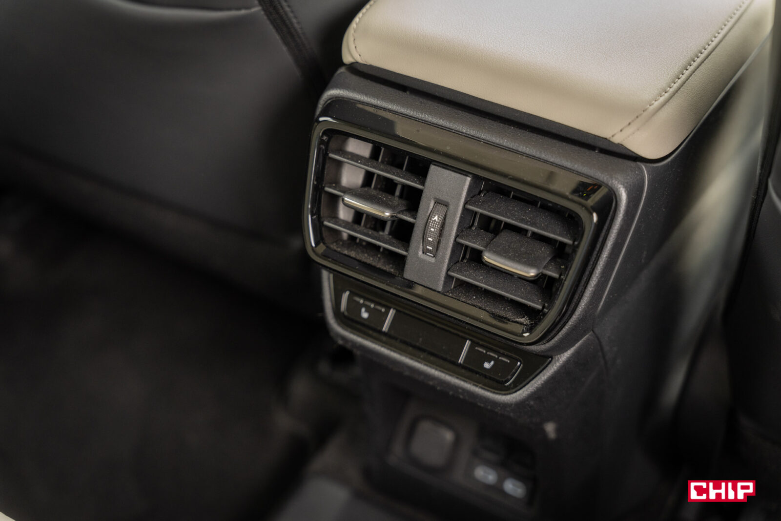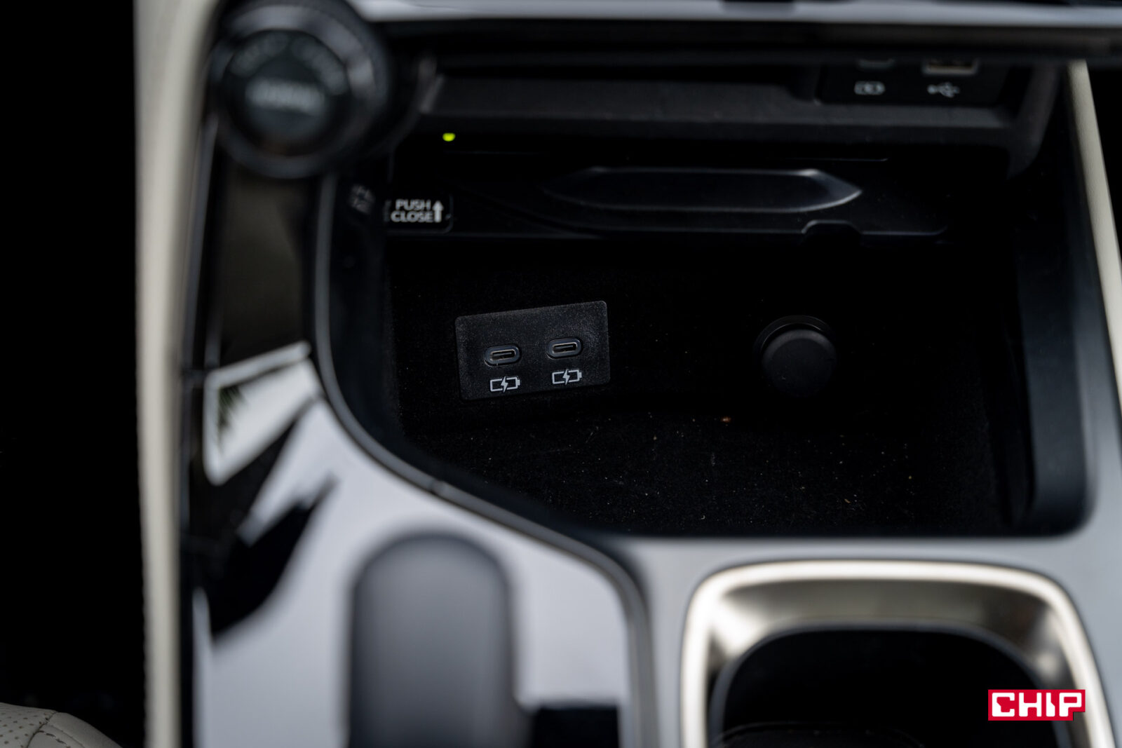 Do dyspozycji mamy zatrzęsienie portów USB, bo są to dwa USB-C z tyłu, USB-C i USB-A z przodu oraz kolejne dwa porty typu C schowane pod ładowarką indukcyjną dla smartfonu. Jest ona przesuwana i pod nią kryje się mały schowek i dwa dodatkowe porty.