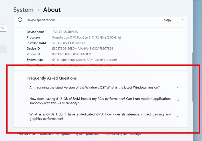 Nowa sekcja FAQ w Ustawieniach > System > Informacje nie była dotychczas powszechnie dostępna. Aby uzyskać do niej natychmiastowy dostęp, wystarczy zapisać się do kanału Windows Insider Dev lub Beta.