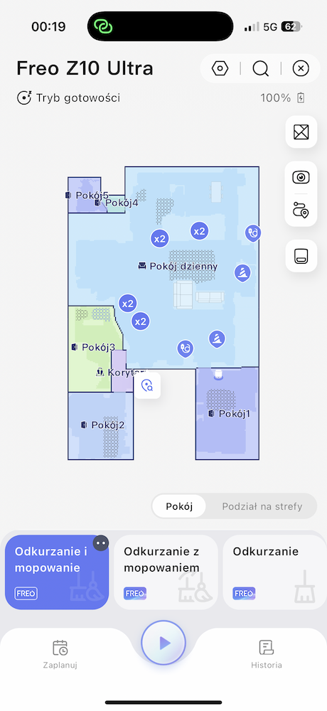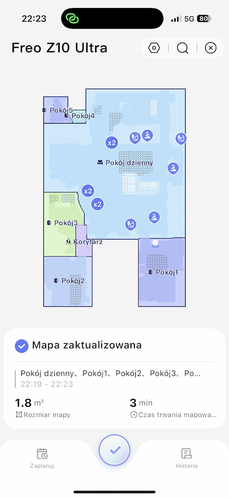 Jeśli odkurzacz odkryje nowe pomieszczenie podczas sprzątania po mapowaniu, to da nam o tym znać na mapie po zakończeniu czyszczenia i będziemy mogli jednym kliknięciem dodać nowe pomieszczenie. Ogólnie całe sterowanie robotem jest intuicyjne dzięki przejrzystemu interfejsowi, który pokazuje status urządzenia i mapę w czasie rzeczywistym. Harmonogramy sprzątania, na przykład codzienne czyszczenie przedpokoju o 18:00, działały bez zarzutu. Do tego w aplikacji mamy podgląd wszystkich informacji, jak poziom czystej i brudnej wody czy detergentu — jedyne co, to z jakiegoś powodu aplikacja twierdziła, że nie zainstalowano worka na kurz, chociaż ten był na miejscu.