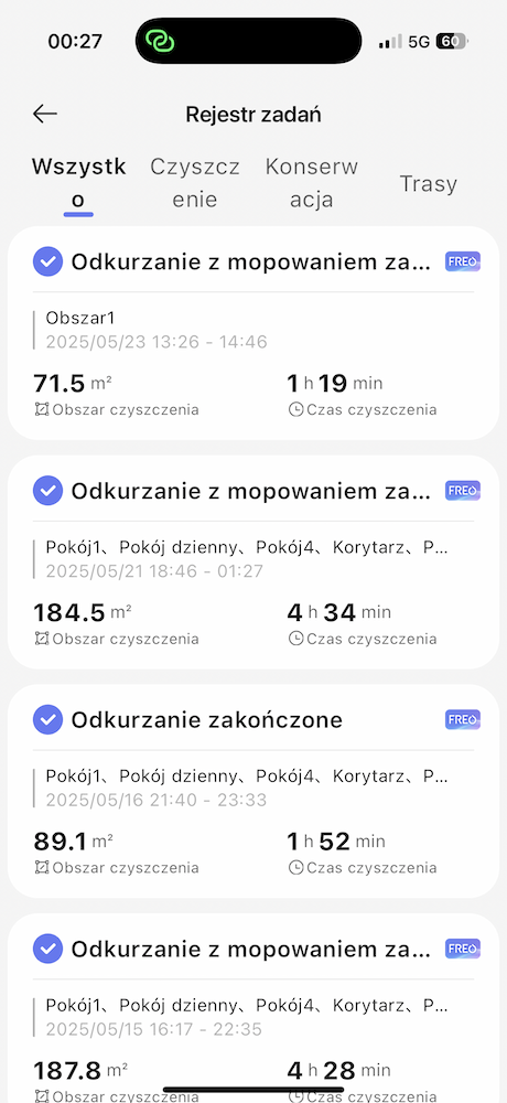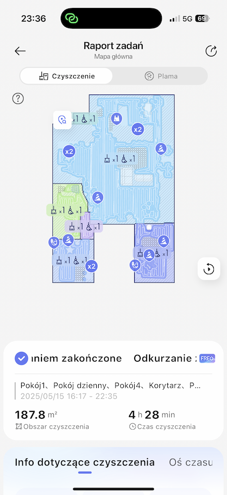 Dla przykładu, Narwal Freo Z10 Ultra w programie Odkurzanie z mopowaniem obszar o średnicy 187,8 metrów kwadratowych wyczyścił w 4 godziny i 28 minut. W tym czasie wykrył 14 przeszkód, 13 razy użył AI DirtSense (czyli mył nakładki) i 6 razy użył trybu krawędziowego. Wyznaczony obszar części salonu 71,5 metra kwadratowego odkurzył z mopowaniem w 1 godzinę i 19 minut, wykrywając w tym czasie 12 przeszkód i raz myjąc nakładki. Tak jak piszę — dla freaków statystyk to prawdziwa gratka.