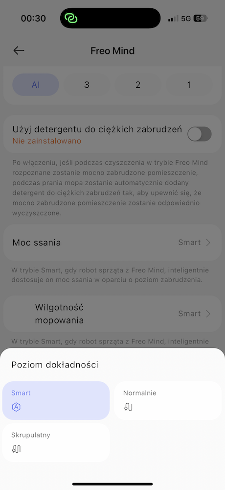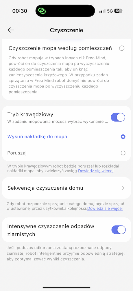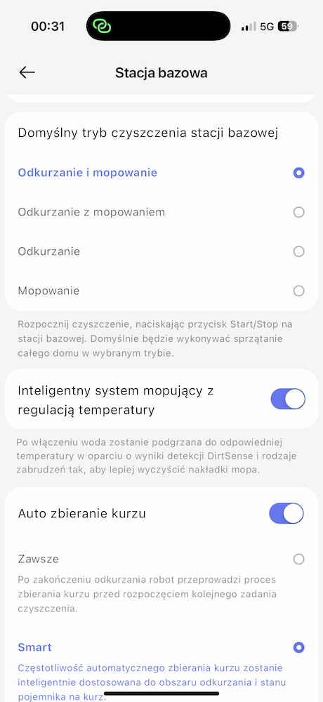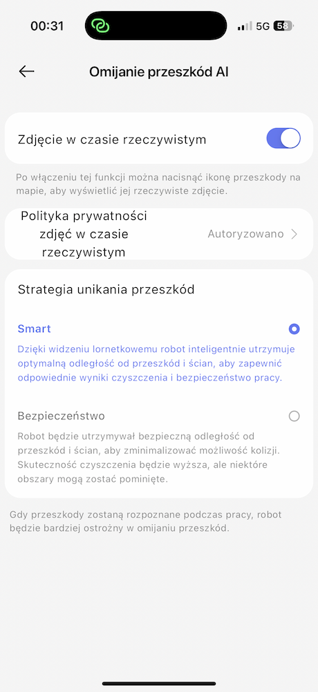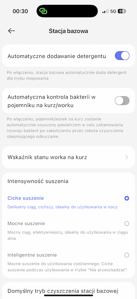 Do tego możemy ustawiać limit ponownego mopowania, moc ssania, wilgotność mopowania, poziom dokładności, automatyczne dodawania detergentu, automatyczną kontrolę bakterii w pojemniku na kurz, intensywność suszenia, tryb czyszczenia stacji bazowej czy włączyć zdjęcia przeszkód w czasie rzeczywistym. W opcjach aplikacji można przepaść na długi czas.