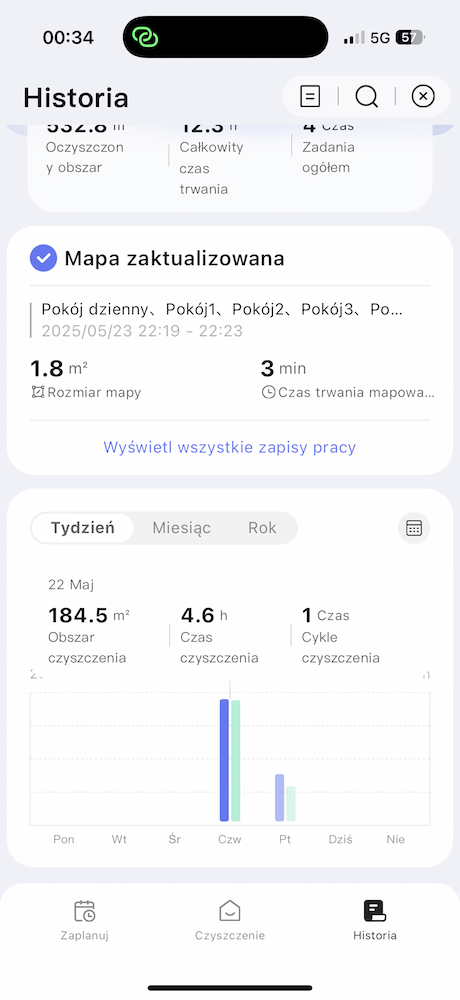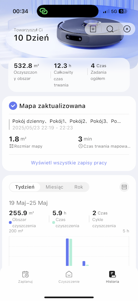 Do tego aplikacja ma świetny profil dla fanów statystyk. Możemy zobaczyć, jaki obszar łącznie zdołał wyczyścić odkurzacz, ile łącznie czasu poświęcił na sprzątanie oraz ile cykli czyszczenia odbył. Są też tygodniowe, miesięczne i roczne statystyki w każdym z tych segmentów i pojawiają się w formie kolorowych wykresów. Jest dostępna też cała historia działań z dokładnymi danymi, a do tego na mapie widać gdzie i jakie odkurzacz znalazł przeszkody, jaką trasę przebył (cieniutkie linie przechodzą przez schemat całej mapy) i w którym pomieszczeniu jakie czynności wykonał. Całość wygląda naprawdę dobrze i dosłownie pozwala wnieść analizę sprzątania mieszkania czy domu na wyższy poziom.