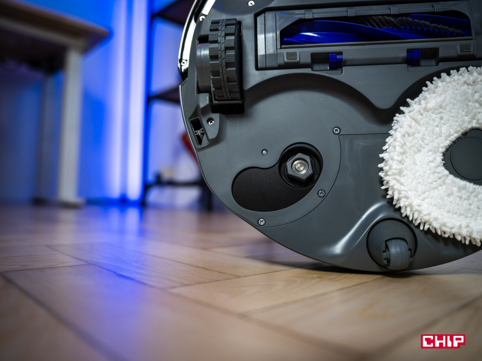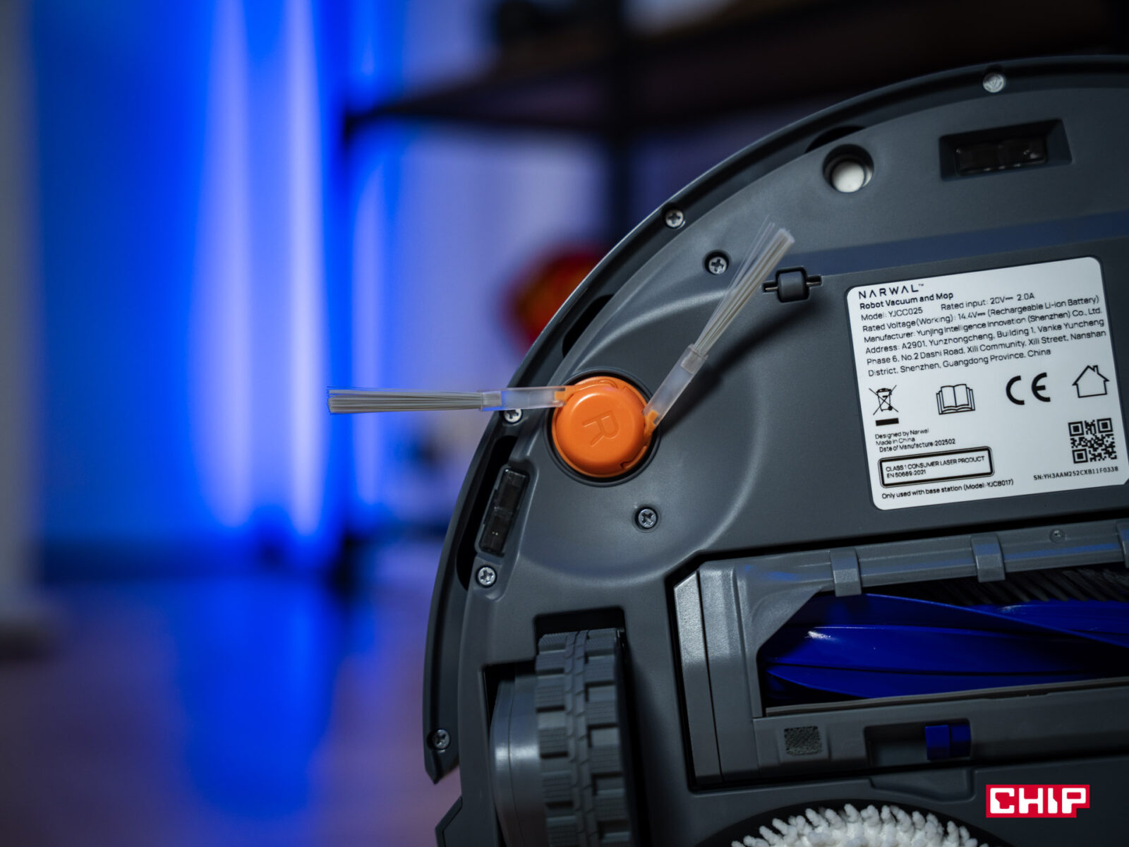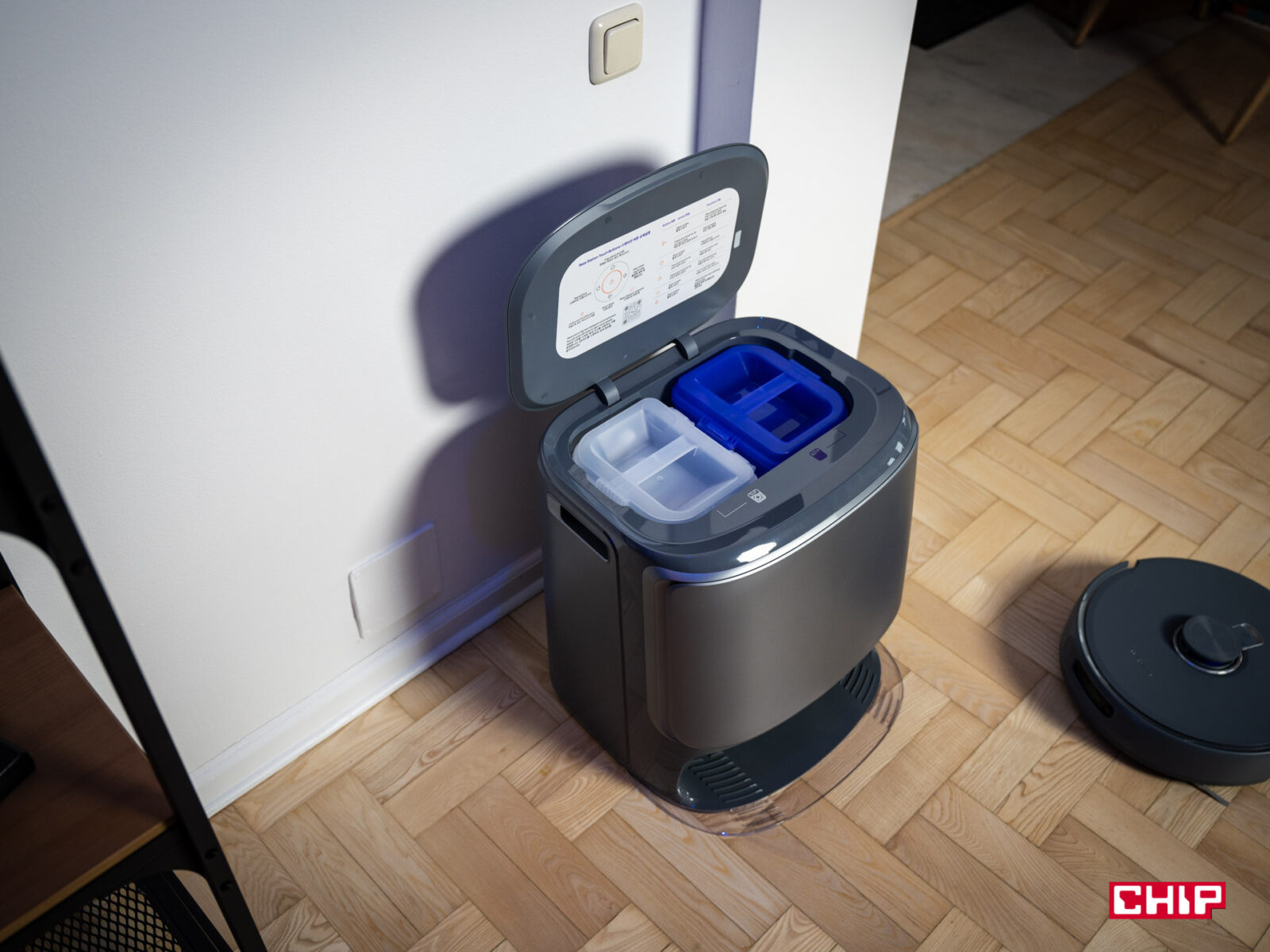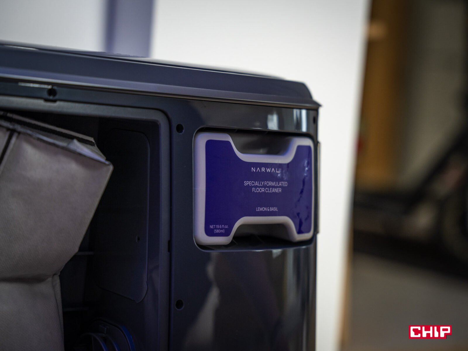- Dozowanie detergentu: stacja miesza detergent z wodą w stałej proporcji, co eliminuje konieczność ręcznego dozowania. Używa do tego dedykowanego pojemnika na detergent (jeden jest w zestawie). W praktyce system działa sprawnie, a podłoga po mopowaniu miała… zaskakująco ładny zapach! Generalnie nie czuć nic i spodziewałem się tego samego po Narwalu — a nawet nabrałem pewnych obaw, bo w zestawie był detergent o zapachu cytryny i bazylii; i na widok tego połączenia zapachowego trochę się skrzywiłem. Finalnie jednak całość naprawdę dobrze pachnie i w biurze unosił się przyjemny zapach.