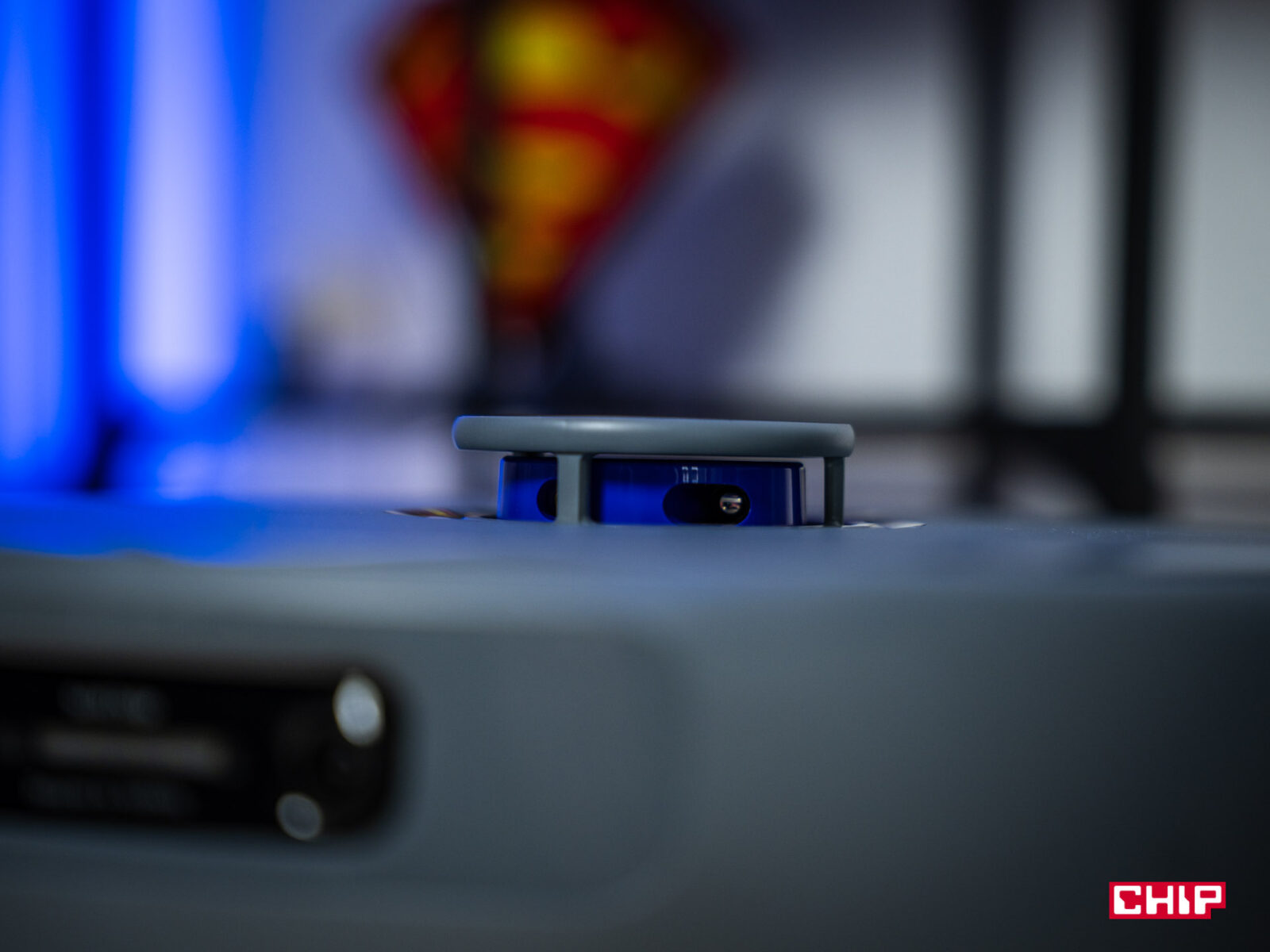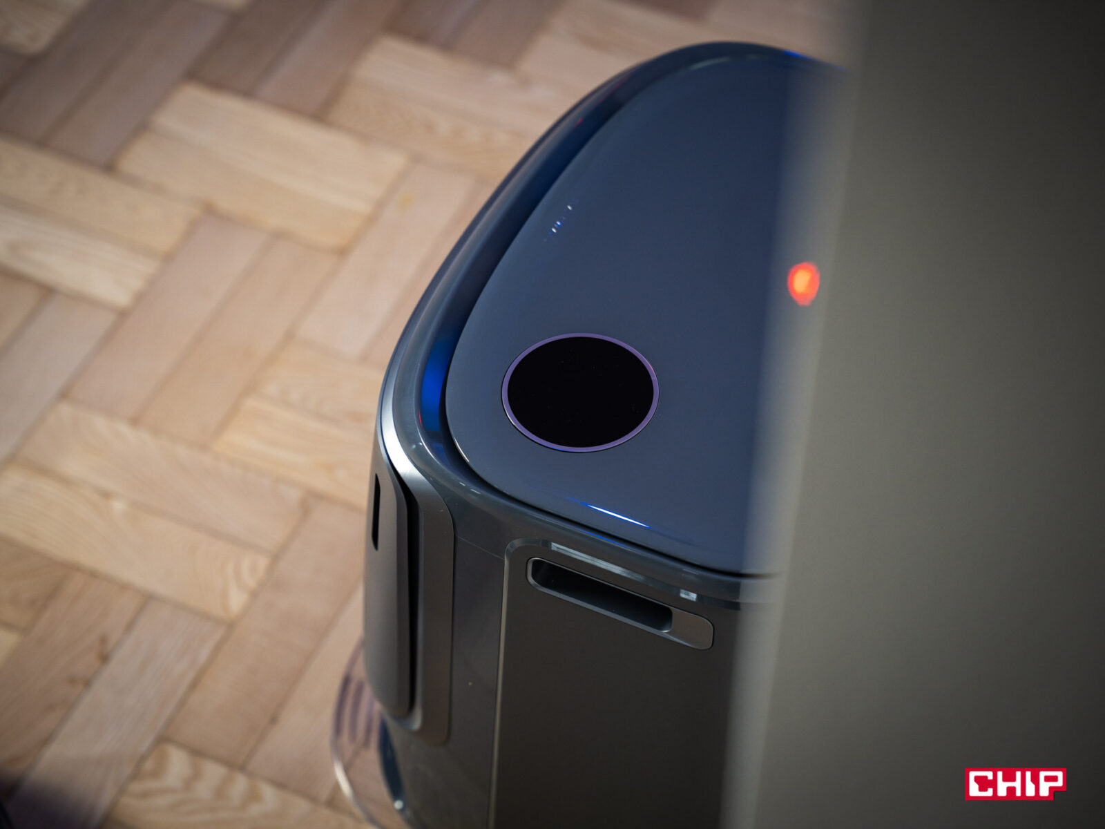 Chciałbym również zwrócić uwagę na design Freo Z10 Ultra. Jest to naprawdę ładny odkurzacz! Sam robot prezentuje się elegancko w szarym kolorze, co uzupełniają połyskowe wstawki oraz fioletowe akcenty (co jest kolorem kojarzonym z Narwalem). Wygląda naprawdę nieźle, a jego wymiary (35,5 cm średnicy, 11,3 cm wysokości) sprawiają, że zmieści się pod większość mebli, choć o tym więcej później. Poziomem elegancji nie odstaje stacja ładująco-opróżniająca. Ta całe szczęście nie jest tak koślawo wysoka, jak to od jakiegoś czasu się zdarza w tej branży, a wygląda naprawdę zgrabnie. Ma taki sam kolor jak odkurzacz, lecz jej obłe kształty dodają jej uroku — a mały, okrągły wyświetlacz na górze po prawej stronie tylko dodaje uroku.