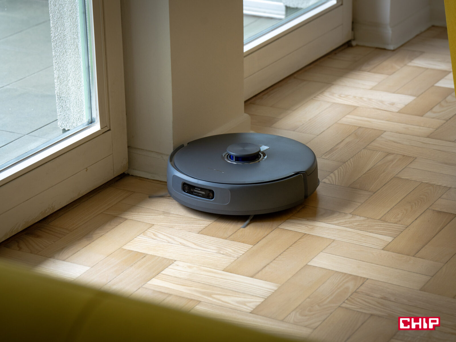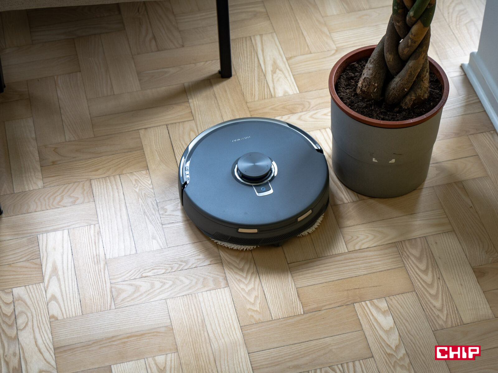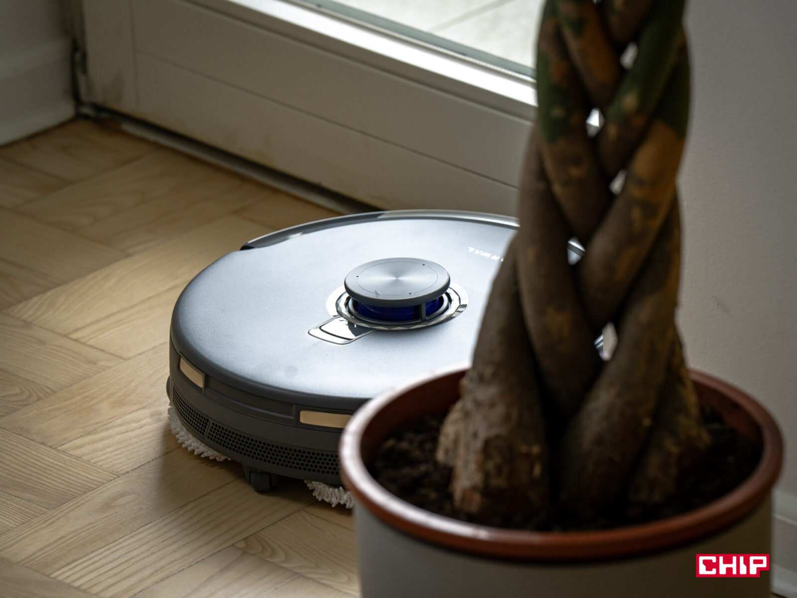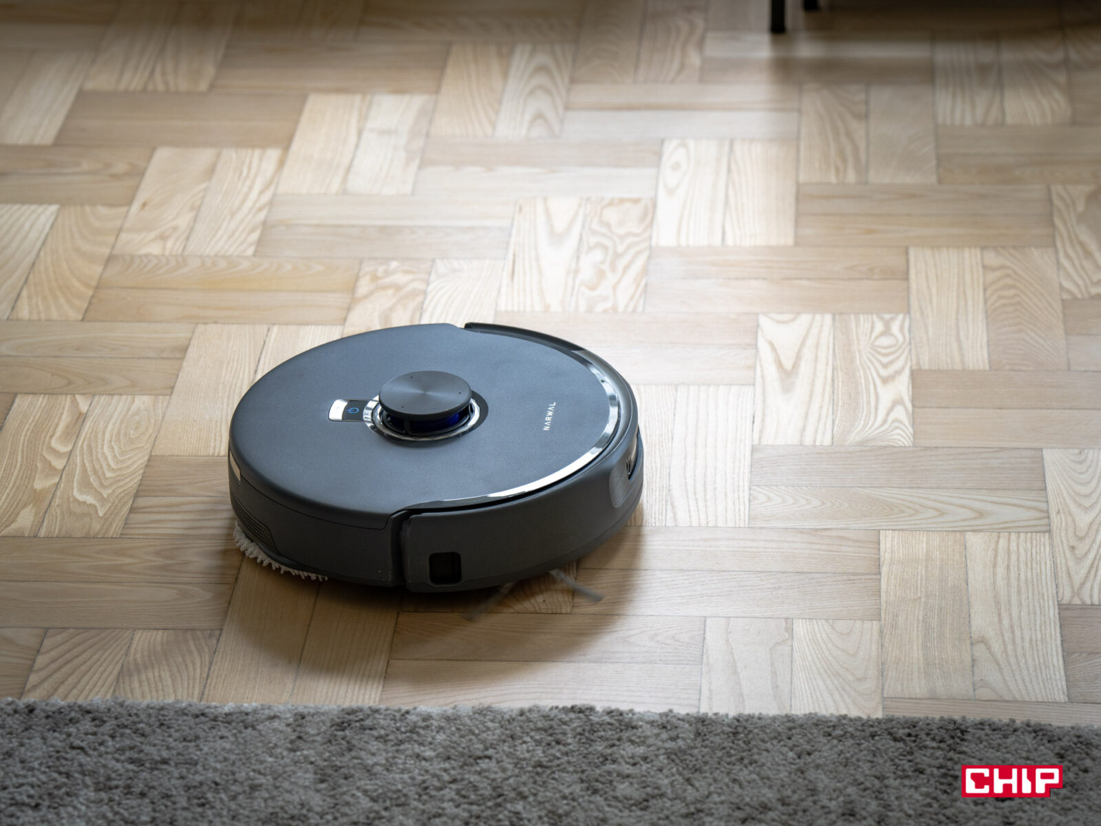 Na dywanach sprawa jest nieco bardziej złożona. Na niskich dywanach (do 1 cm) Narwal działa bez zarzutu, podnosząc mopy o 12 mm, by uniknąć ich zawilgocenia. Jednak jeśli macie wyjątkowo puszyste dywany, to mogą się na nich pojawić minimalne ślady wilgoci po mopowaniu w trybie mieszanym. Robot rozpoznaje powierzchnie i przełącza tryby, ale w przypadku grubszych wykładzin czasem może brakować mu precyzji w dostosowaniu wysokości mopów. W salonie w naszym biurze mamy dość duży dywan i uznałbym go za dość puszysty — były chwilowe wilgotne ślady, ale nic się z nim nie stało. Jeśli chodzi jednak o brud na dywanach, to Narwal nie ma problemu z wciągnięciem paprochów.