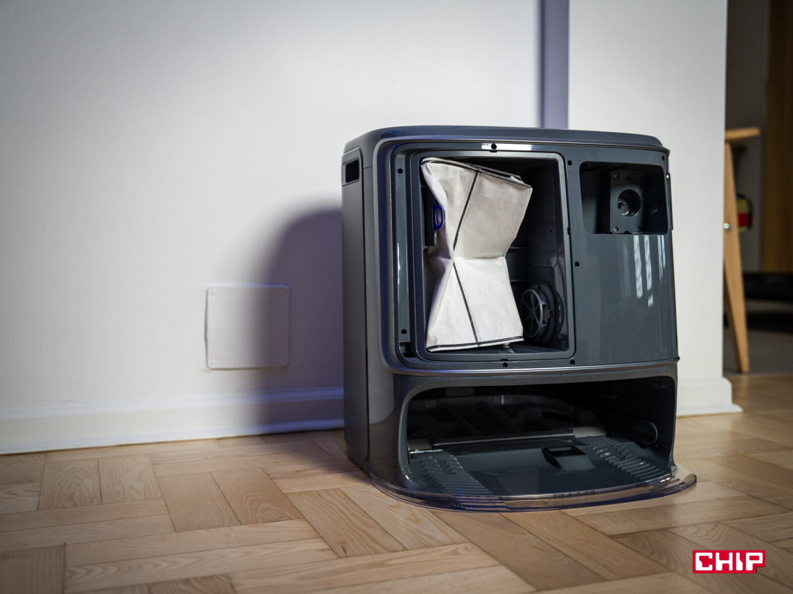 - Opróżnianie zbiornika na kurz: stacja automatycznie zasysa kurz z robota do worka o pojemności 2,5 litra, co według producenta wystarcza na około 120 dni. Worek wymienia się łatwo, a jeden dodatkowy jest w zestawie.