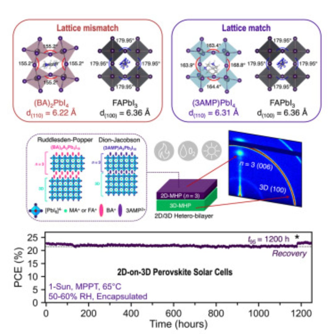 Zespół badaczy z Cornell University opracował właśnie innowacyjną strukturę hybrydową, łączącą warstwy perowskitu dwuwymiarowego (2D) i trójwymiarowego (3D). W tym pomyśle kluczową rolę odgrywa tzw. dopasowanie sieci krystalicznej, które redukuje naprężenia wewnętrzne i poprawia stabilność materiału. Zamiast popularnego kationu metylamoniowego (MA), naukowcy zastosowali formamidynię (FA), a więc większy organiczny kation, który zapewnia trwalszą strukturę krystaliczną, odporną na czynniki zewnętrzne.
