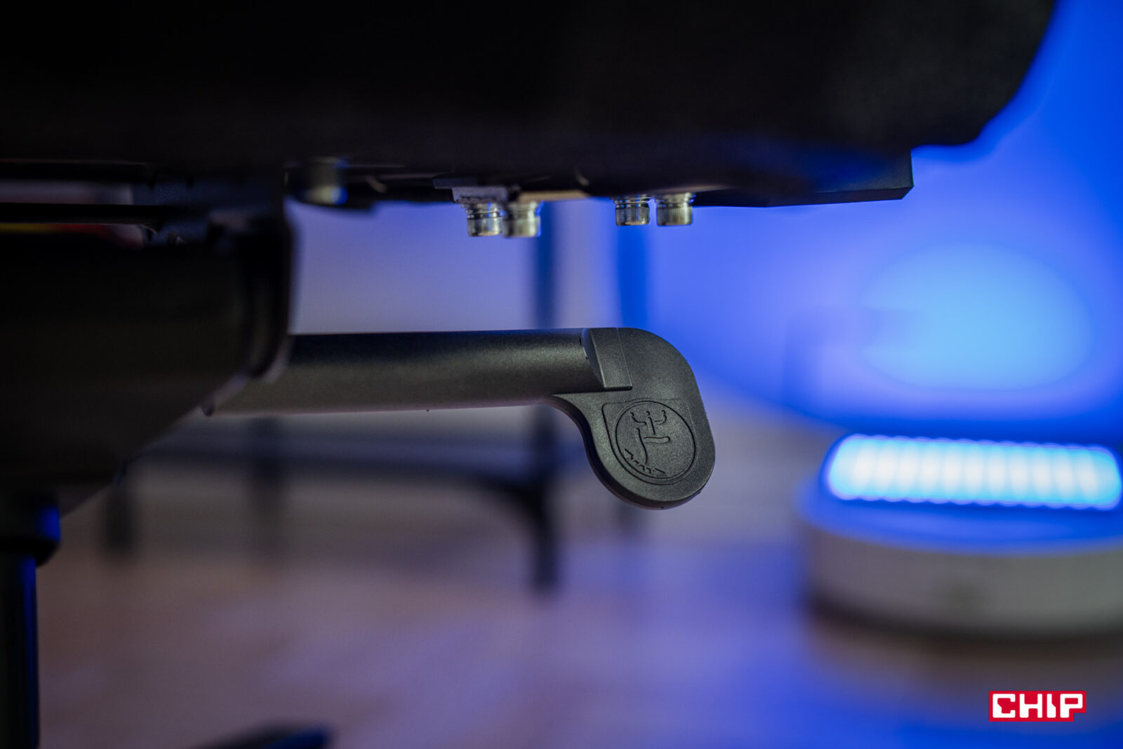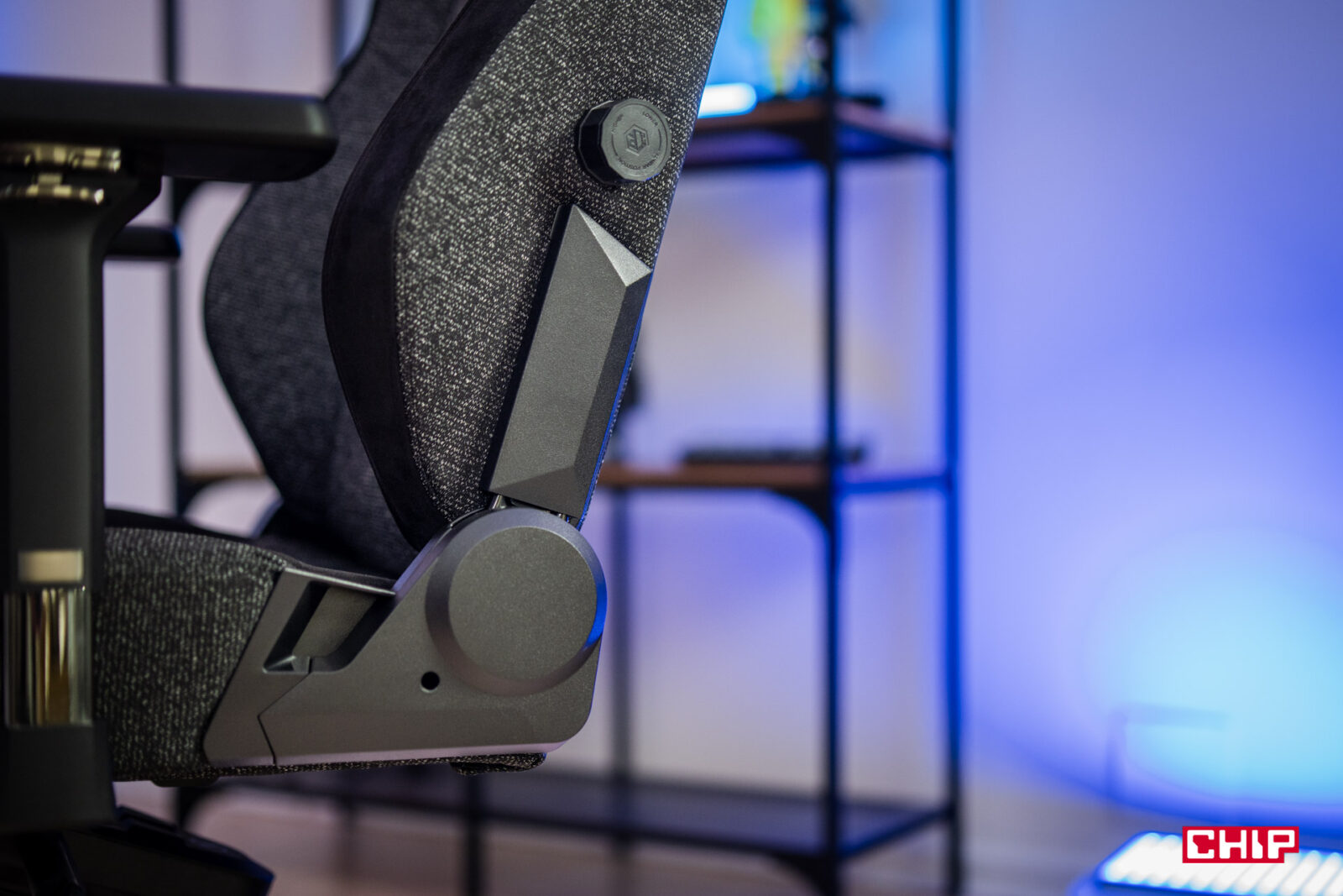 A skoro już o tym mowa — oparcie fotela to kolejny mocny punkt. Możliwość regulacji w czterech pozycjach — od niemal pionowej do niemal leżącej — pozwala dostosować kąt do aktualnych potrzeb. Podczas pracy, naturalnie, warto wybrać bardziej wyprostowaną pozycję, w grze lekkie odchylenie zapewni wygodę (chyba, że akurat przegrywamy mecz w EAFC 25 i jest końcówka drugiej połowy albo musimy nadgonić wynik w Valorancie — wtedy, wiadomo, trzeba przybrać bardziej agresywną pozę i mieć oczy jak najbliżej monitora/telewizora), a przy odpoczynku można całkowicie rozłożyć oparcie. Mechanizm oporu oparcia można dostosować do wagi i preferencji użytkownika za pomocą pokrętła pod siedziskiem — kilka obrotów wystarczy, by znaleźć odpowiednie ustawienie.