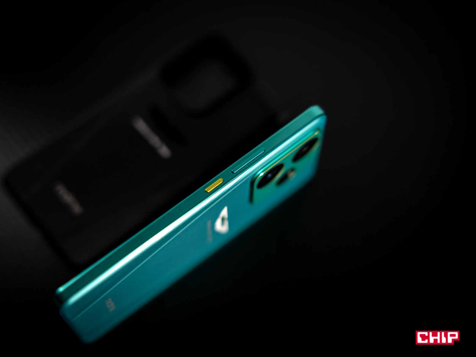 Zostaje jeszcze sam smartfon realme GT7 Dream Edition. Jak nie jestem fanem zieleni, tak tutaj ma ona bardzo ciekawy odcień i to może się podobać. Na tylnym panelu mamy logo Astona Martina i po założeniu etui jest widoczne w przygotowanym otworze.
