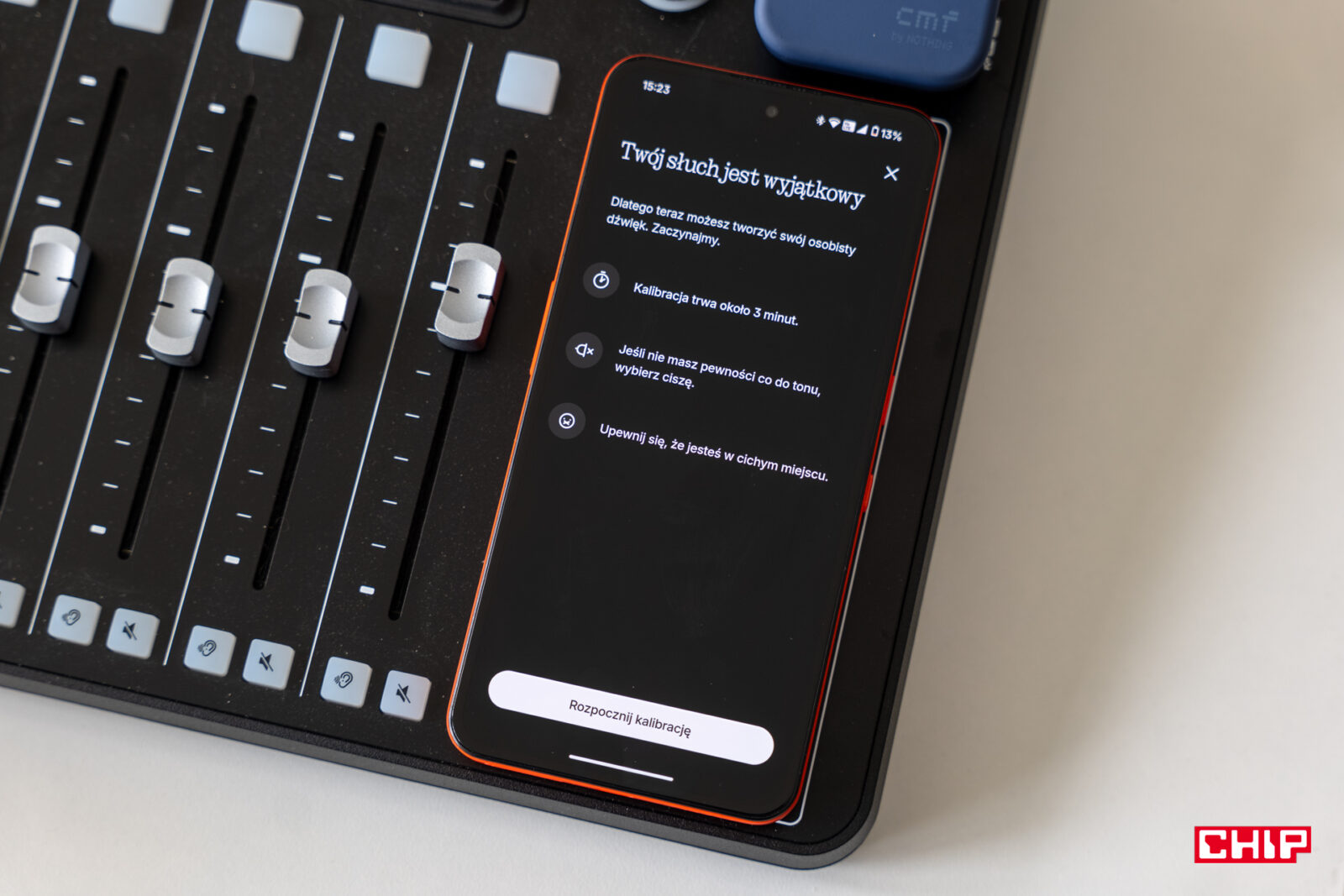 Zarówno na smartfonach z Androidem, jak i tych z iOS, pobierzemy i skorzystamy z aplikacji Nothing X. To aplikacja zarówno do obsługi słuchawek Nothing. jak i tych od CMF. I choć na pierwszy rzut oka nie różni się od innych tego typu rozwiązań, to tak naprawdę… faktycznie się od nich nie różni. To nie znaczy, że nie jest ciekawa, bo stawia na inny projekt wizualny – dopasowany do tożsamości marki, z intensywnymi akcentami kolorystycznymi, świeża. Możliwe, że nawet nie zauważycie, kiedy pojawi się na waszym telefonie, bo słuchawki możemy sparować w ramach Google Fast Pair i nie miałem z tym problemu na żadnym z telefonów z Androidem.