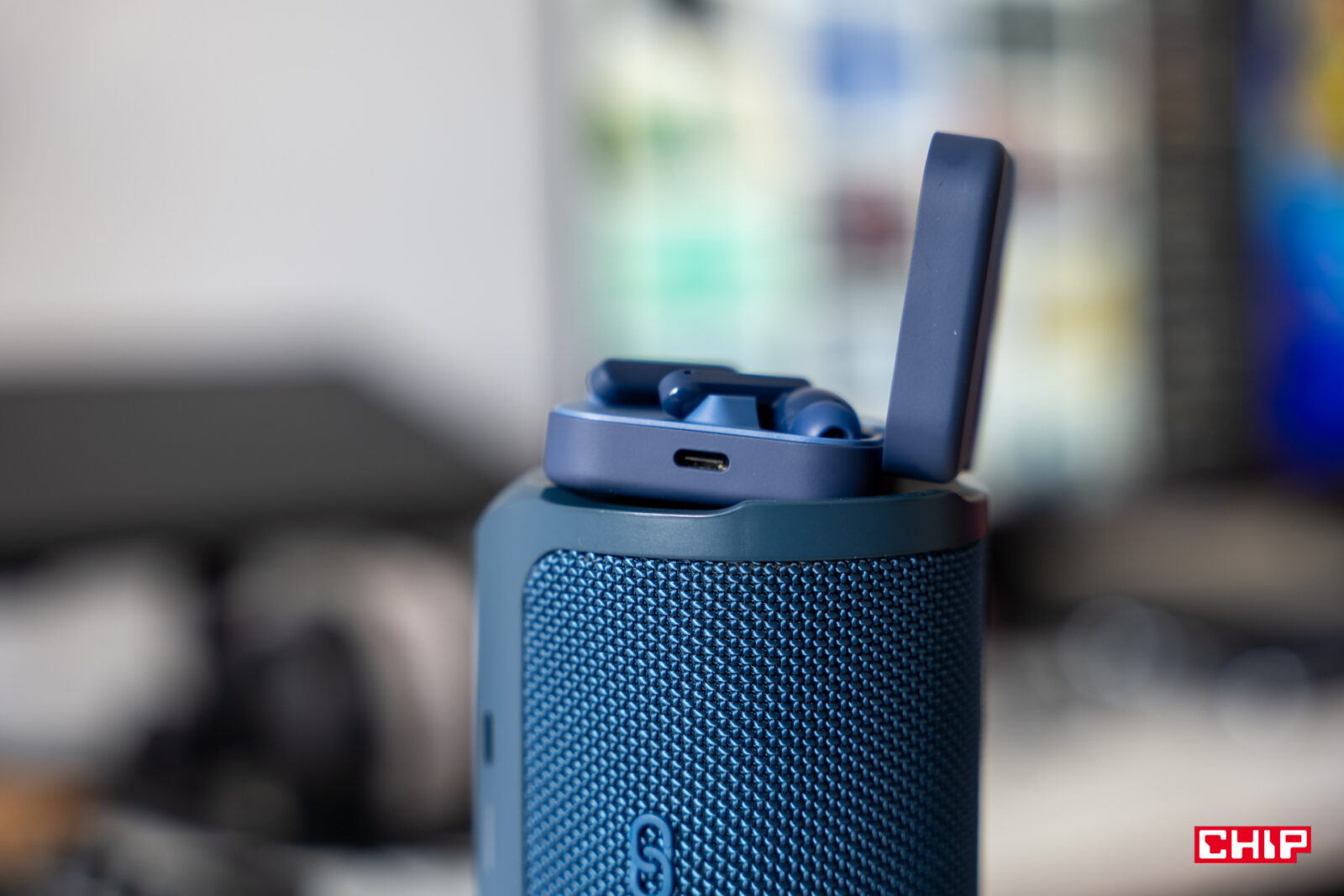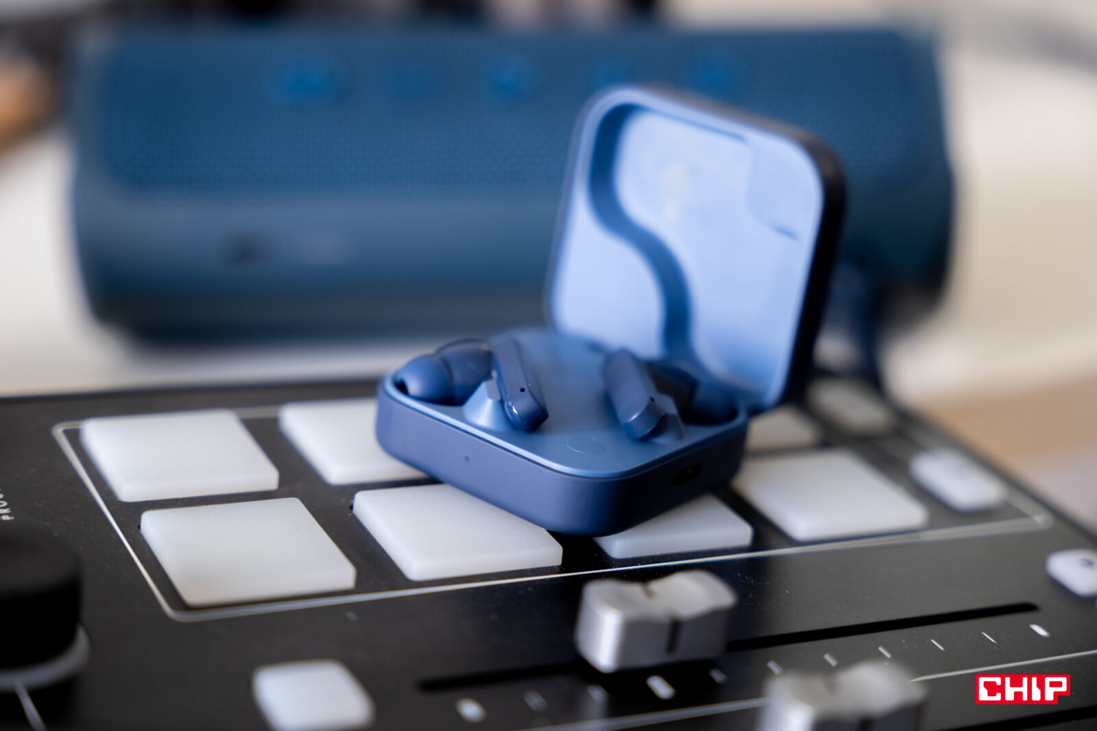 Wracając jednak do konkretów: pokrętło wykonano z metalu, z którego lakier już w niewielkim stopniu odprysnął. Z kolei pudełeczko to tworzywo o miękkim, gumowanym finiszu. Plusem jest to, że przyjemnie trzyma się je w dłoni, minusem – skłonność do gromadzenia śladów po odciskach palców. Co by jednak nie mówić, etui wypada solidnie, nie zgromadziło widocznych rys, a do tego jego magnes silnie zamyka pokrywę. Na jednej ze ścianek znajdziemy port ładowania USB-C, a na drugiej, frontowej – diodę podświetlającą się na biało (parowanie słuchawek) lub czerwono (ładowanie). W środku przycisk do parowania, dyskretnie wkomponowany w obudowę.