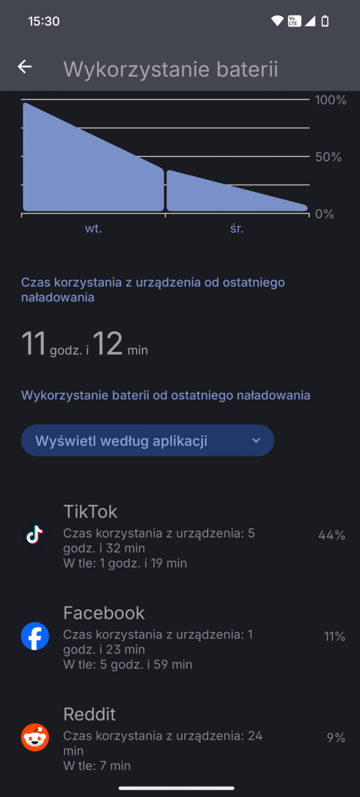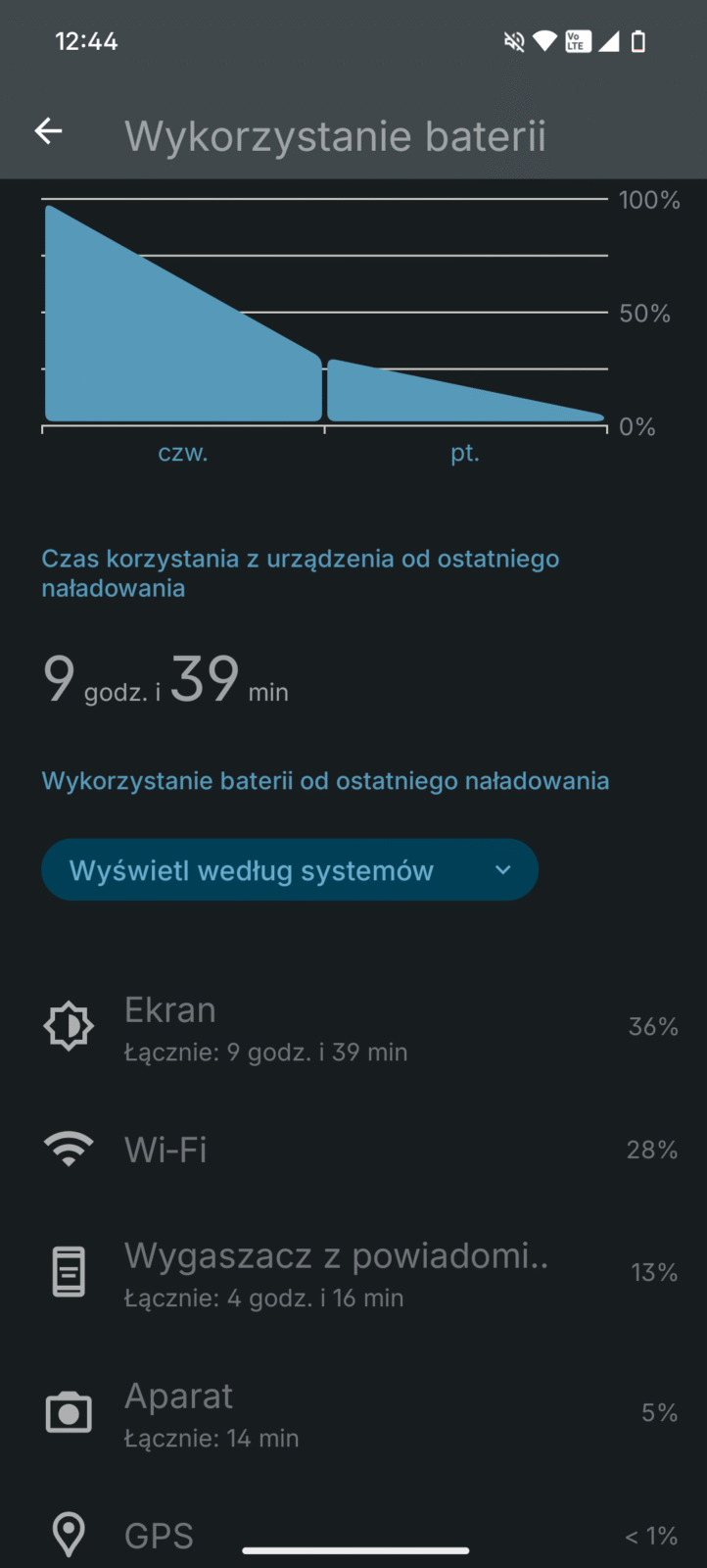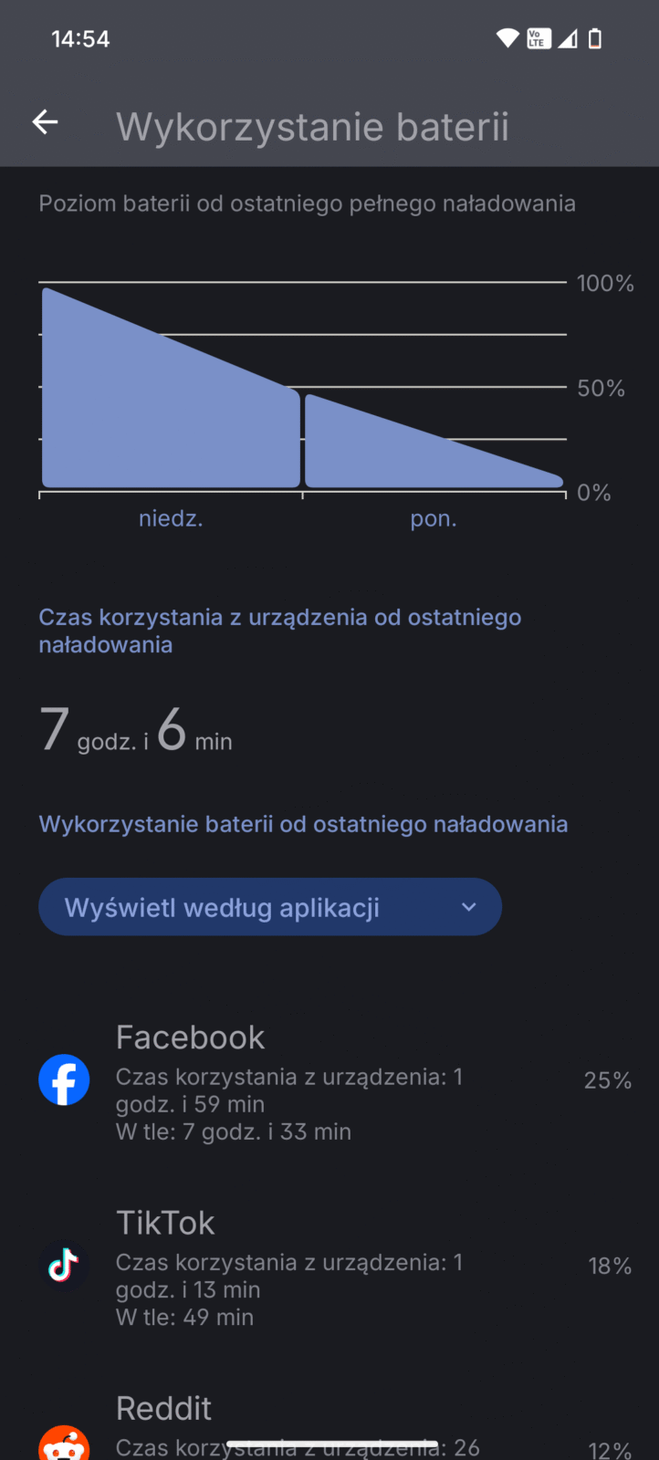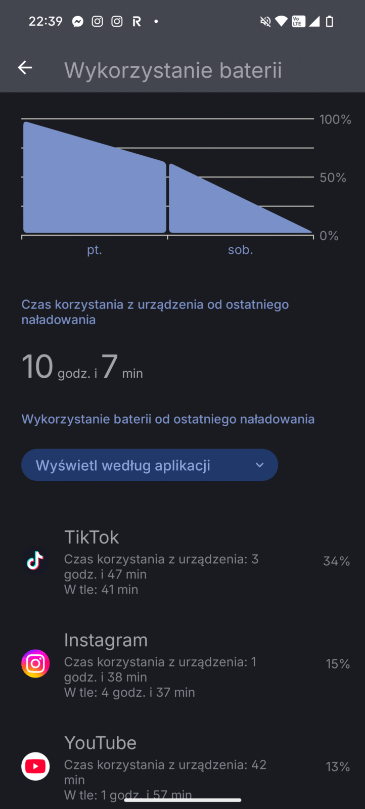 W tych czasach 5000 mAh nie robi już na nikim wrażenia, ale dobrze, że CMF Phone 2 Pro nie ma mniejszego ogniwa. Producent zrobił wszystko, by czasy pracy na jednym ładowaniu były możliwie jak najlepsze i czasem przybiera to mroczną stronę. Część aplikacji wyrzuca się z aktywnych procesów niemal chwilę po tym, jak je wyłączymy, co czasem każe je odświeżać. Stąd rezultaty pokroju 7 do nawet 10 godzin czasu pracy na jednym ładowaniu. Bez problemu uzyskamy dwa dni użytkowania, jeśli nie przewijamy wyłącznie TikToka. Jeżeli jednak jesteśmy użytkownikami wyłącznie LTE/5G i korzystamy z telefonu wyłącznie do mediów społecznościowych, rozładujemy go późnym wieczorem.