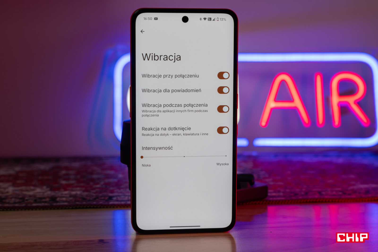 Producent nie dał nam ustawień korektora graficznego, więc dźwięk bez aplikacji zewnętrznych pozostanie takim, jaki jest. Więcej opcji doczekały się wibracje. Jak na tę cenę silnik wibracji jest wyjątkowo przyjemny. Nie mogę się przyczepić ani do ich siły, ani do ich głośności. Dodatkowo otrzymujemy trzy stopnie regulacji mocy sygnałów haptycznych i wybór, w których momentach interakcji z systemem te mają się pojawić.