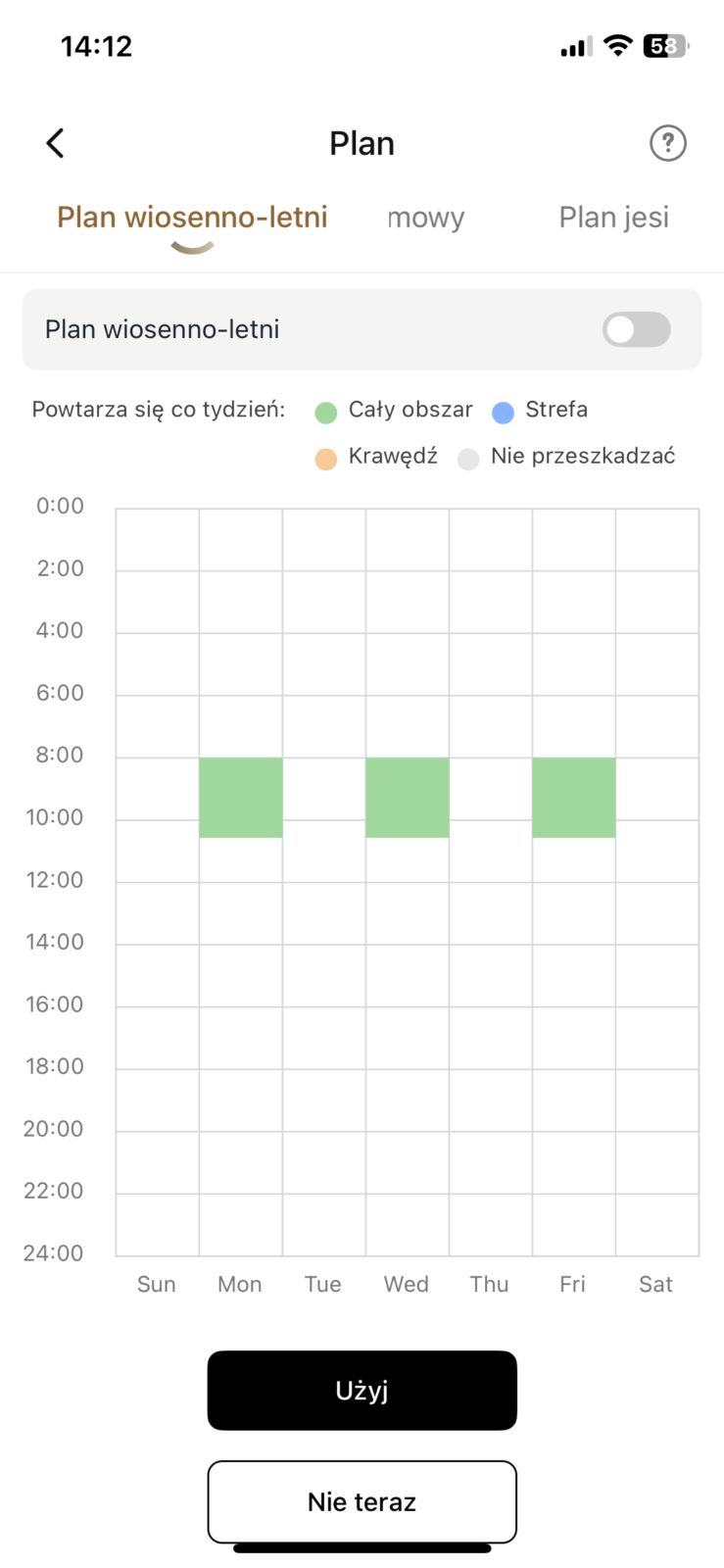 Harmonogramy można układać dokładnie: od konkretnych dni i godzin po sezonowe scenariusze, a tryby pracy obejmują pełne koszenie, same krawędzie, wybrane strefy czy punktowe „wyjadanie” fragmentu trawnika; dla purystów jest też sterowanie ręczne. W aplikacji regulujemy wysokość noży (2–6 cm), przełączamy wydajność i czułość omijania przeszkód, a wirtualne granice No-Go oraz opcja Dual-Map ułatwiają obsługę dwóch osobnych trawników. Ciekawostką są wzory koszenia, choć w praktyce to raczej gadżet niż kluczowa funkcja.