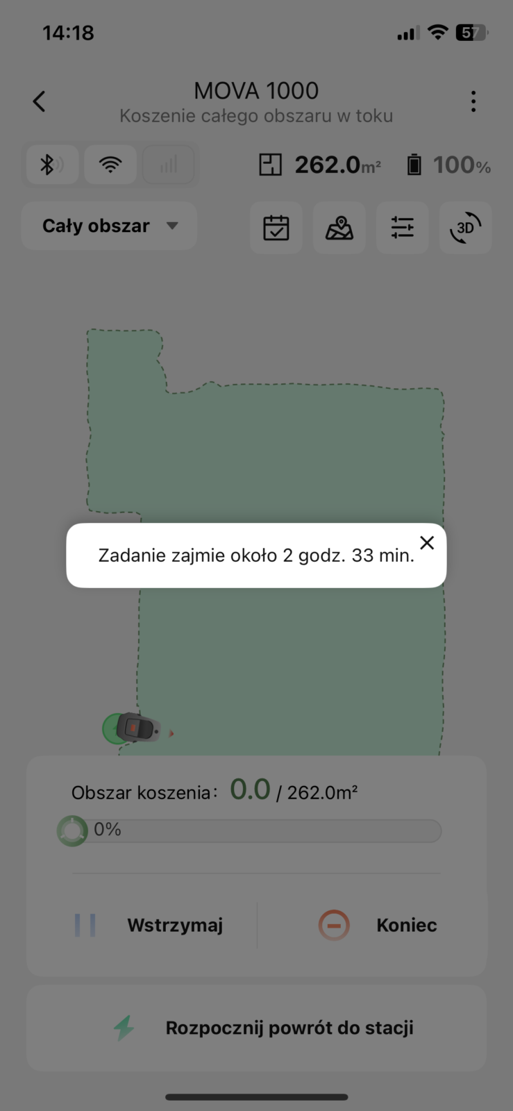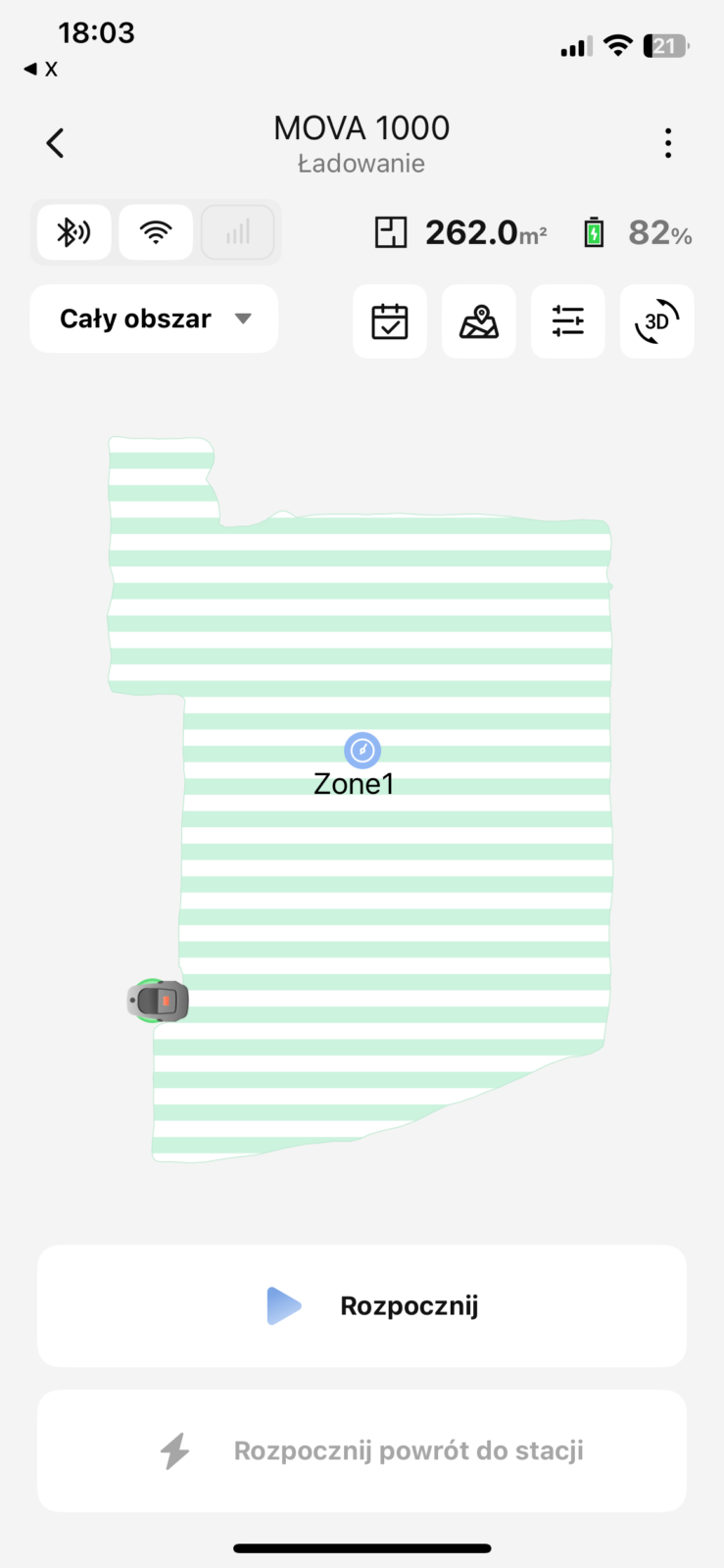 Aplikacja MOVAHome, bliźniacza z dobrze już dopracowanym DreameHome, okazuje się wygodnym panelem sterowania w języku polskim, choć po pierwszym uruchomieniu wymaga chwili na wczytanie i kalibrację mapy terenu. Na głównym ekranie widać na żywo 2D- lub 3D-mapę ogrodu i aktualną pozycję robota, a zdalne przyciski start/pauza i „wróć do bazy” działają bez zauważalnych opóźnień.